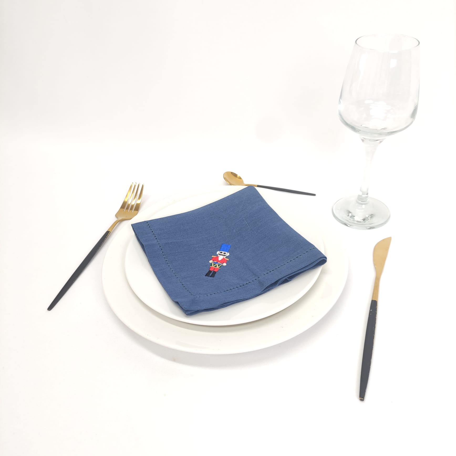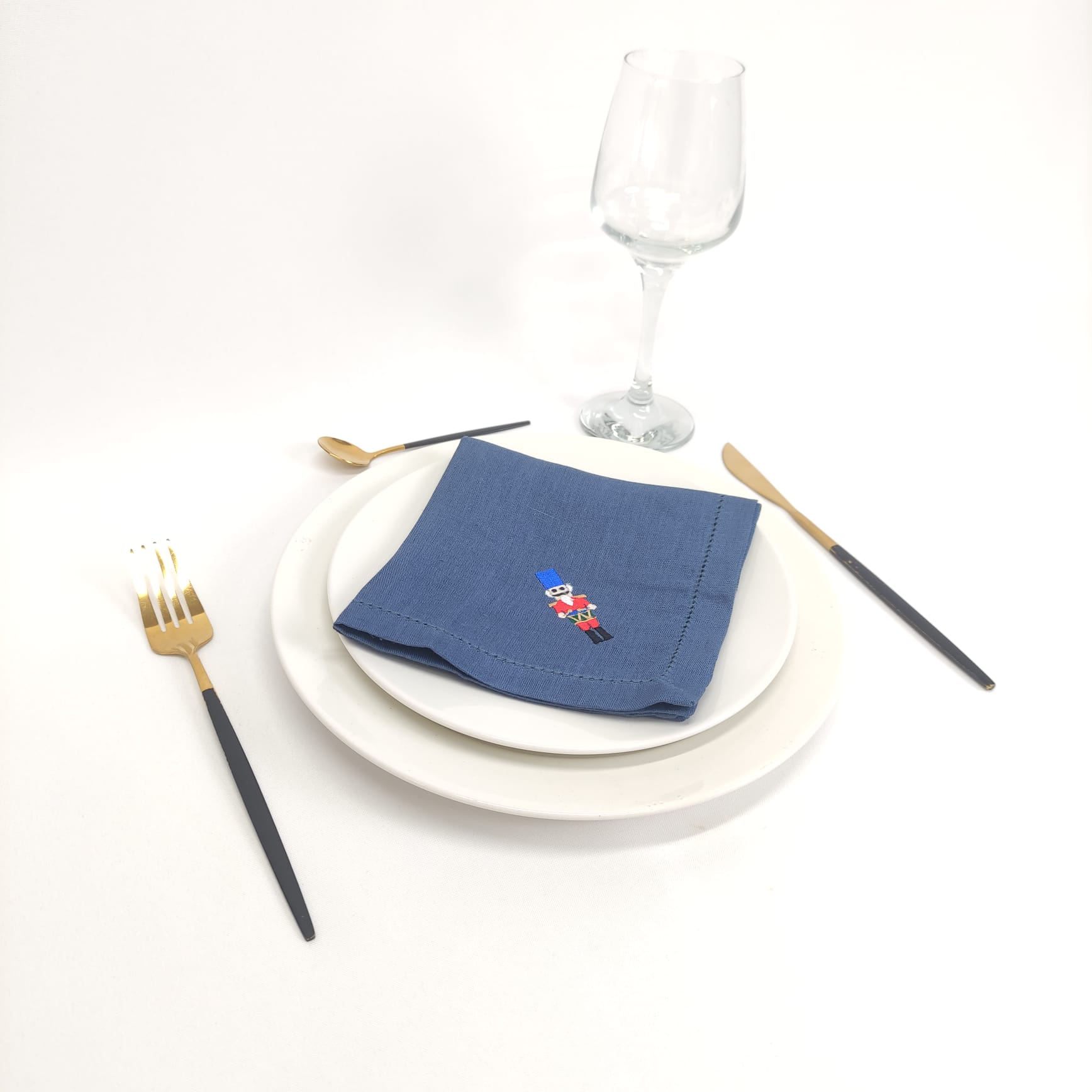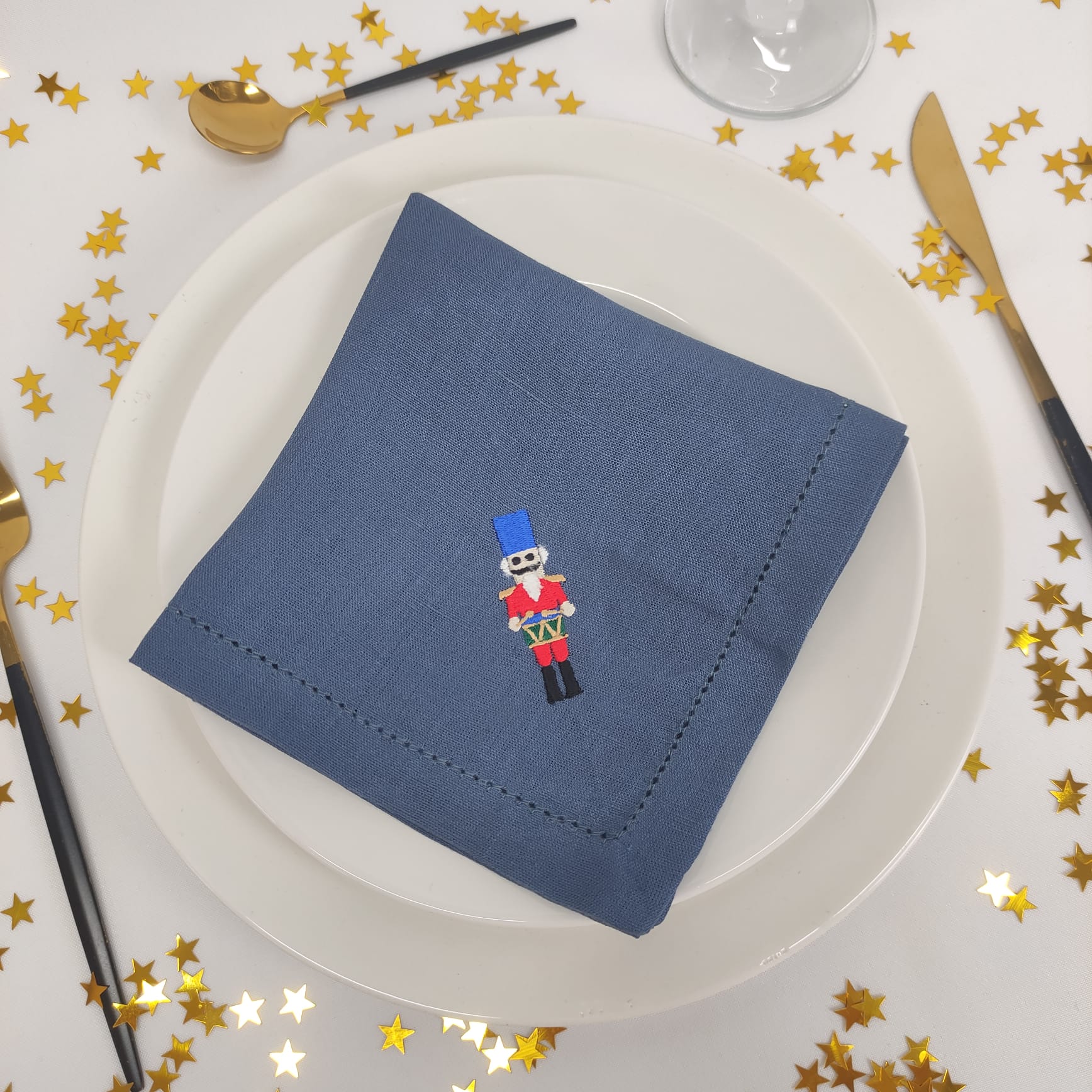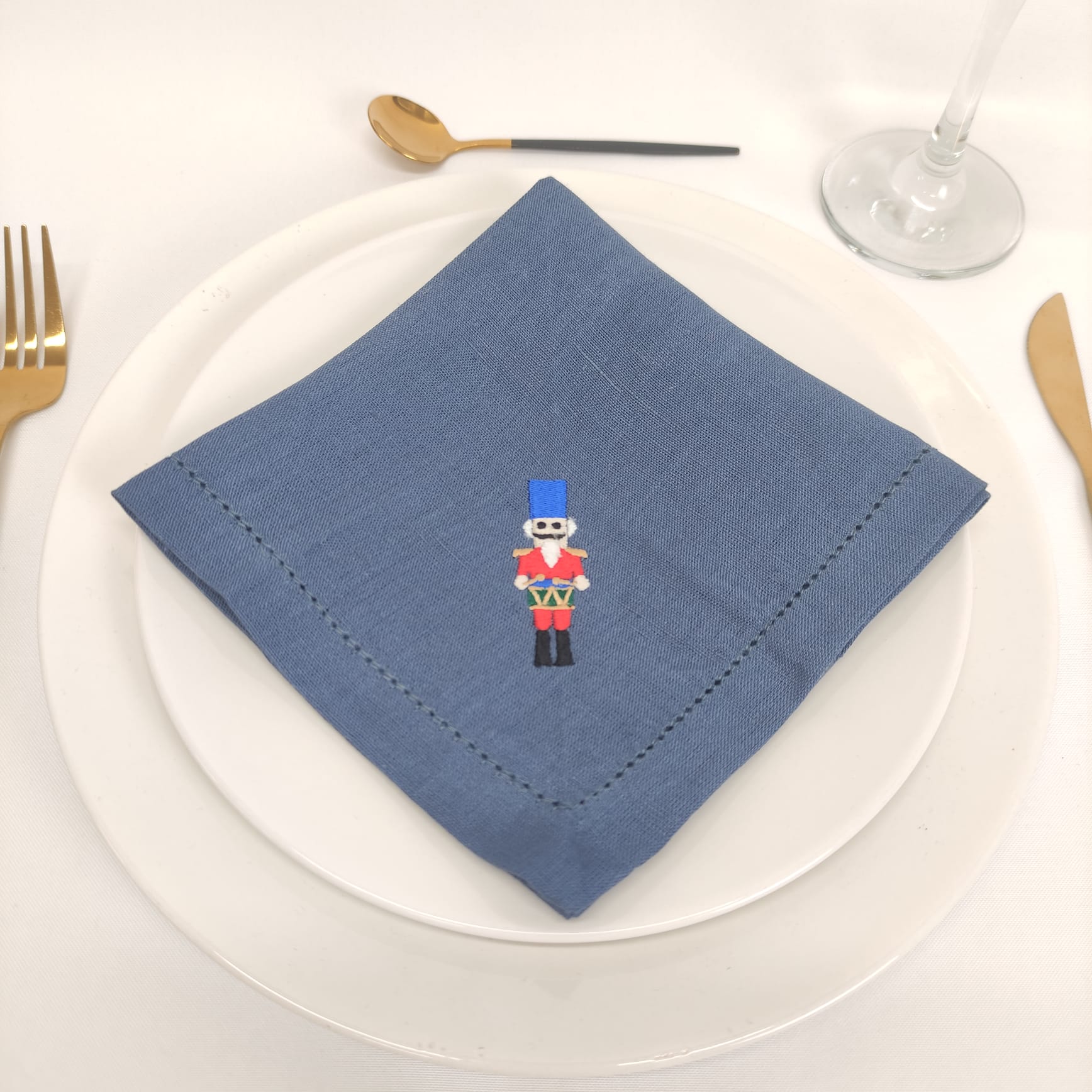 Guardanapo em linho azul com bordado natalício.