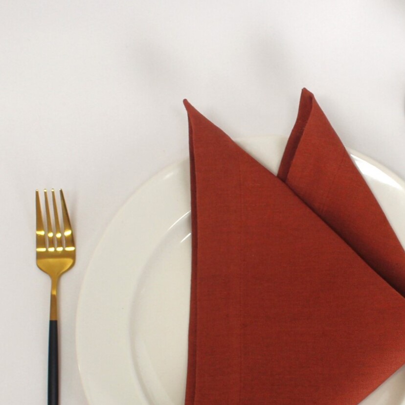 Guardanapo em linho em cor terracota . Disponivel em bainha inglesa, ponto aberto e rolinho á cor do linho.