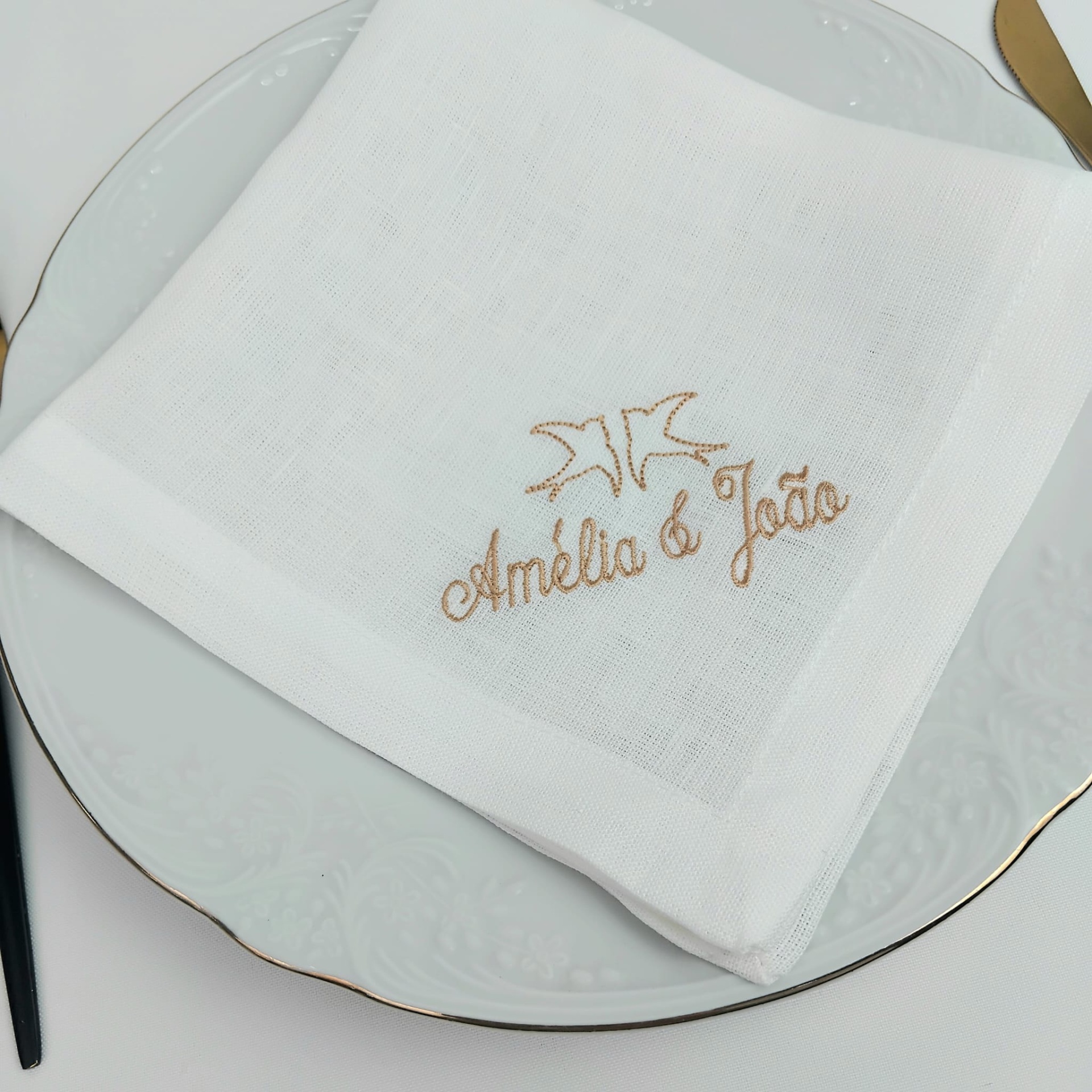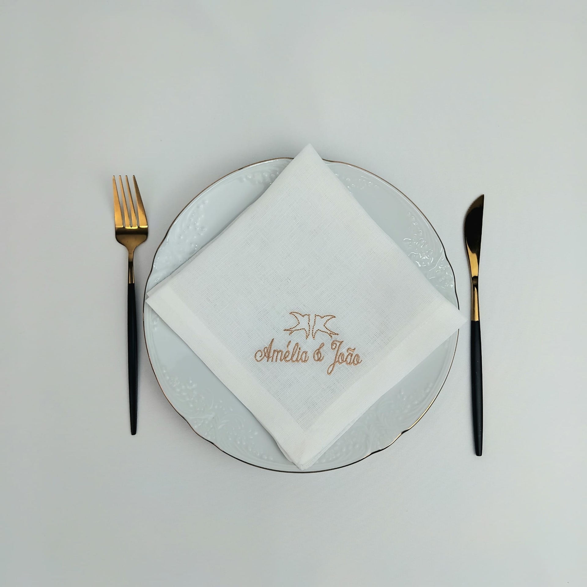 Guardanapo linho branco com acabamento em bainha inglesa, disponivel para bordar os nomes que quiser.