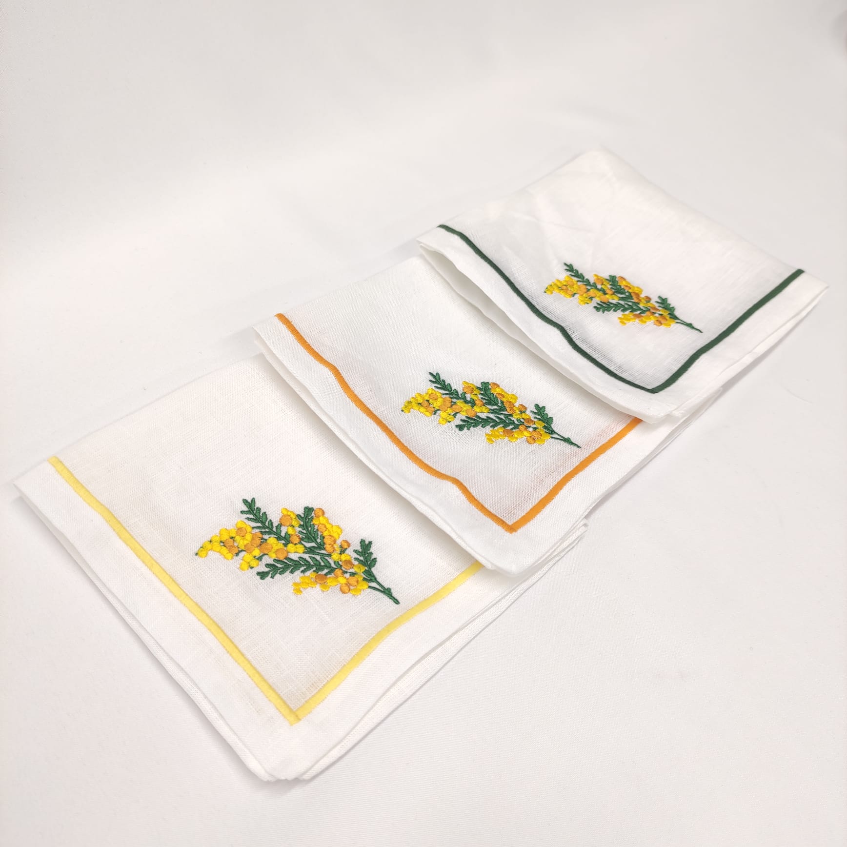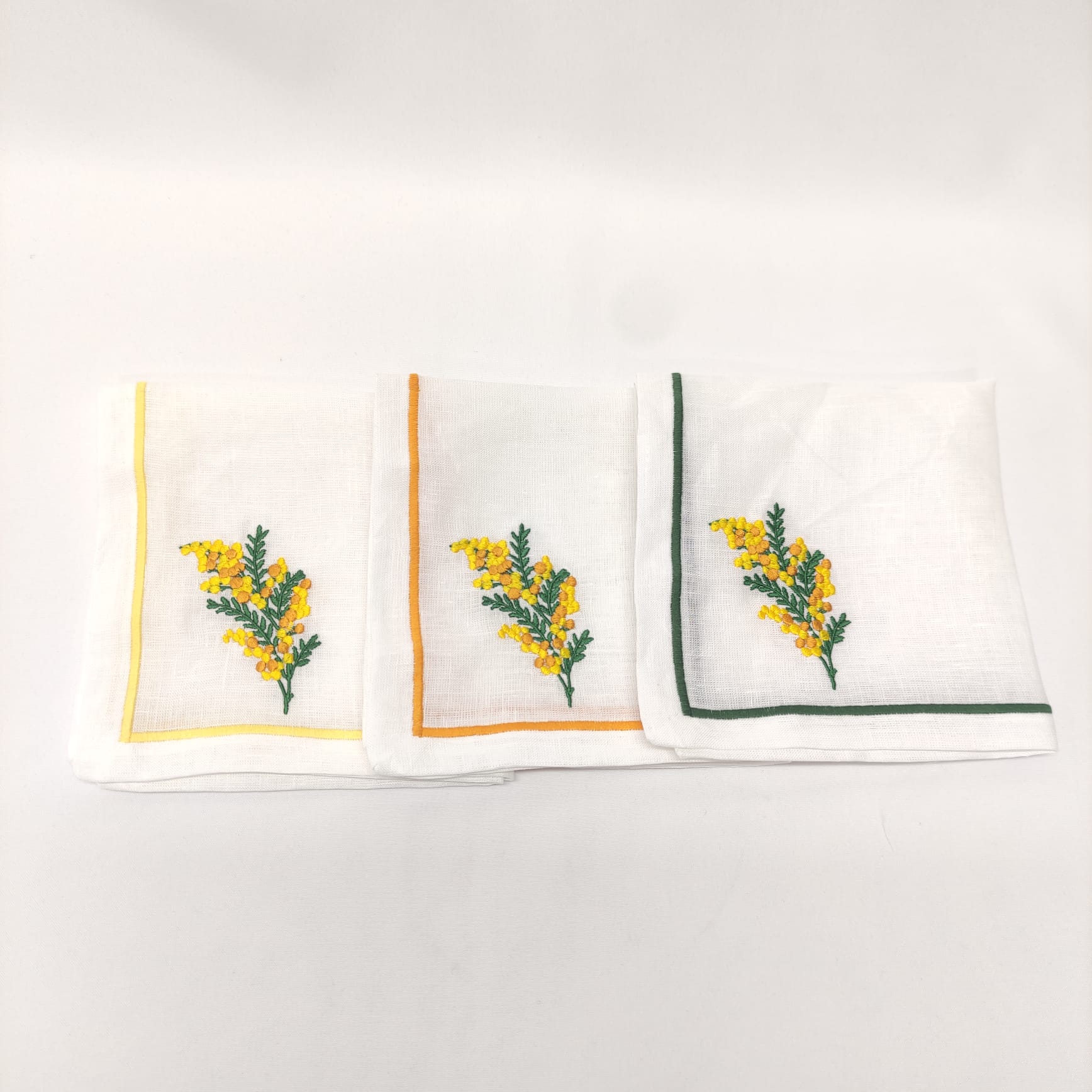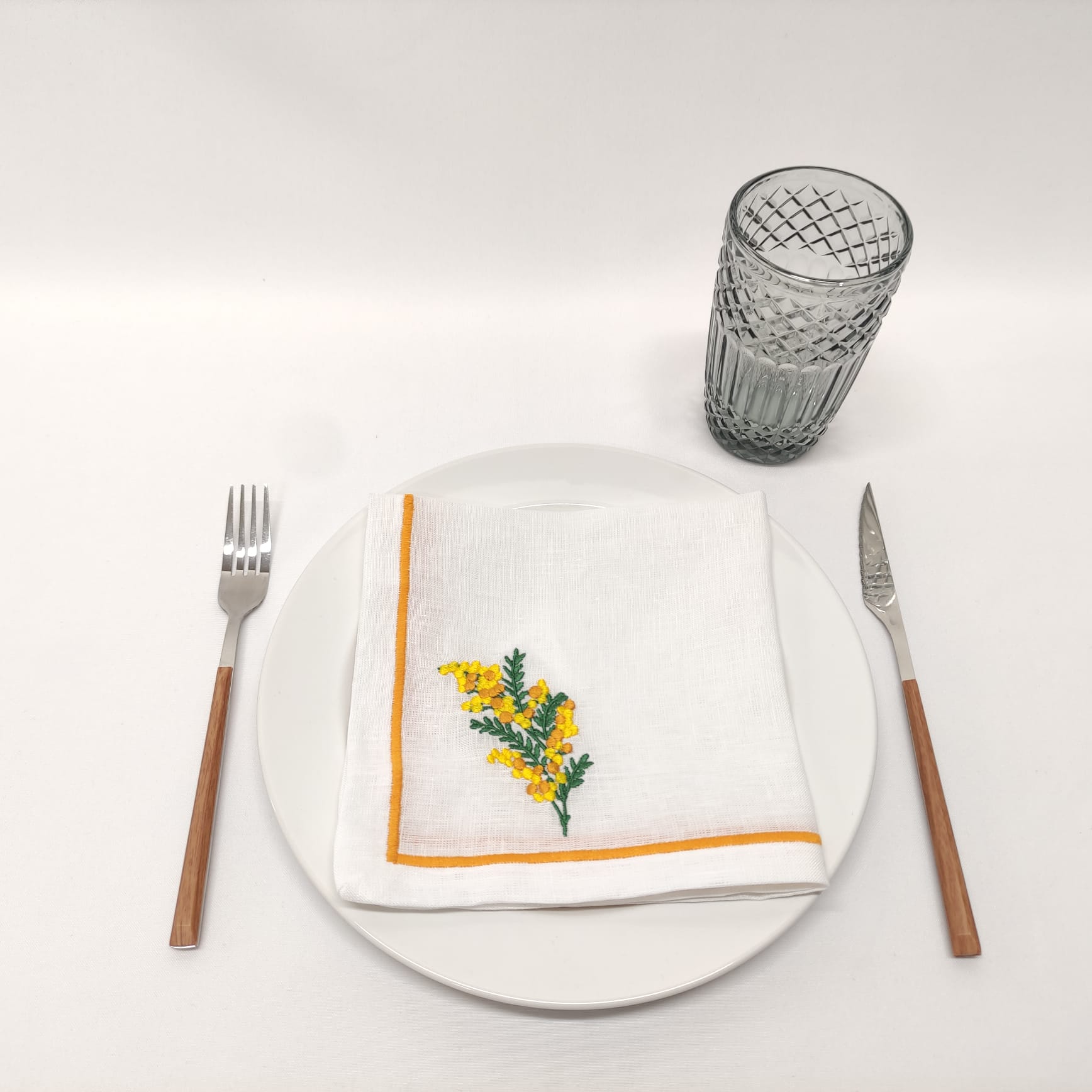 Guardanapo em linho branco, com bordado de uma mimosa e acabamento em rolinho.