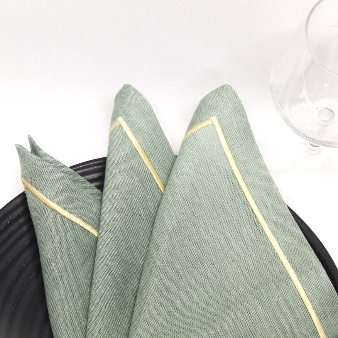 Guardanapo em linho tom de verde menta. Disponivel em diferentes acabamentos, bainha inglesa , ponto aberto e rolinho á cor do linho.