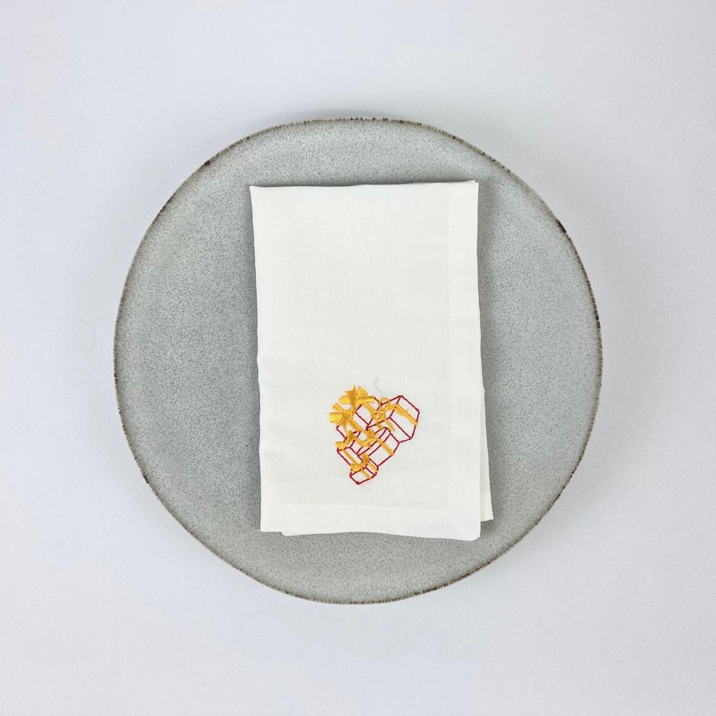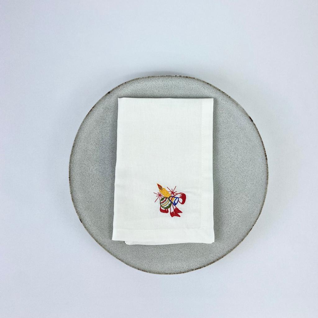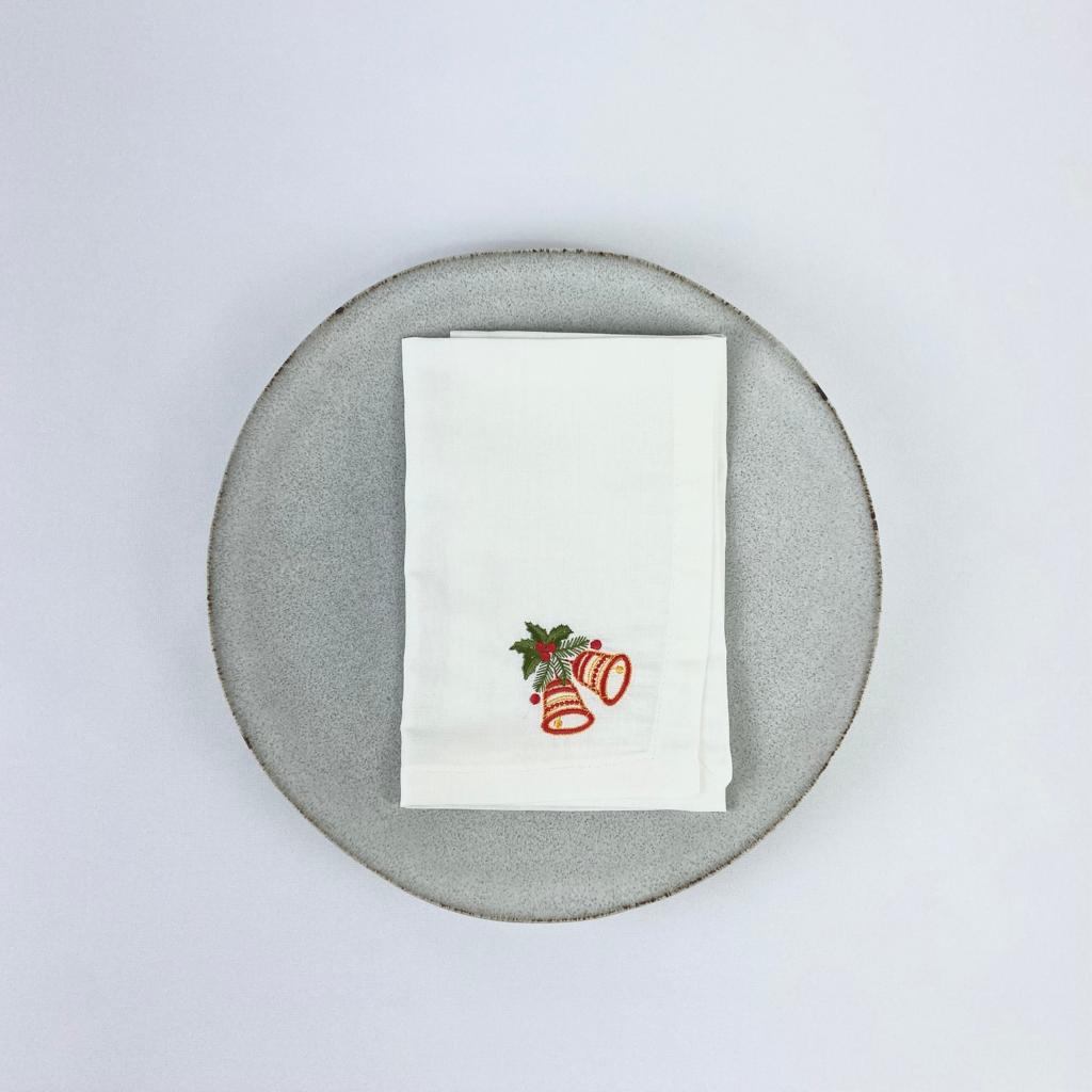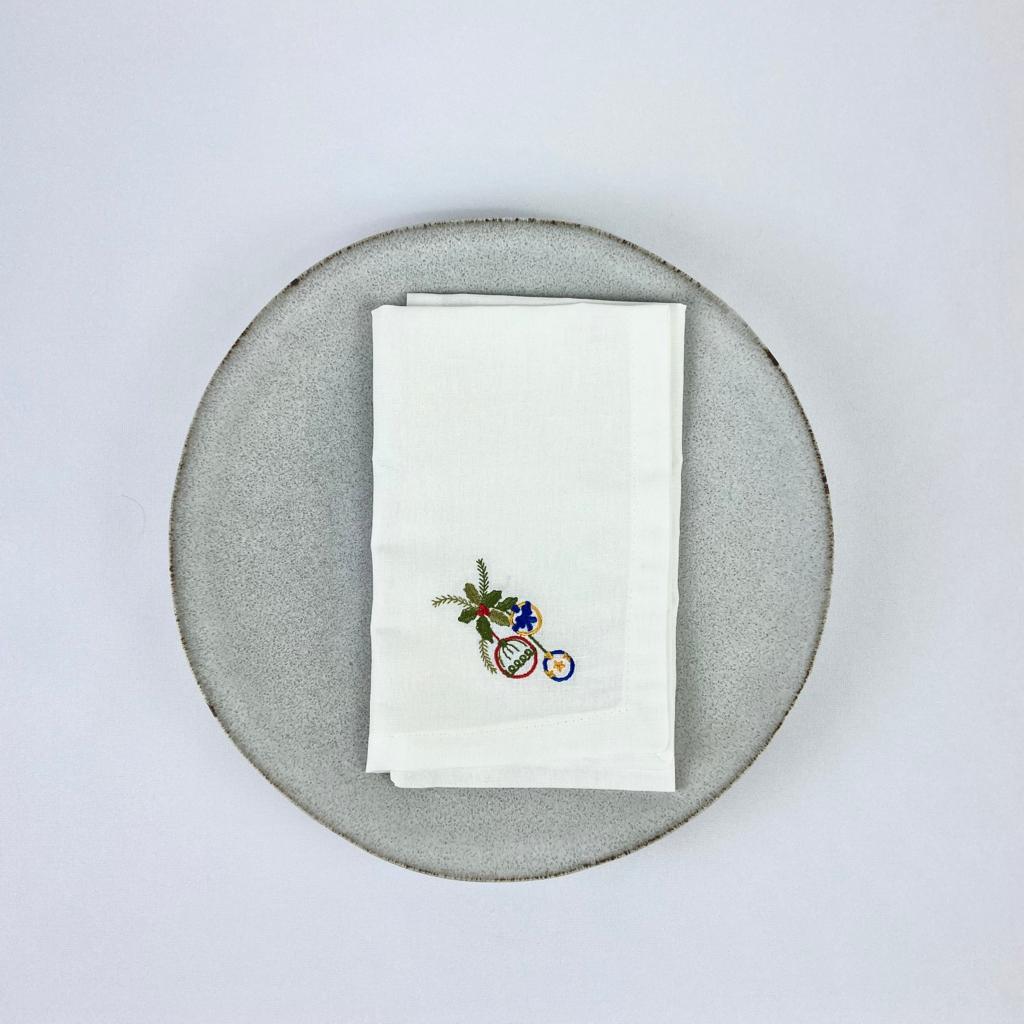 Guardanapo em linho peróla, modelo liso com acabamento de bainha inglesa 2cm aproximadamente. Guardanapo com diversos bordados natalicios.