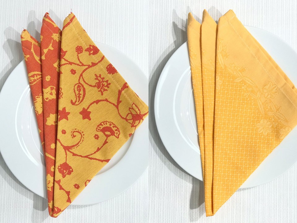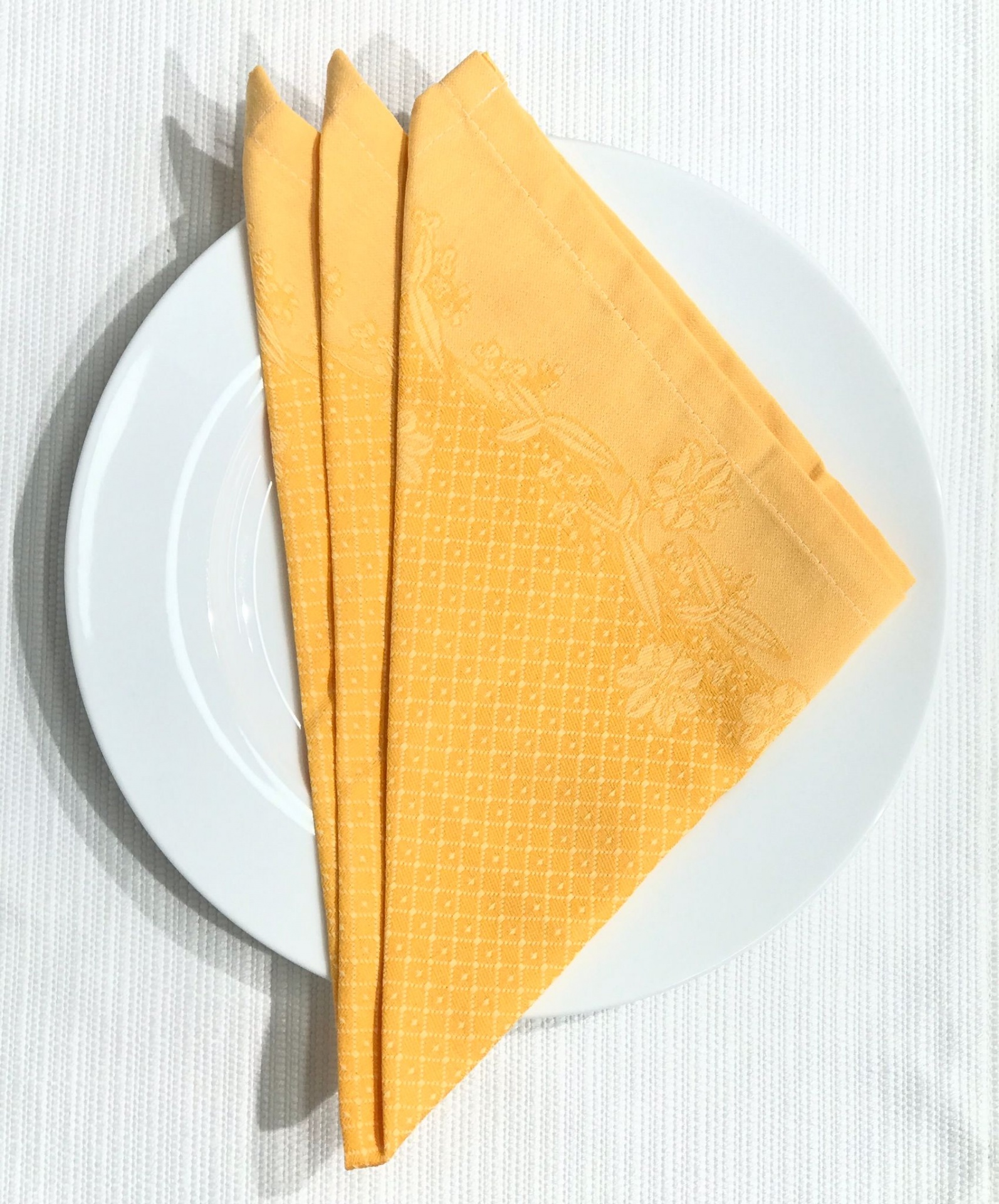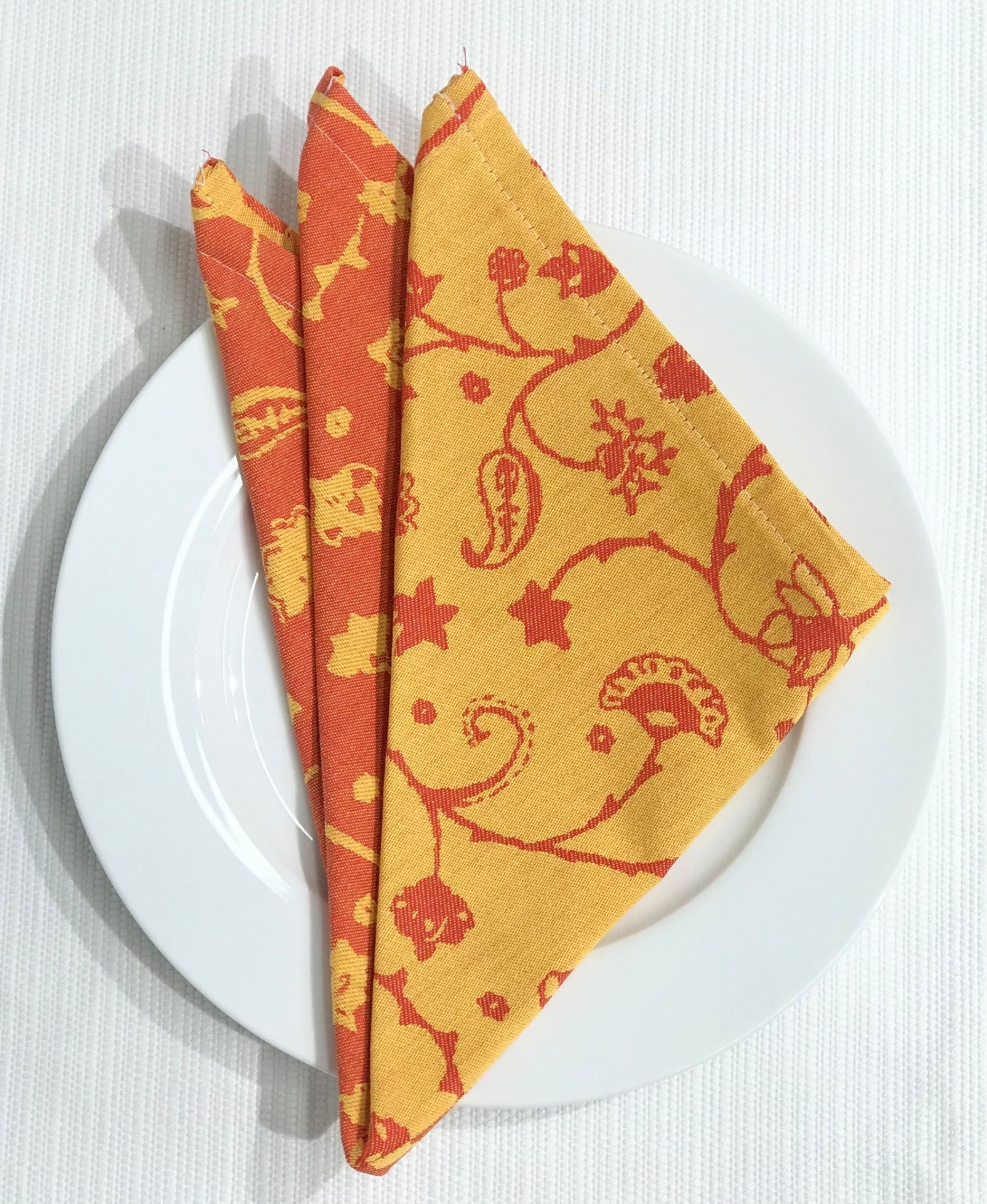 Guardanapo algodão em amarelo e laranja com padrão primaveril.