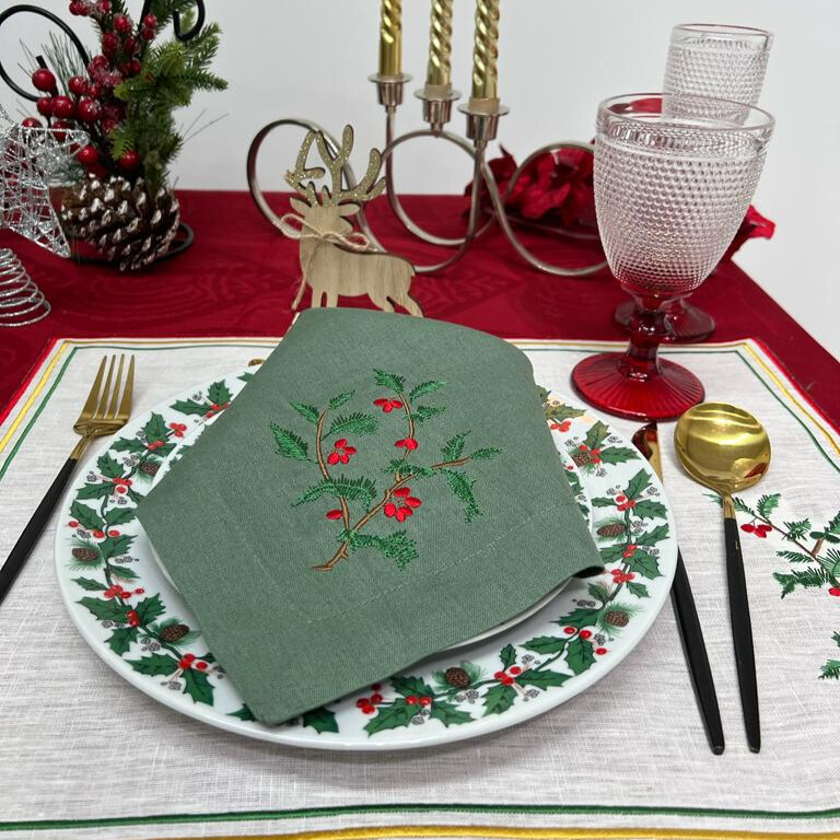 Guardanapo em linho verde escuro, com bordado azevinho de Natal, acabamento de bainha inglesa.
