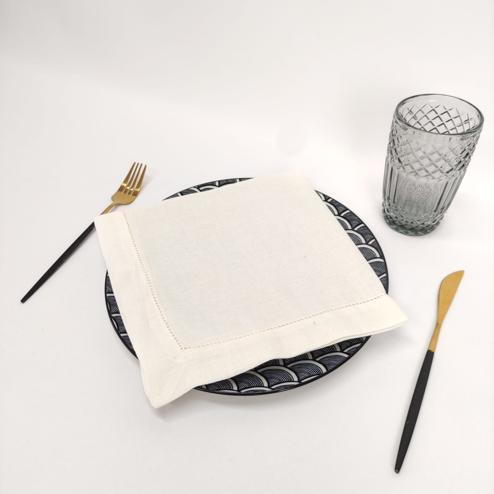 Guardanapo em Linho lavado pérola com acabamento em ponto aberto.