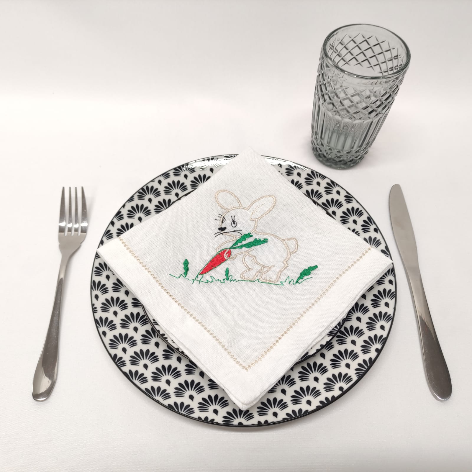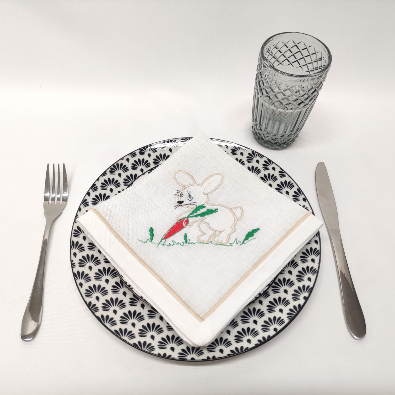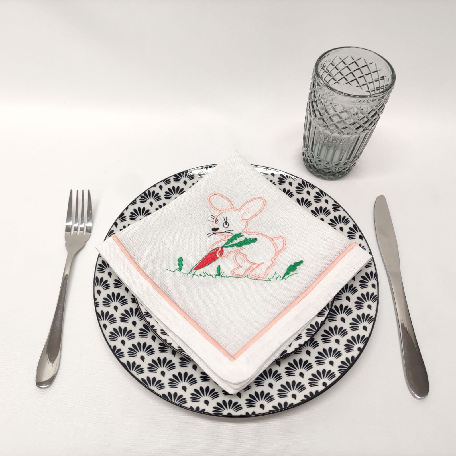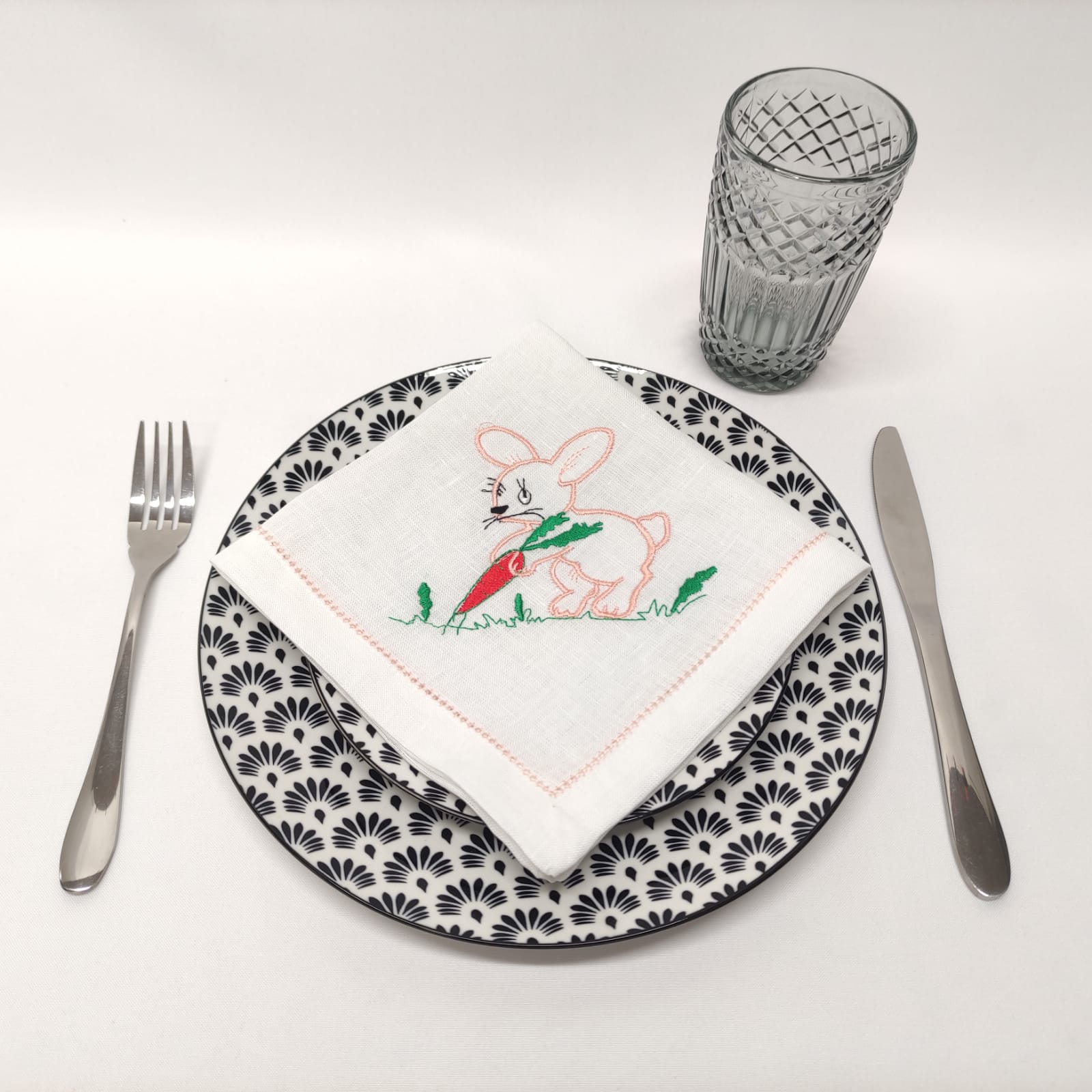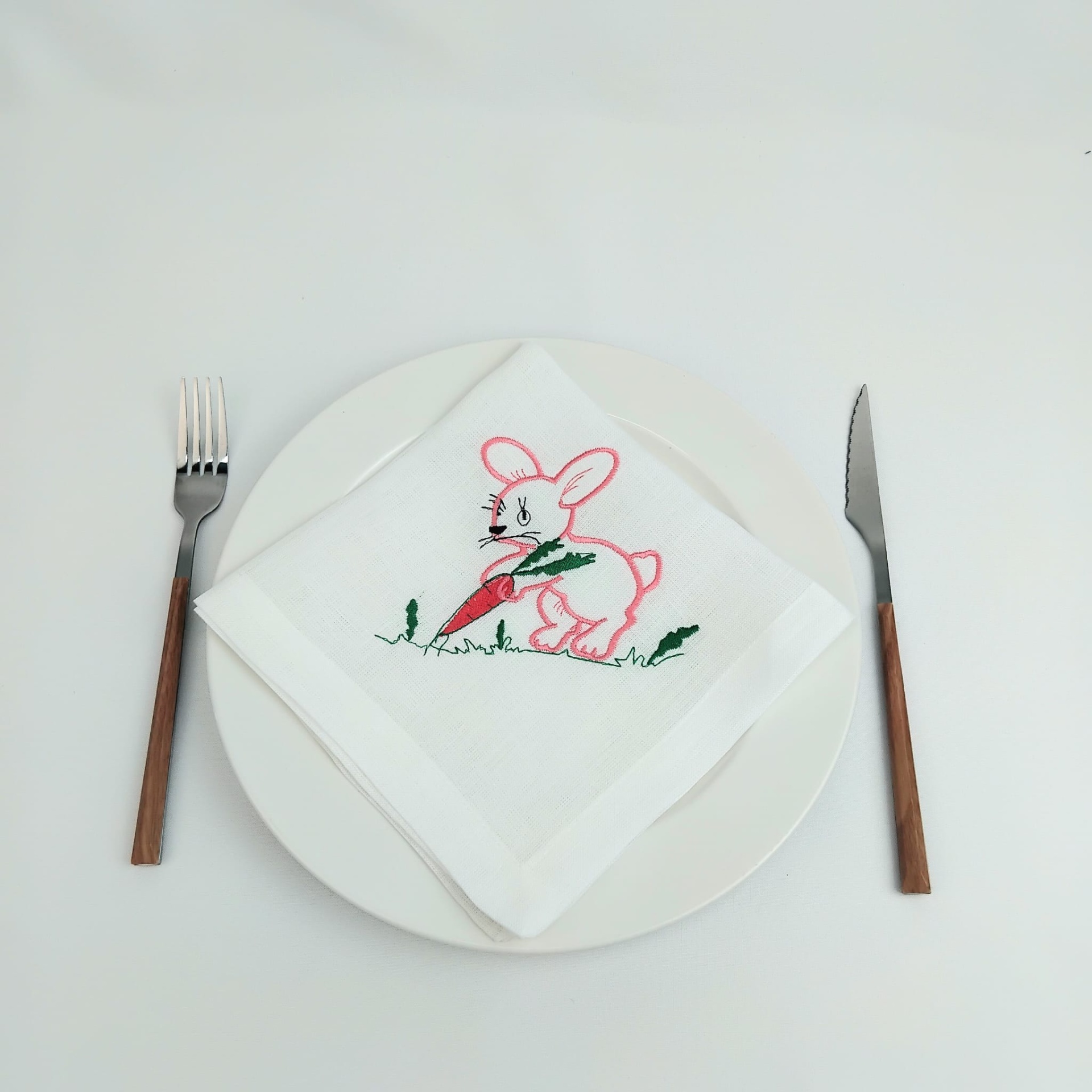 Guardanapo em linho branco com um coelho bordado. Uma excelente opção para a Páscoa.