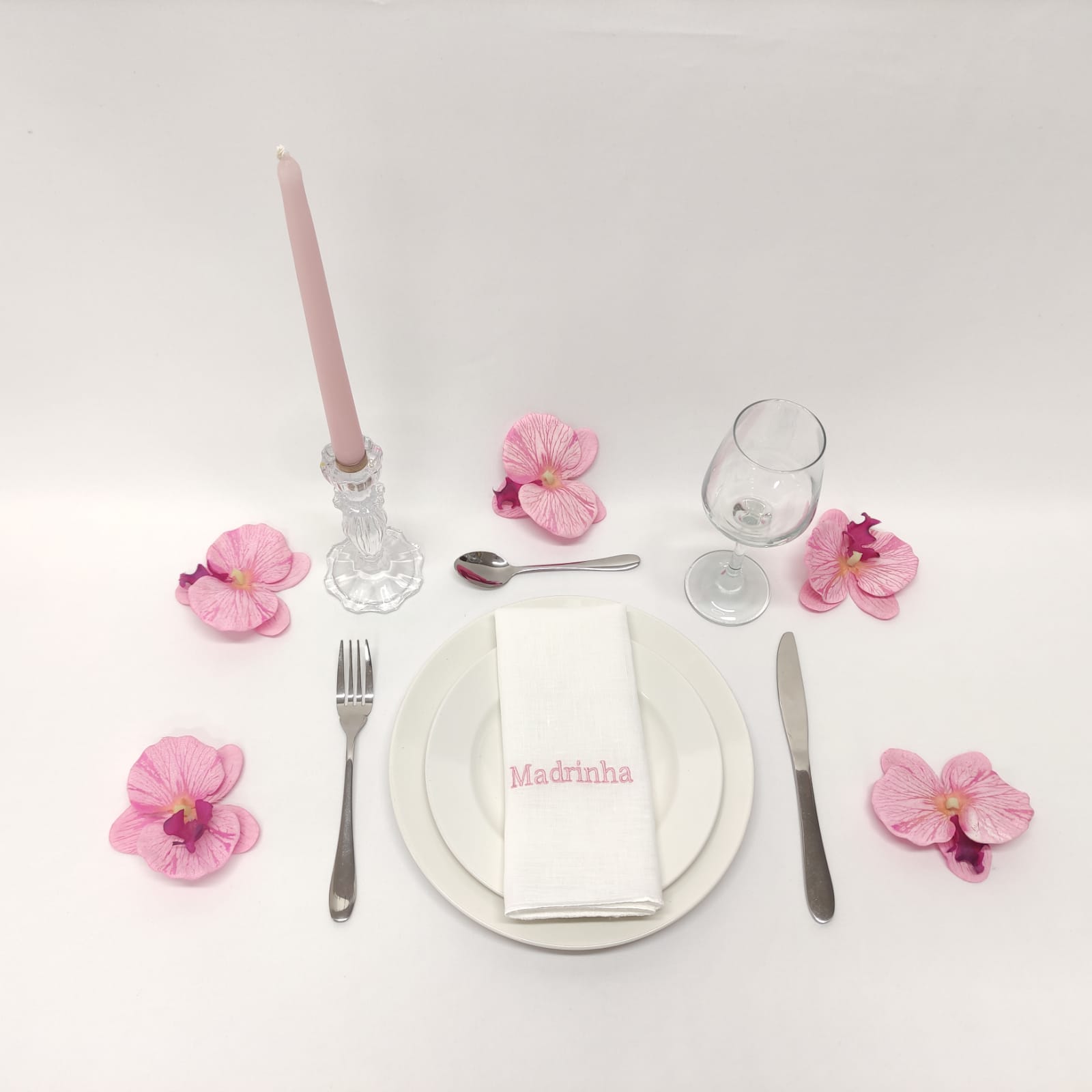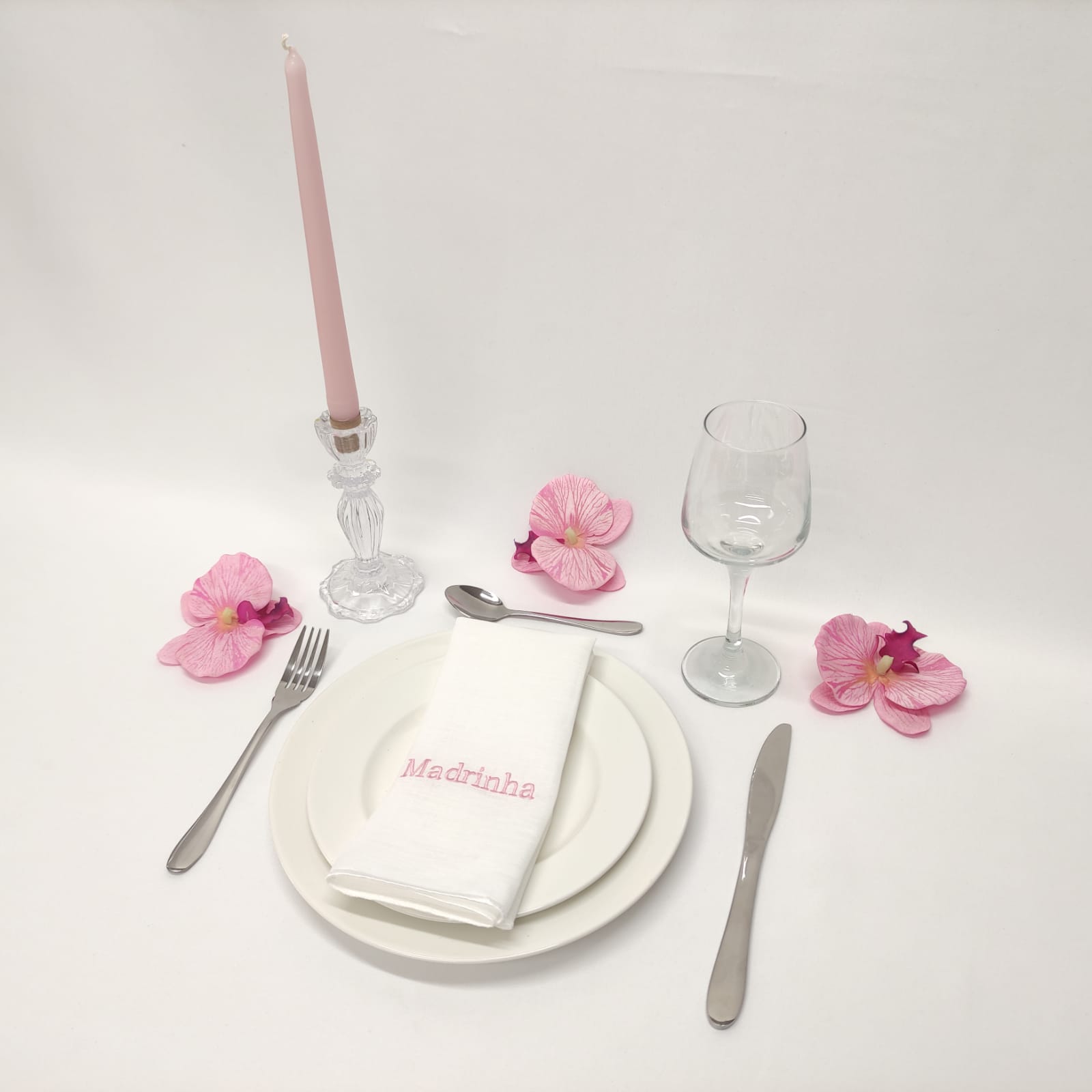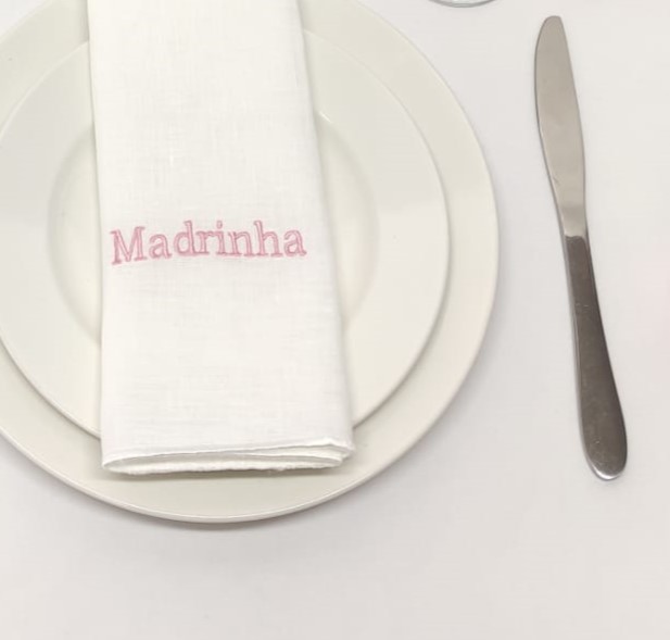 Guardanapo em linho branco com acabamento em rolinho, com nome bordado à sua escolha.