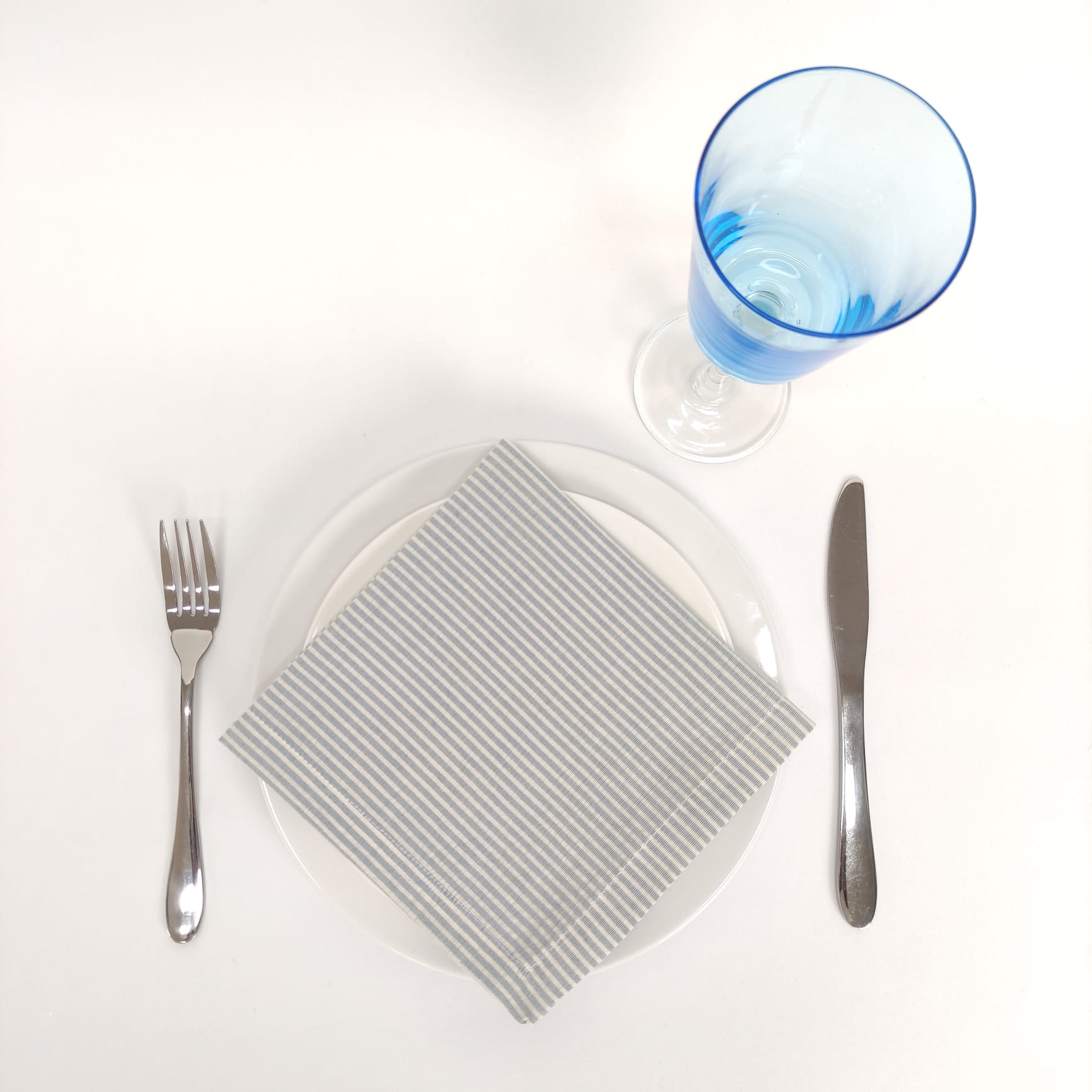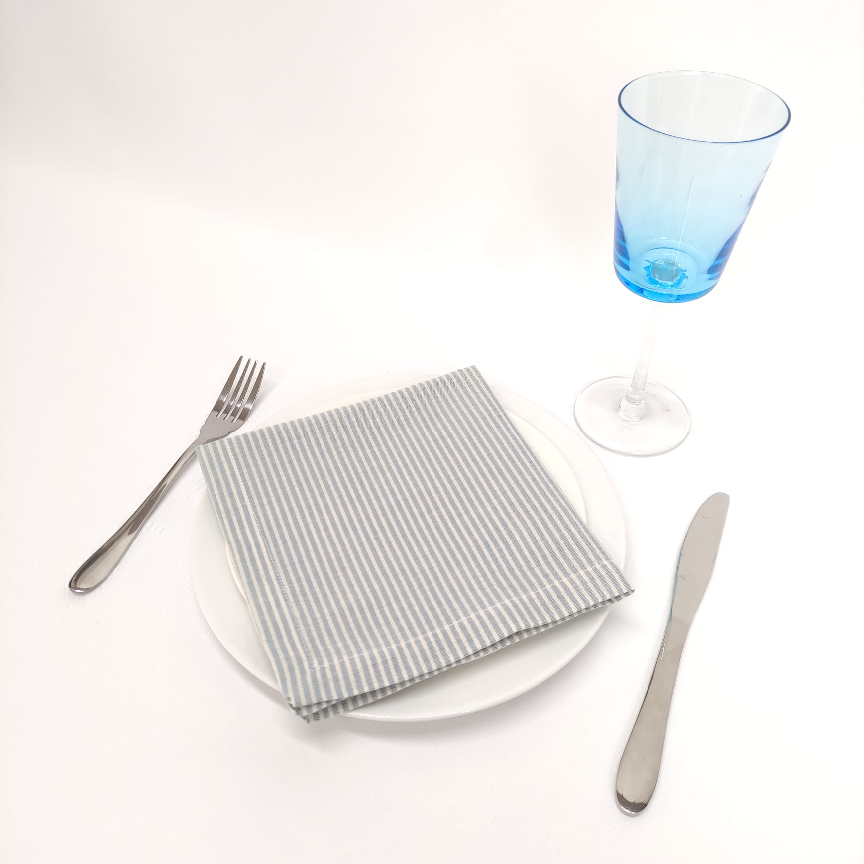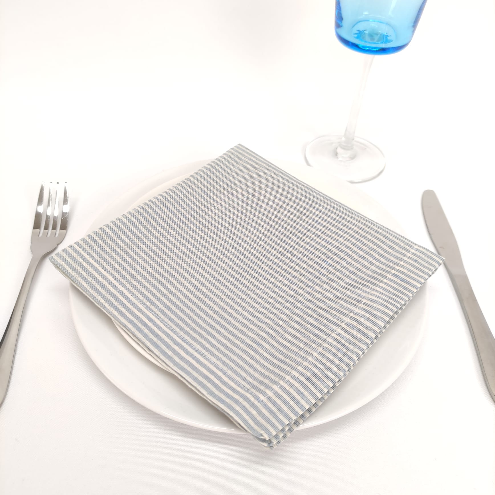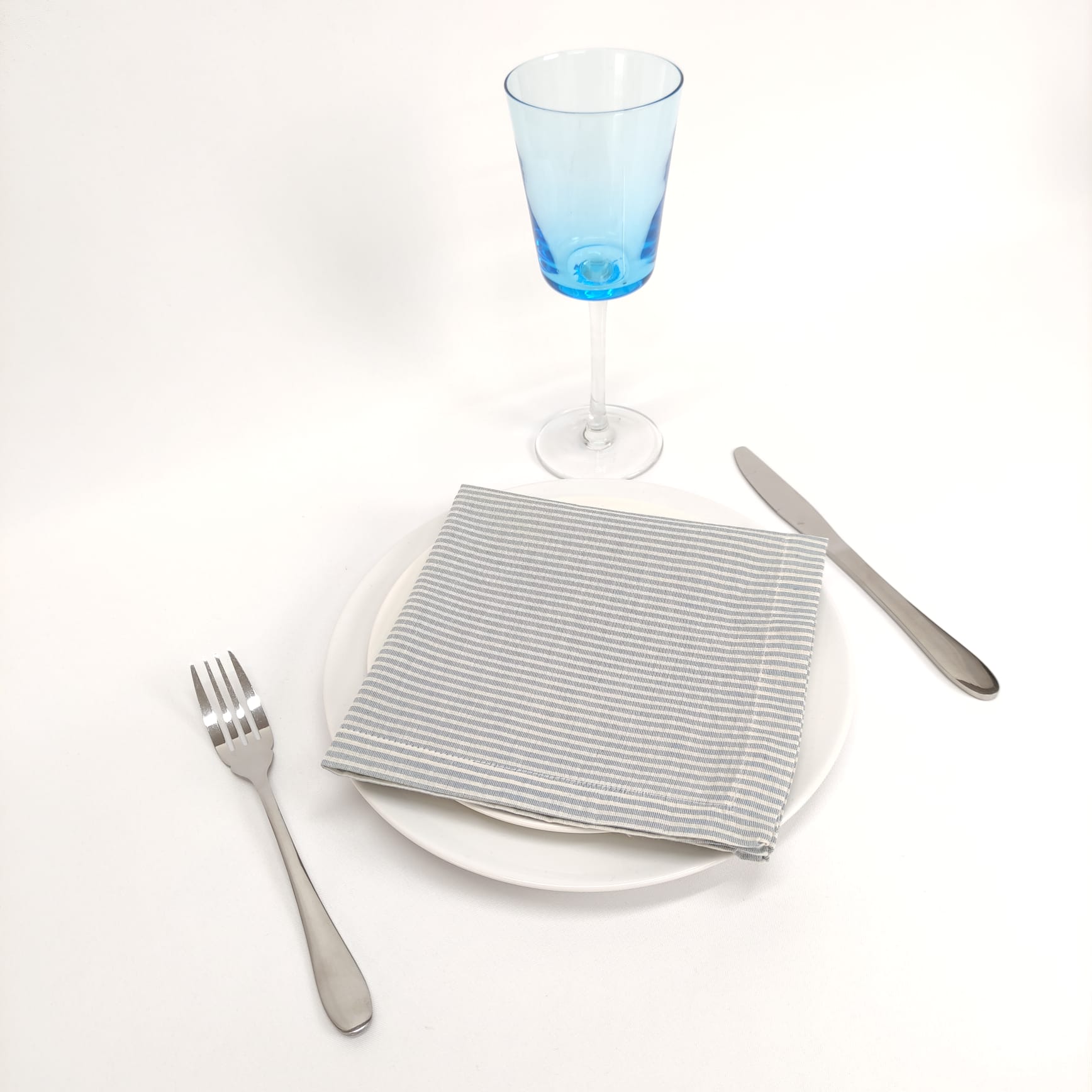 Guardanapo em linho padrão riscas, tom de azul e bege, com acabamento bainha inglesa de 2cm.