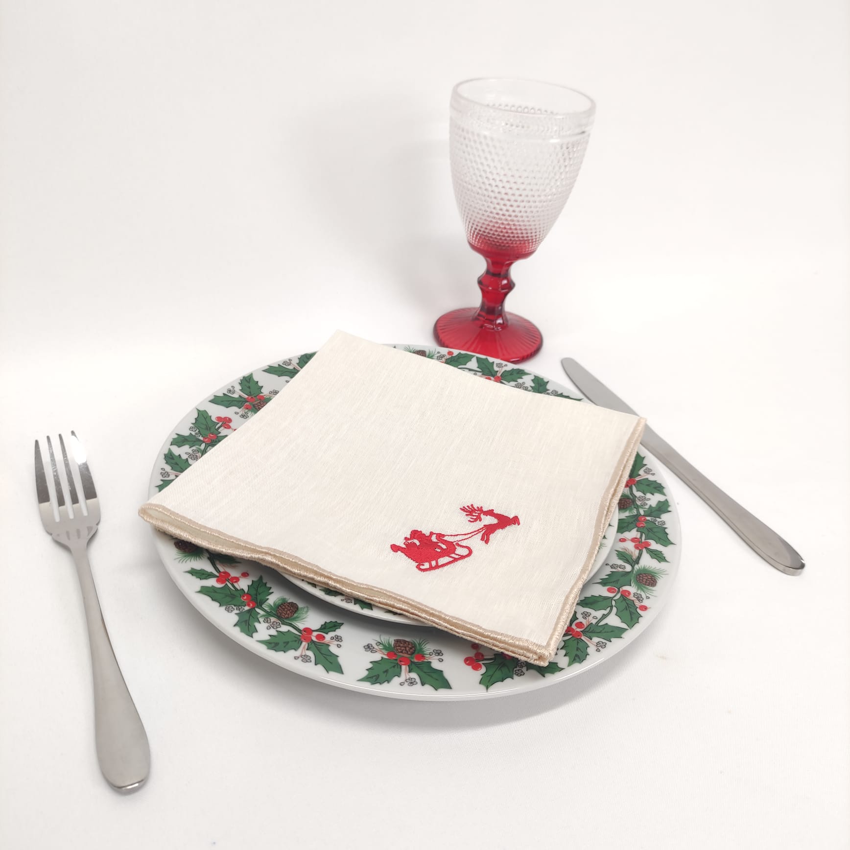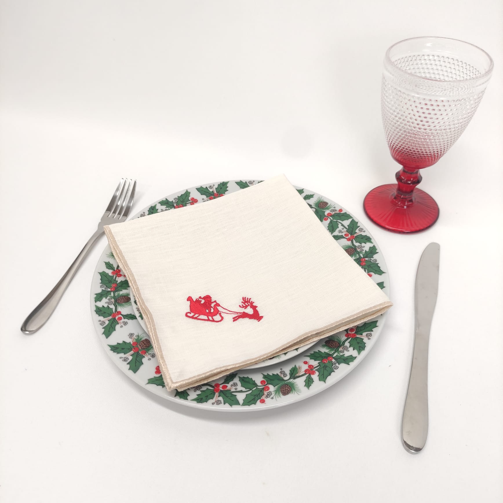 Guardanapo em linho pérola com bordado de Natal e acabamento em rolinho. Perfeito para a ceia de Natal.