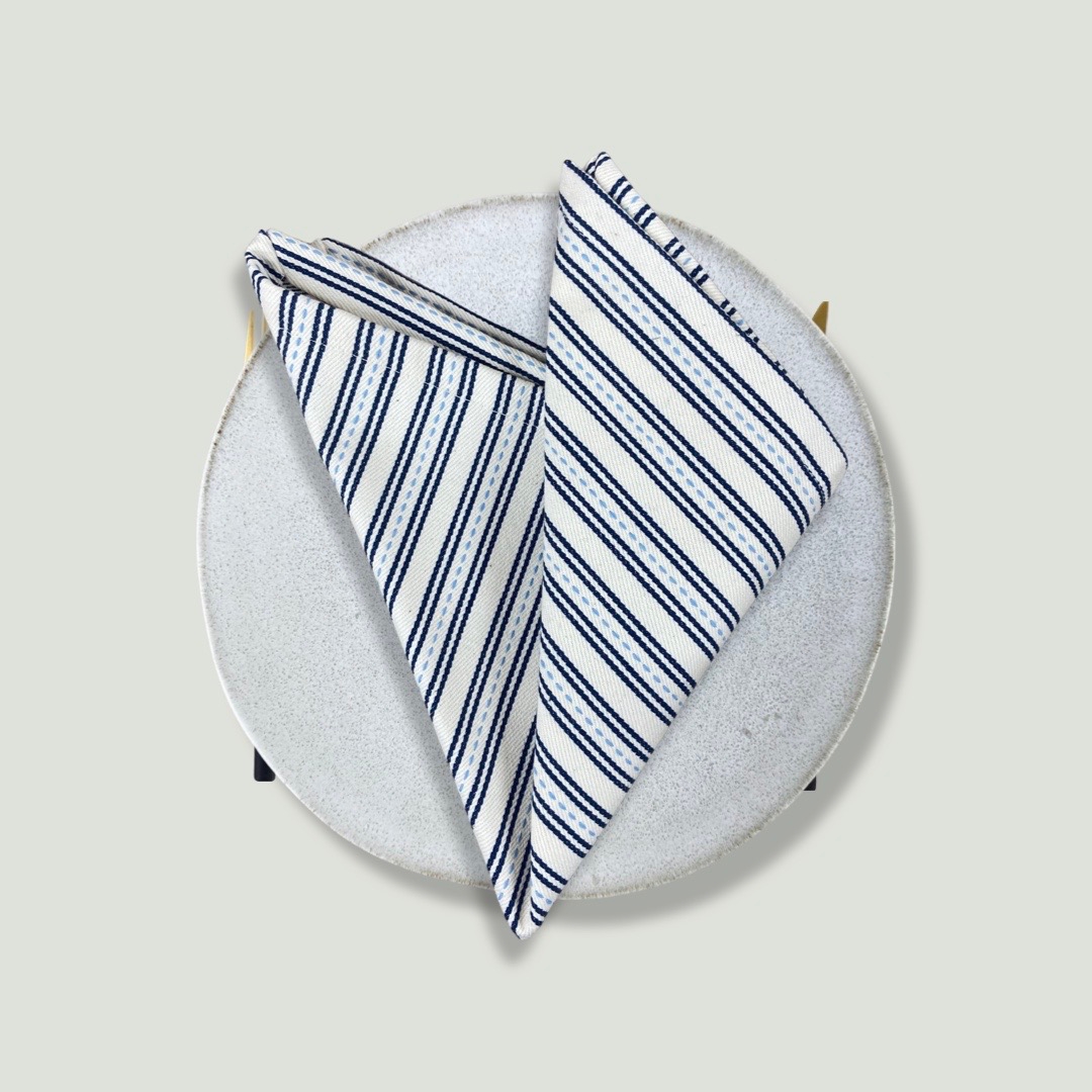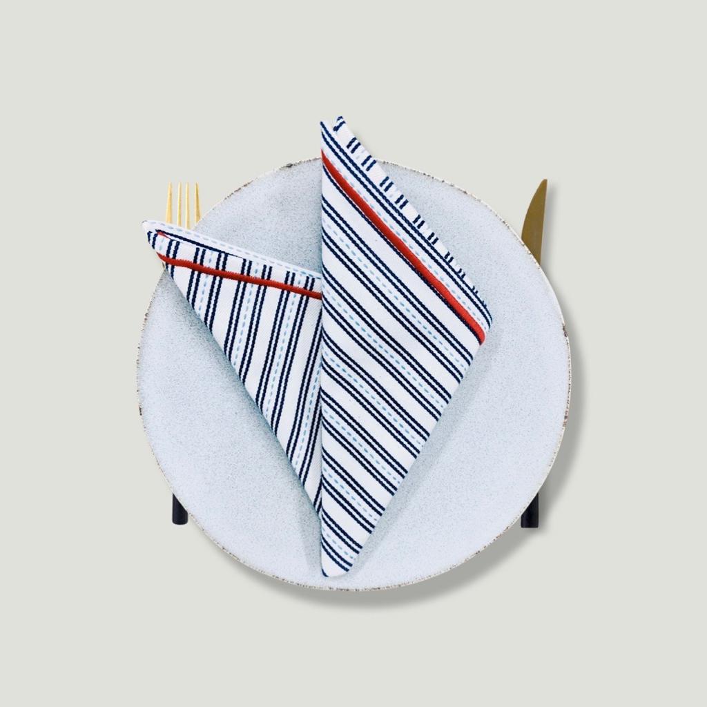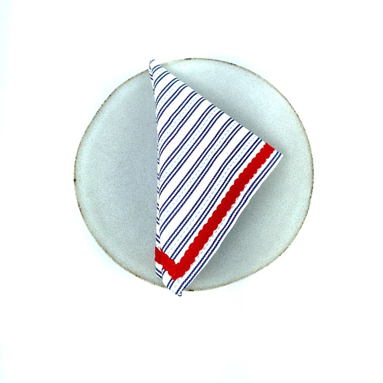 Guardanapo em algodão, tecido padrão tons de bege e azul com aplicação de renda vermelha.