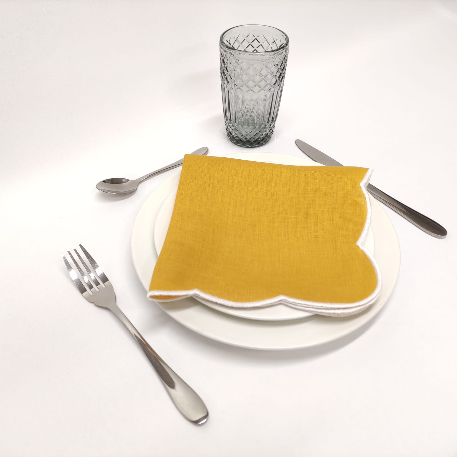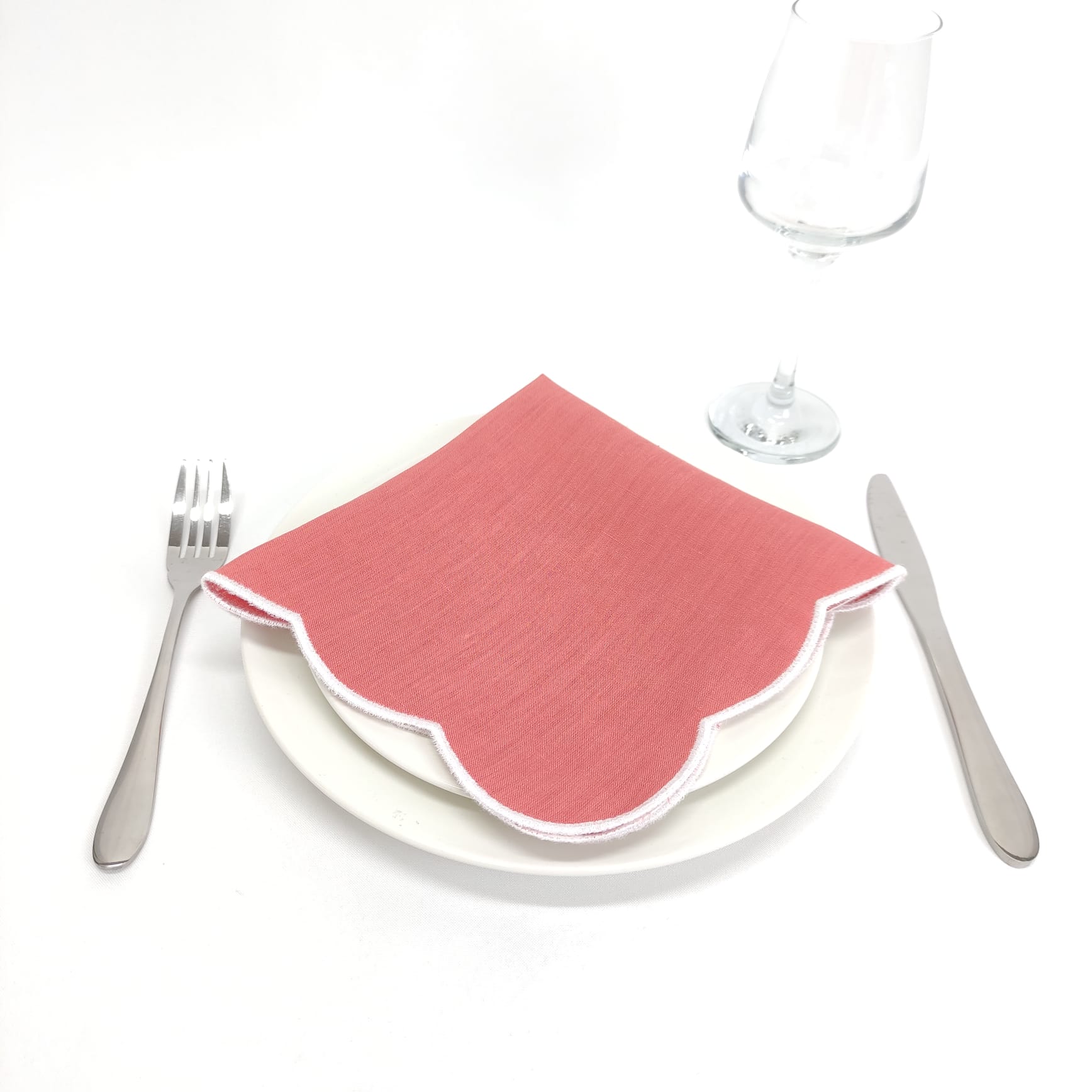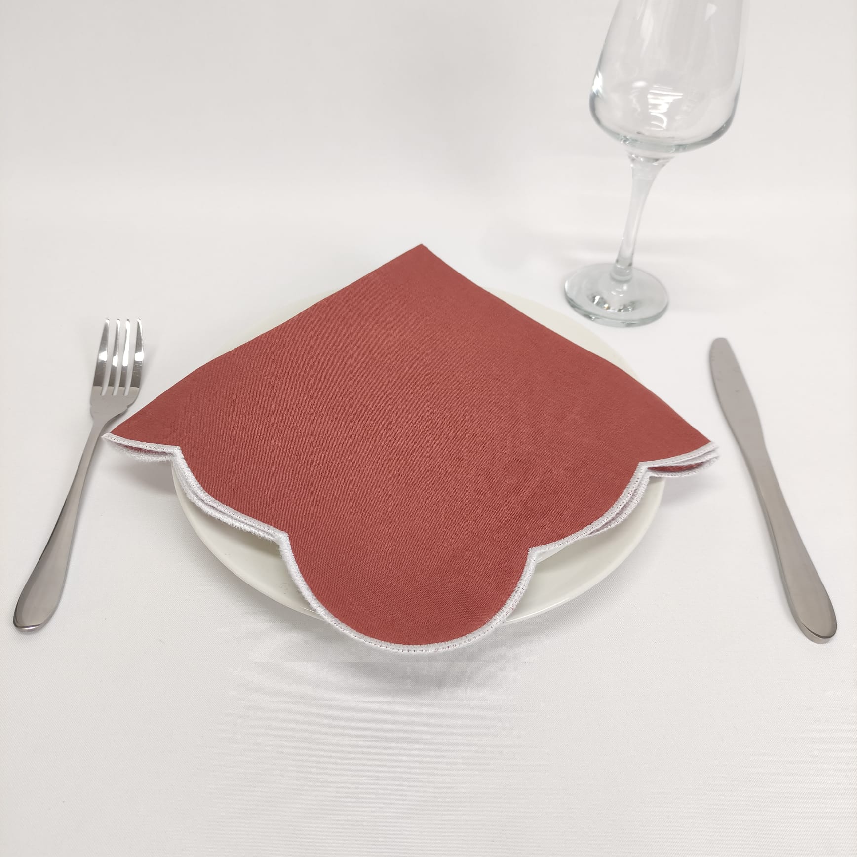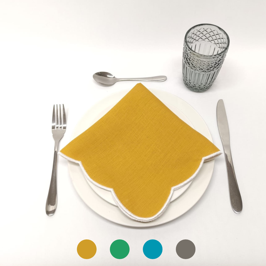 Guardanapo em linho, com acabamento de rolinho branco.