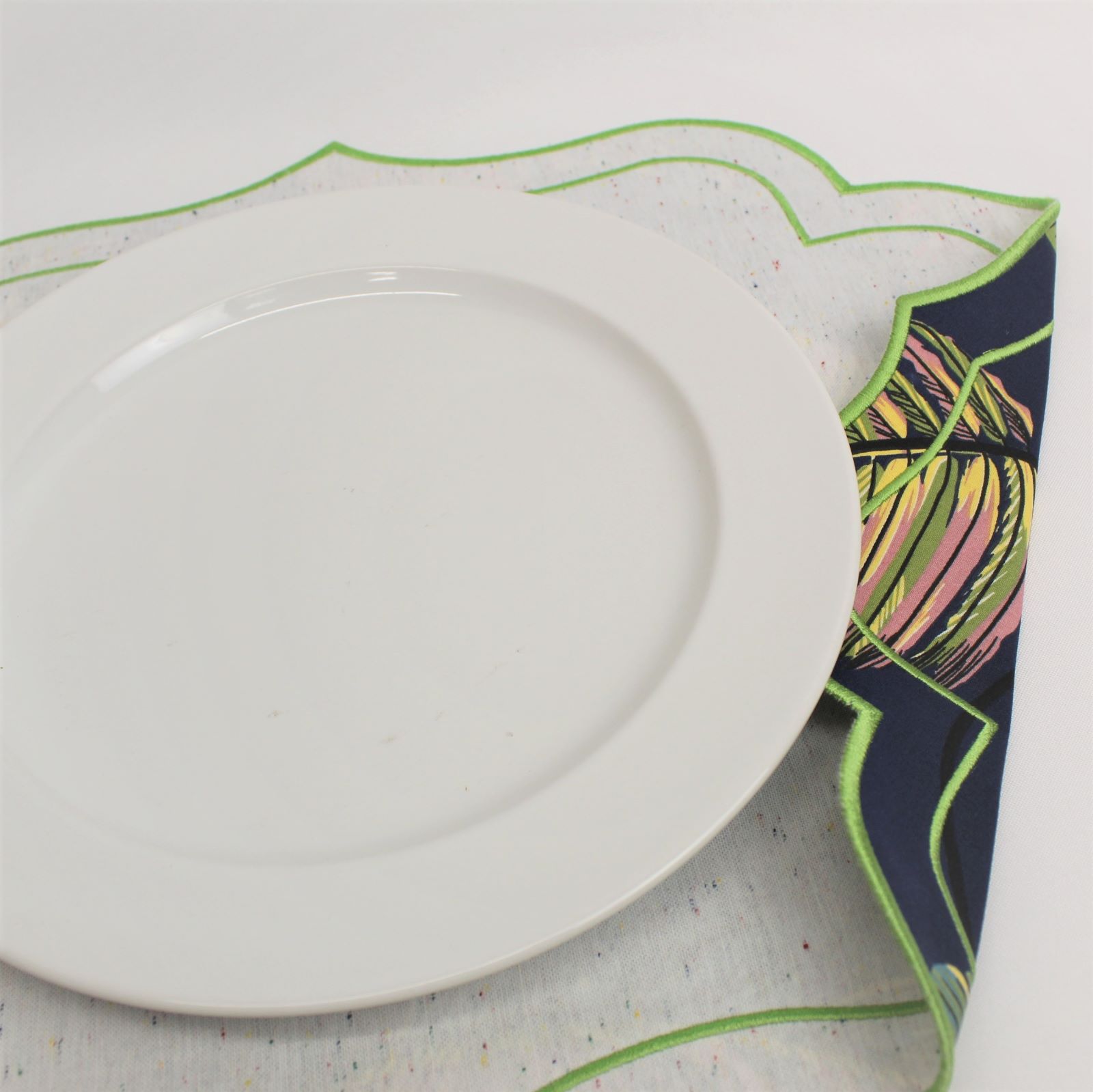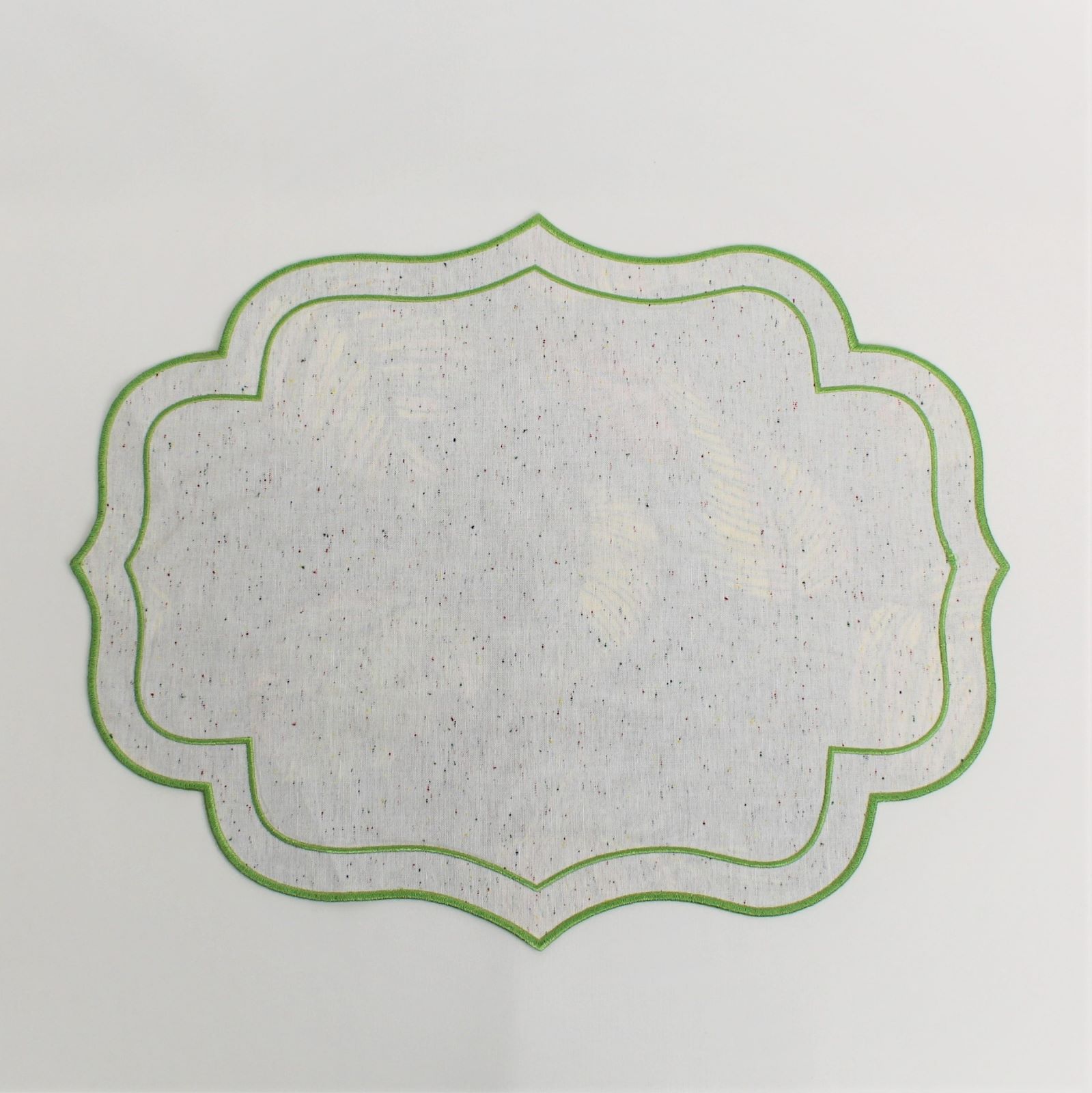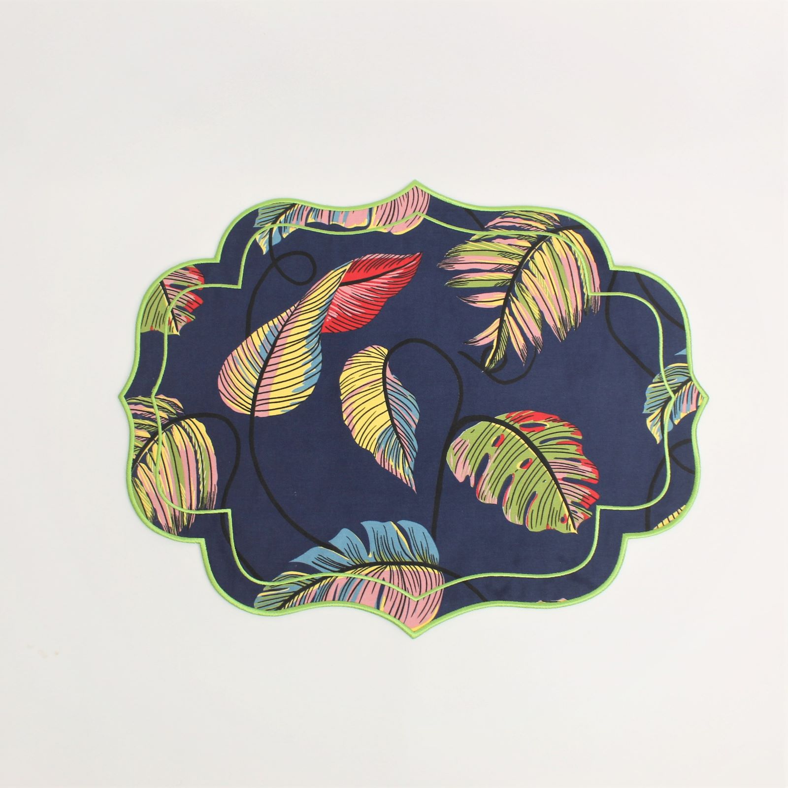 Individual de dupla face, em algodão modelo africano, cores quentes. Acabamento de rolinho a verde.