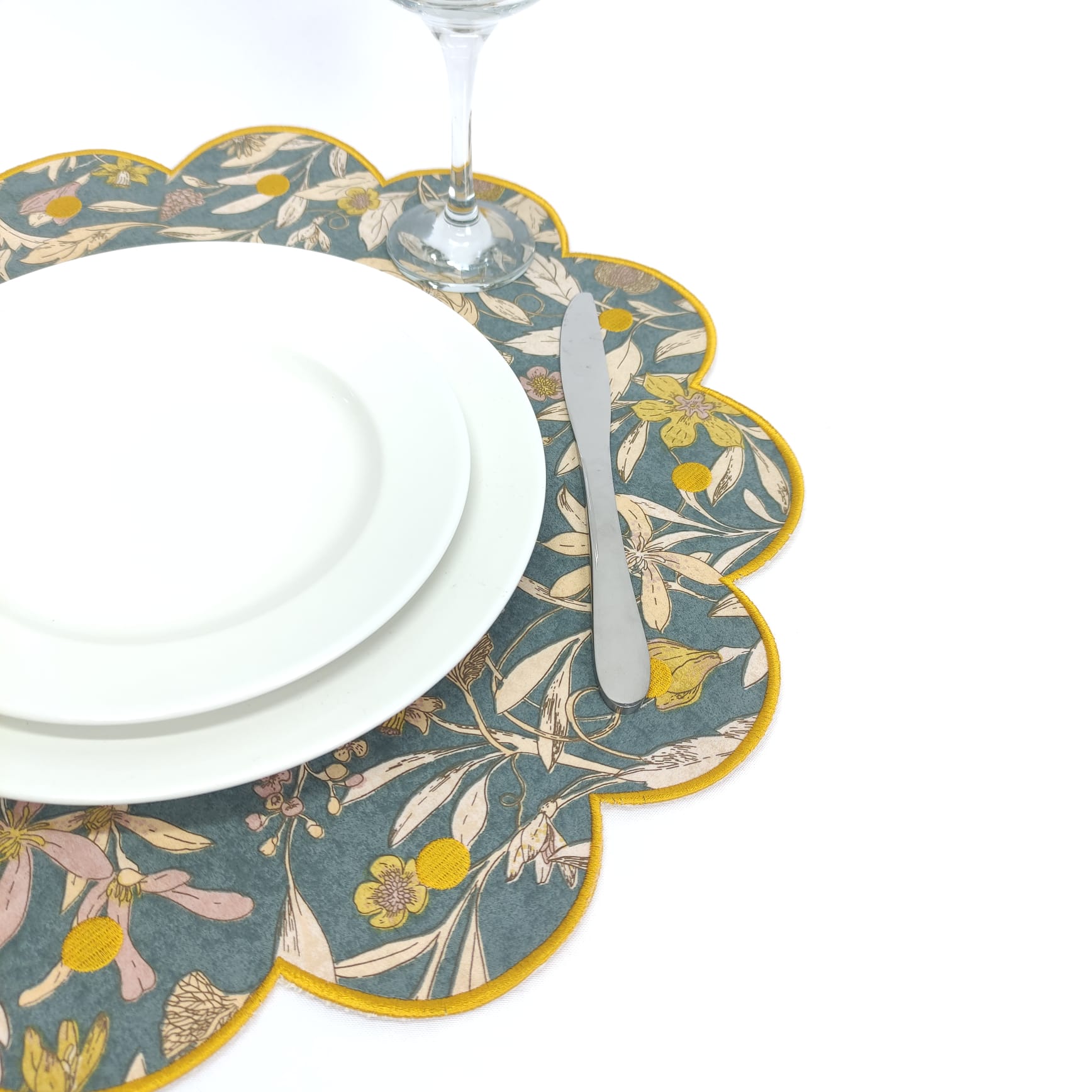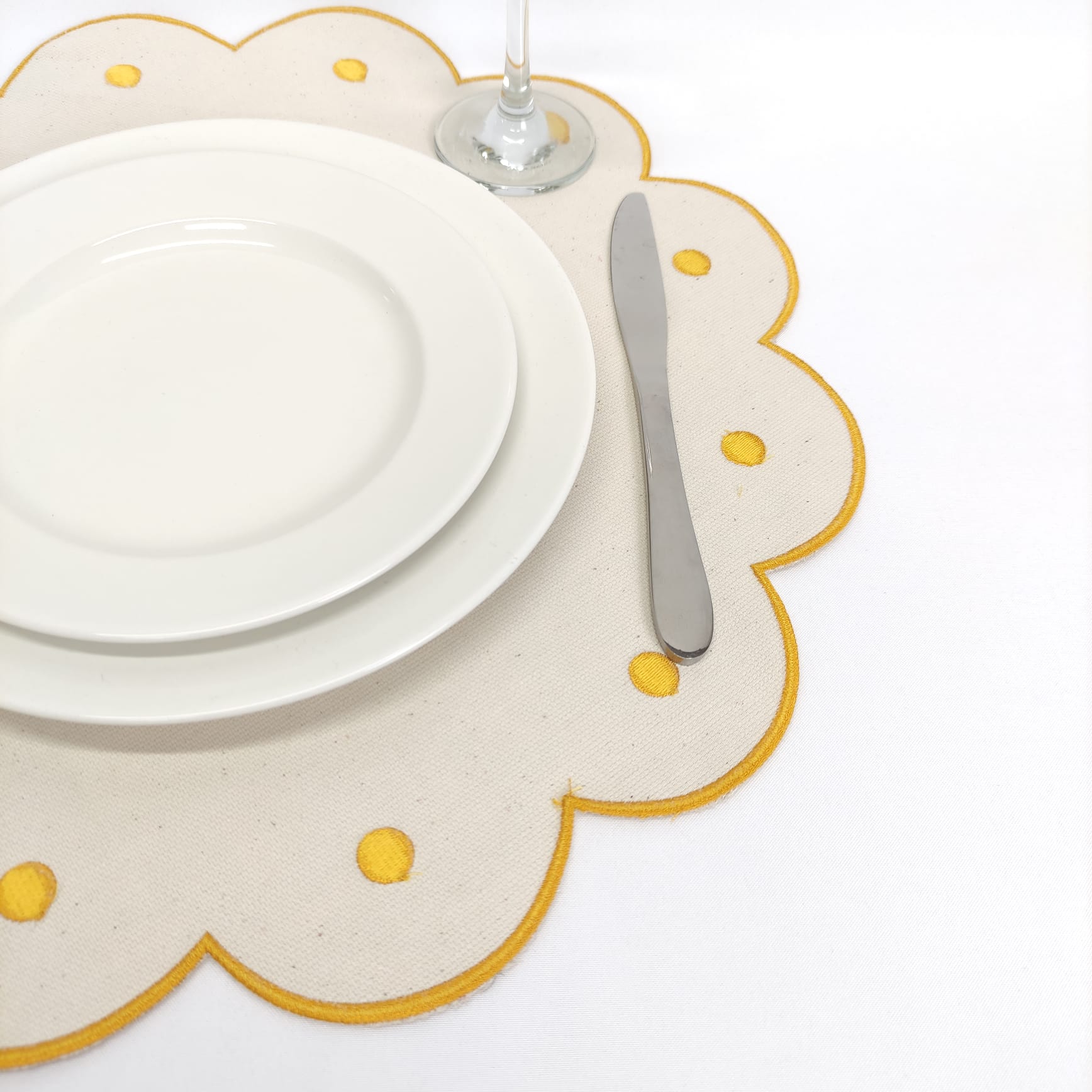 Modelo em forma de nuvem redonda com uma bola bordada em cada onda. Modelo único e que dará um encanto especial à sua mesa.