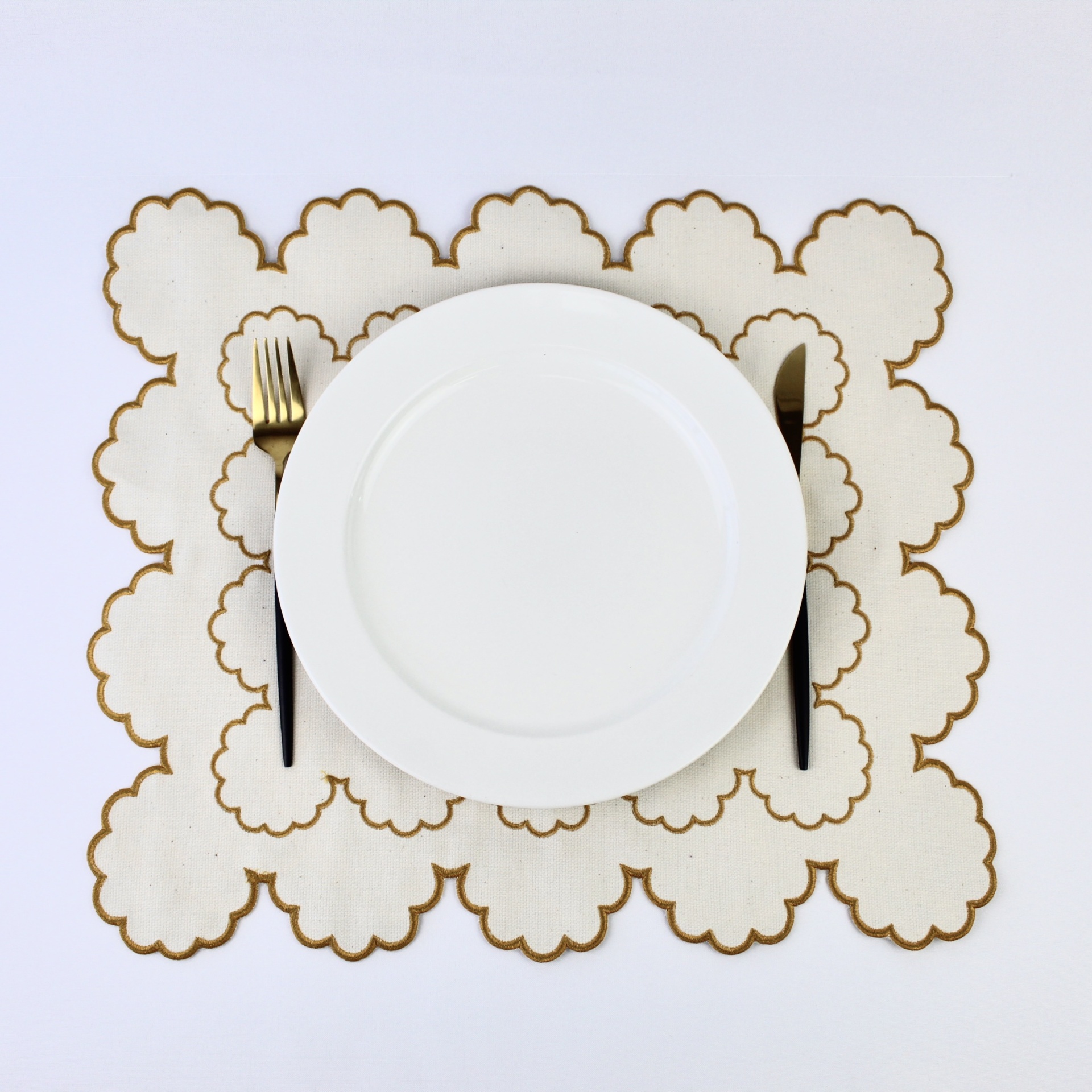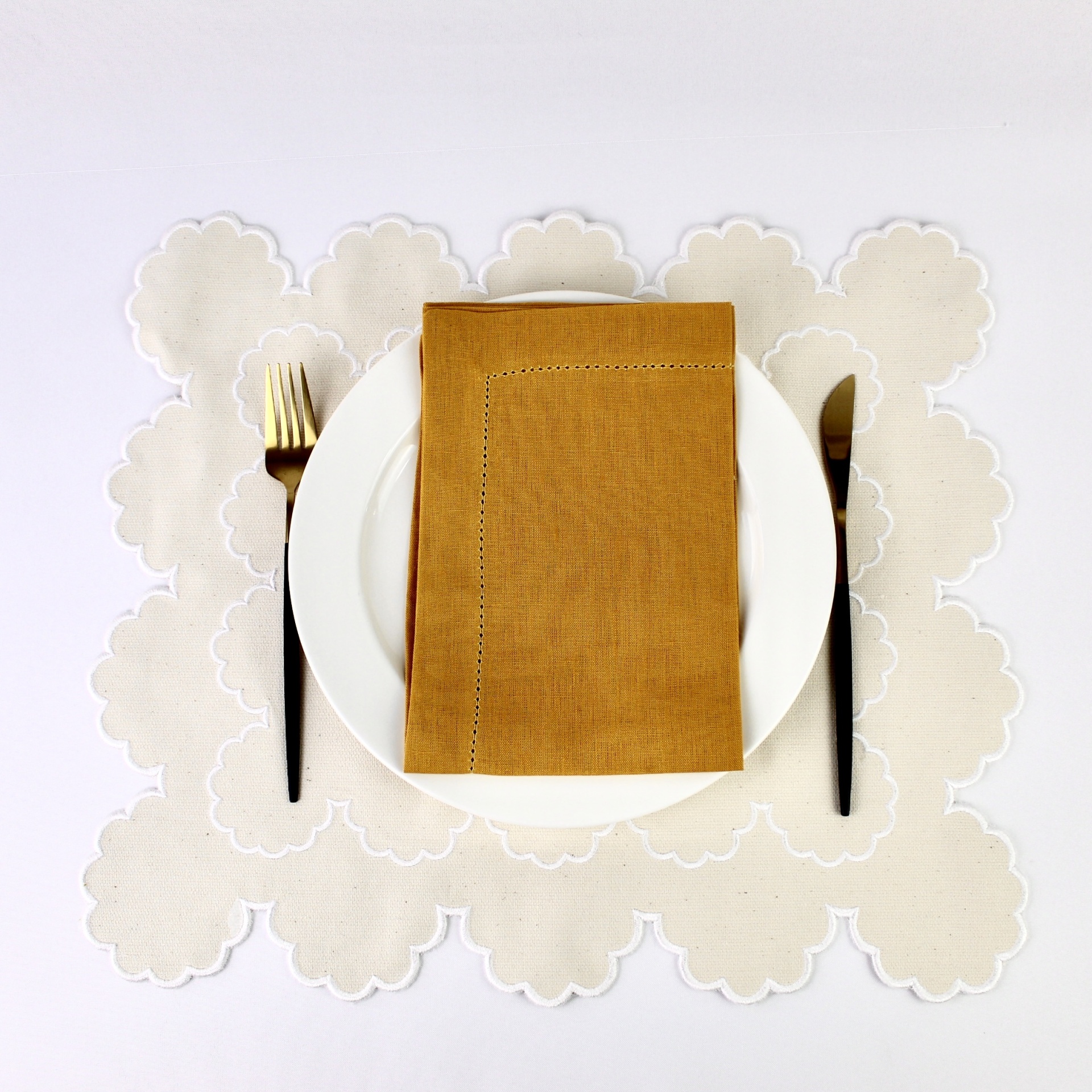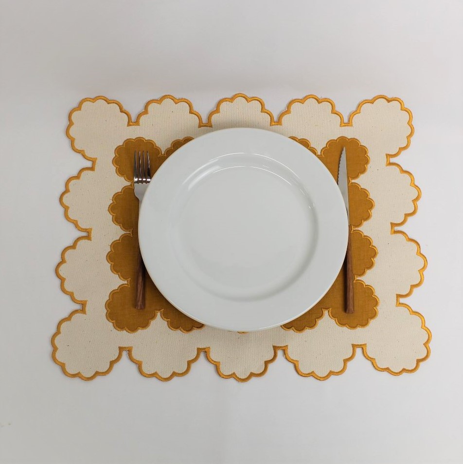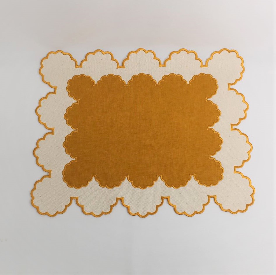 A face principal é composta por linho bege e amarelo no centro do individual, dupla face linho bege.