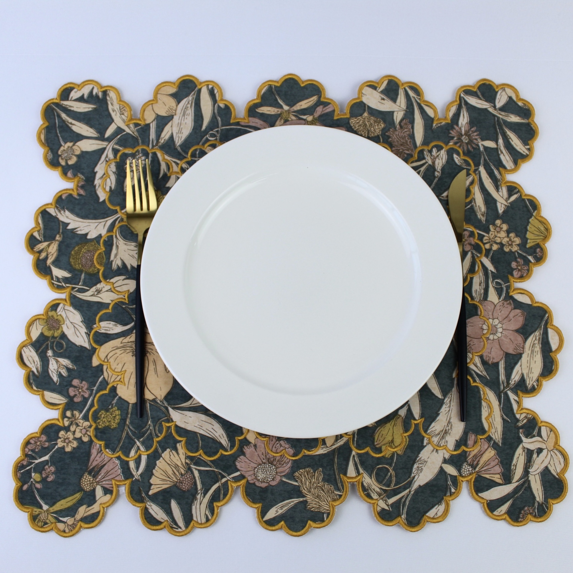 Individual em Linho, com estampado florido numa das faces e na outra linho bege. Individual duplo, com duas faces, dispónivel em vários padrões.