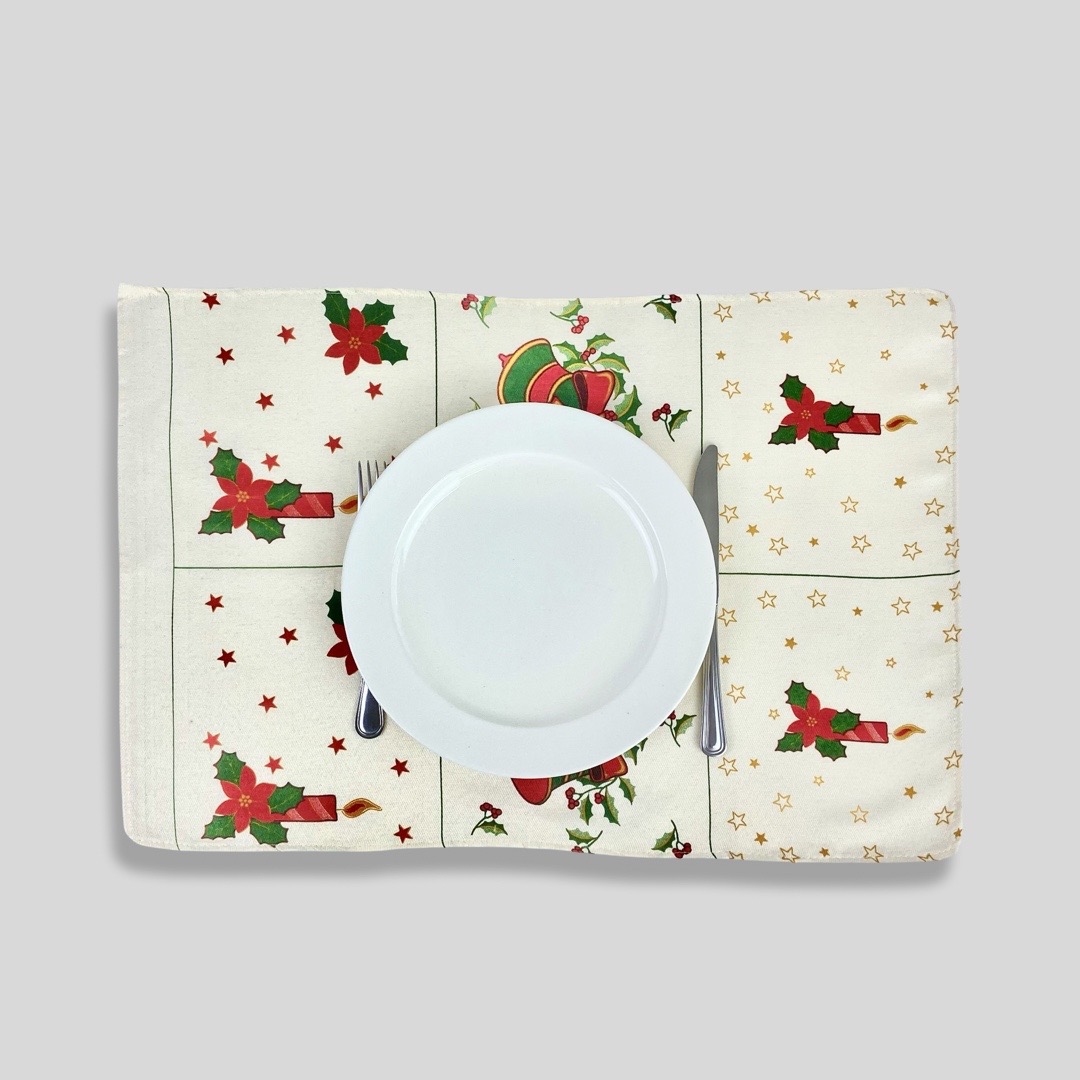 Individual com estampado de natal, tons de bege e dourados. Acabamento bainha inglesa.
