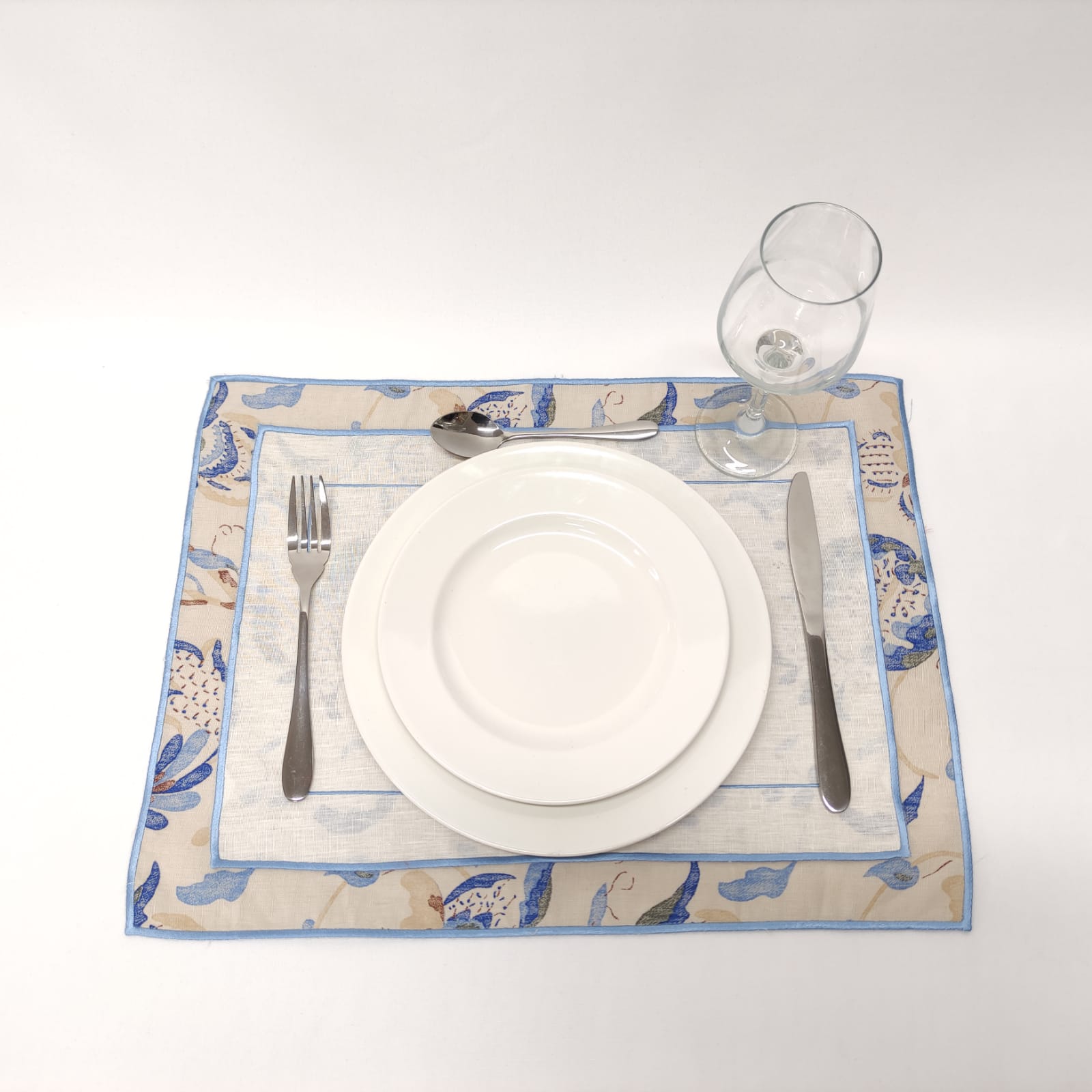 Individual de dupla face, em linho azul. Com acabamento de rolinho.