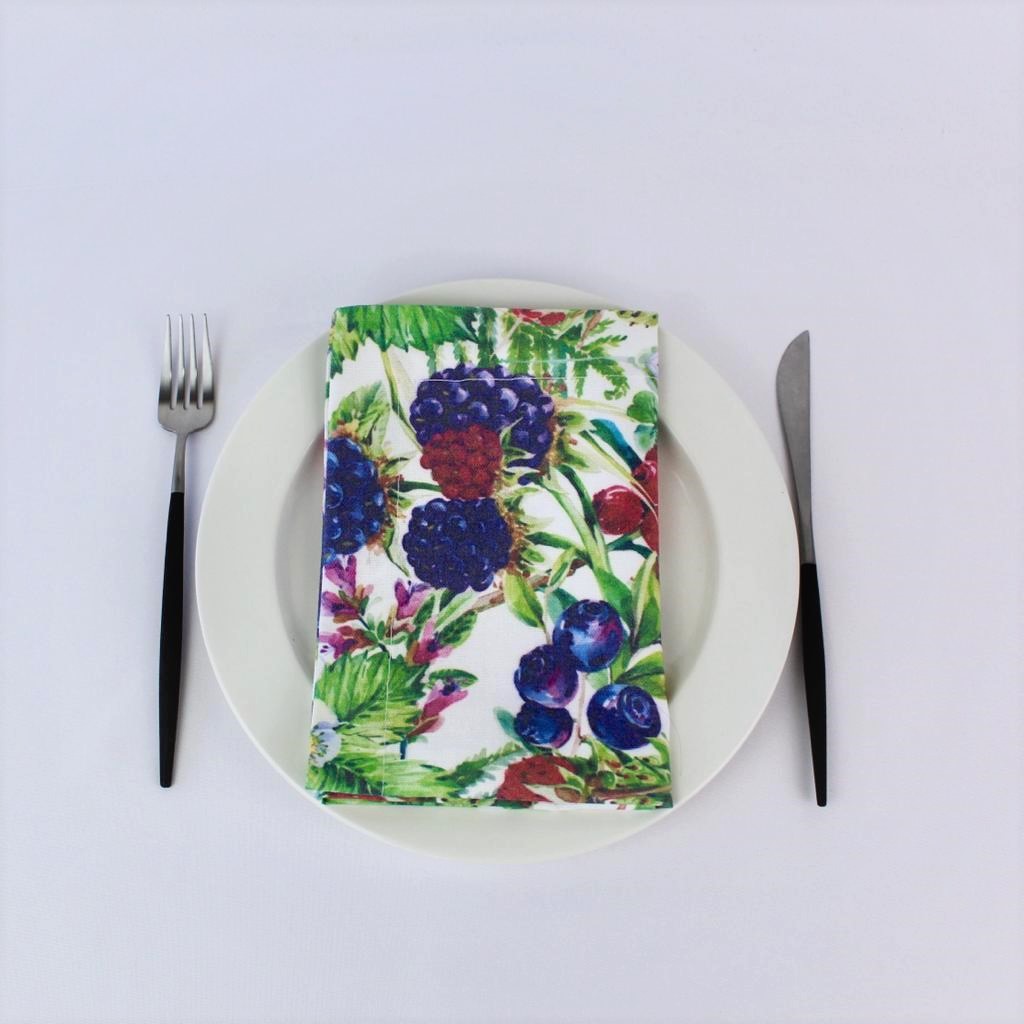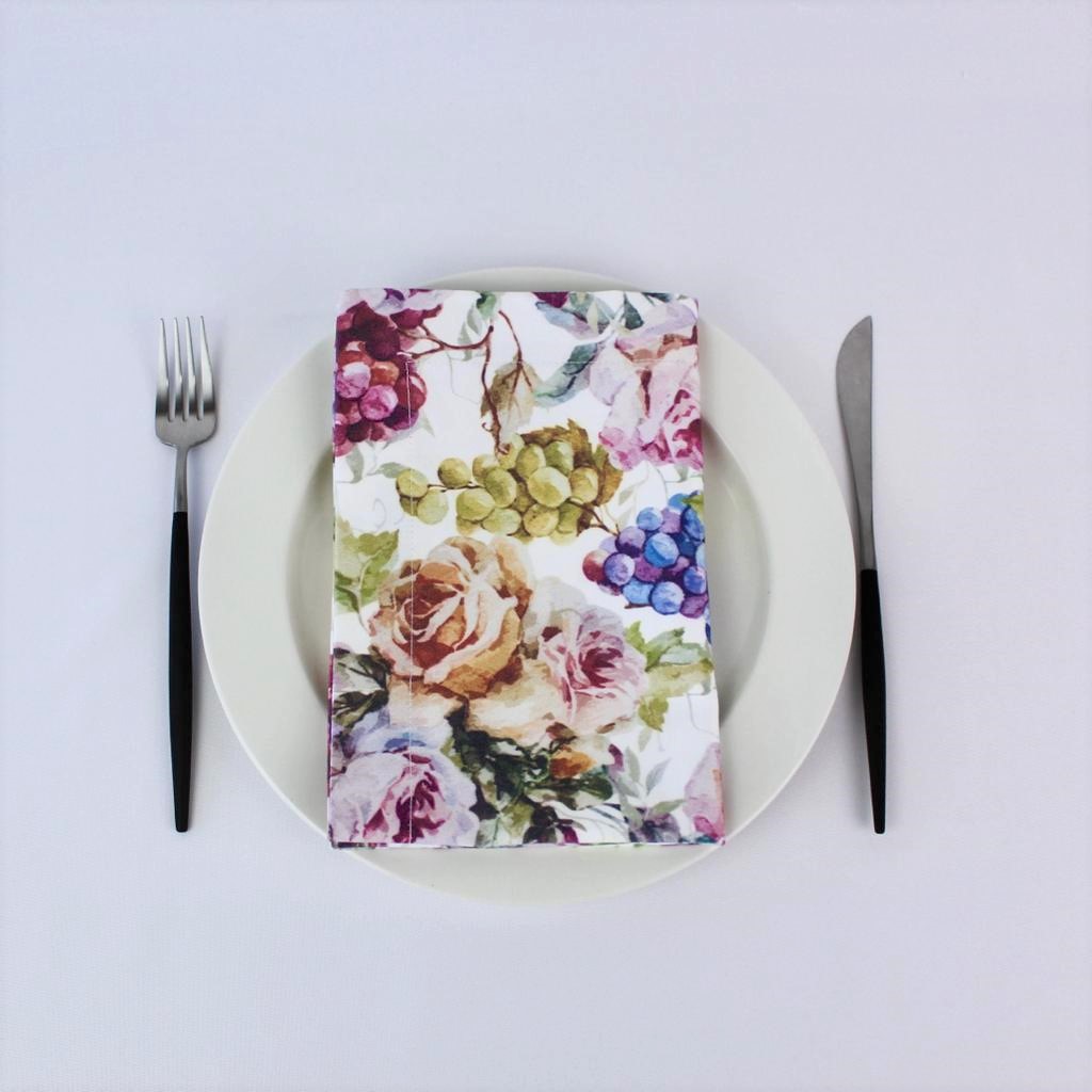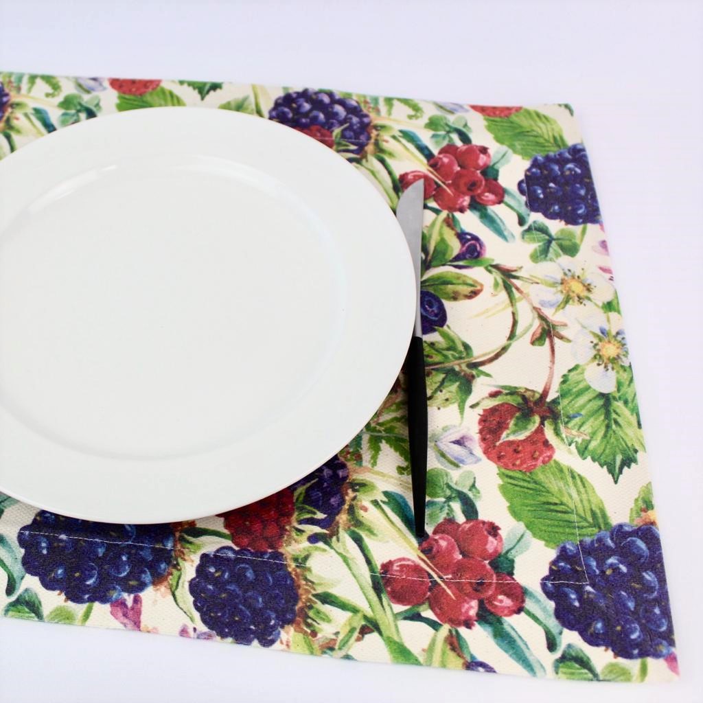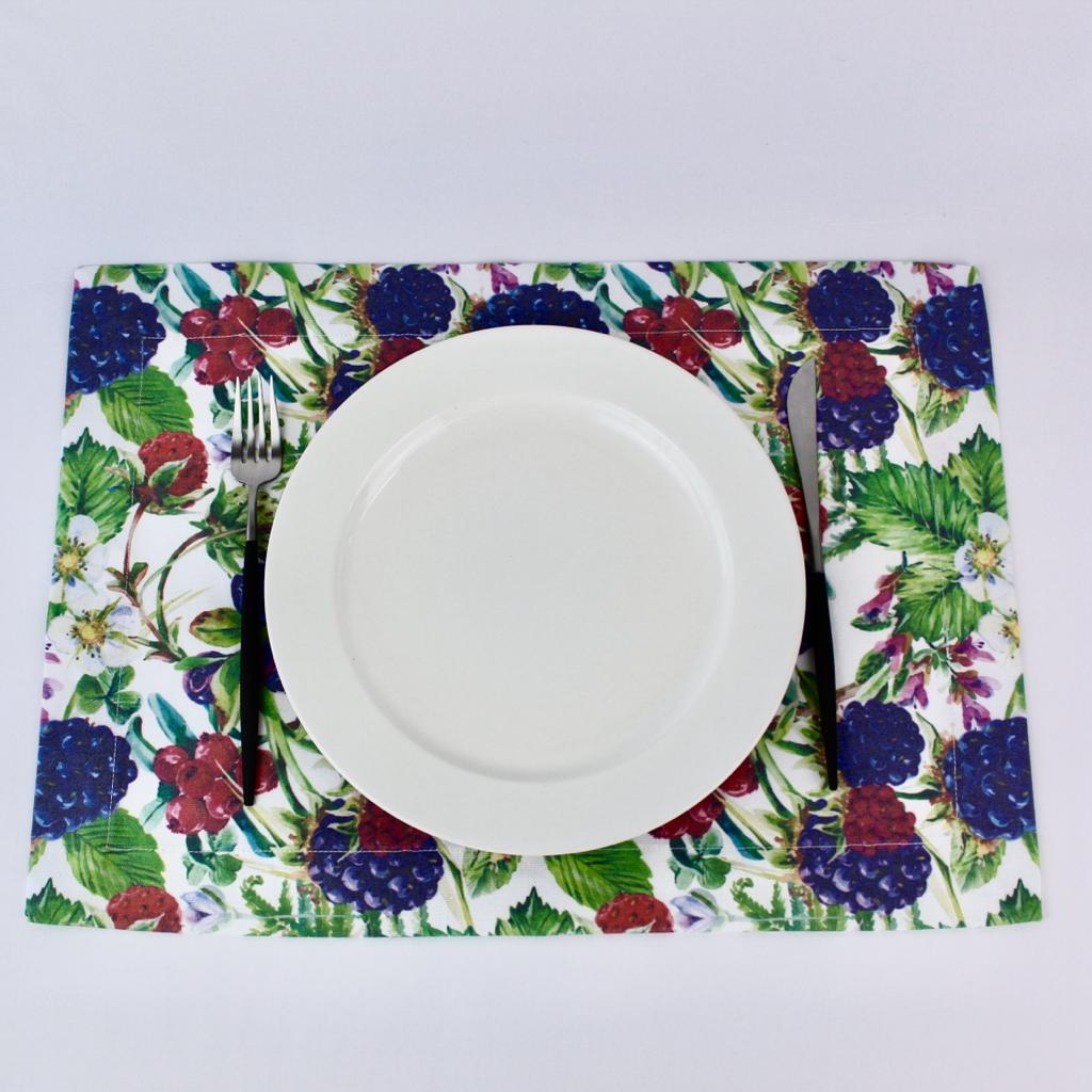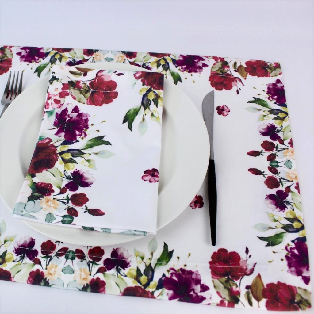 Individual de mesa e guardanapo em algodão com acabamento em bainha Inglesa.