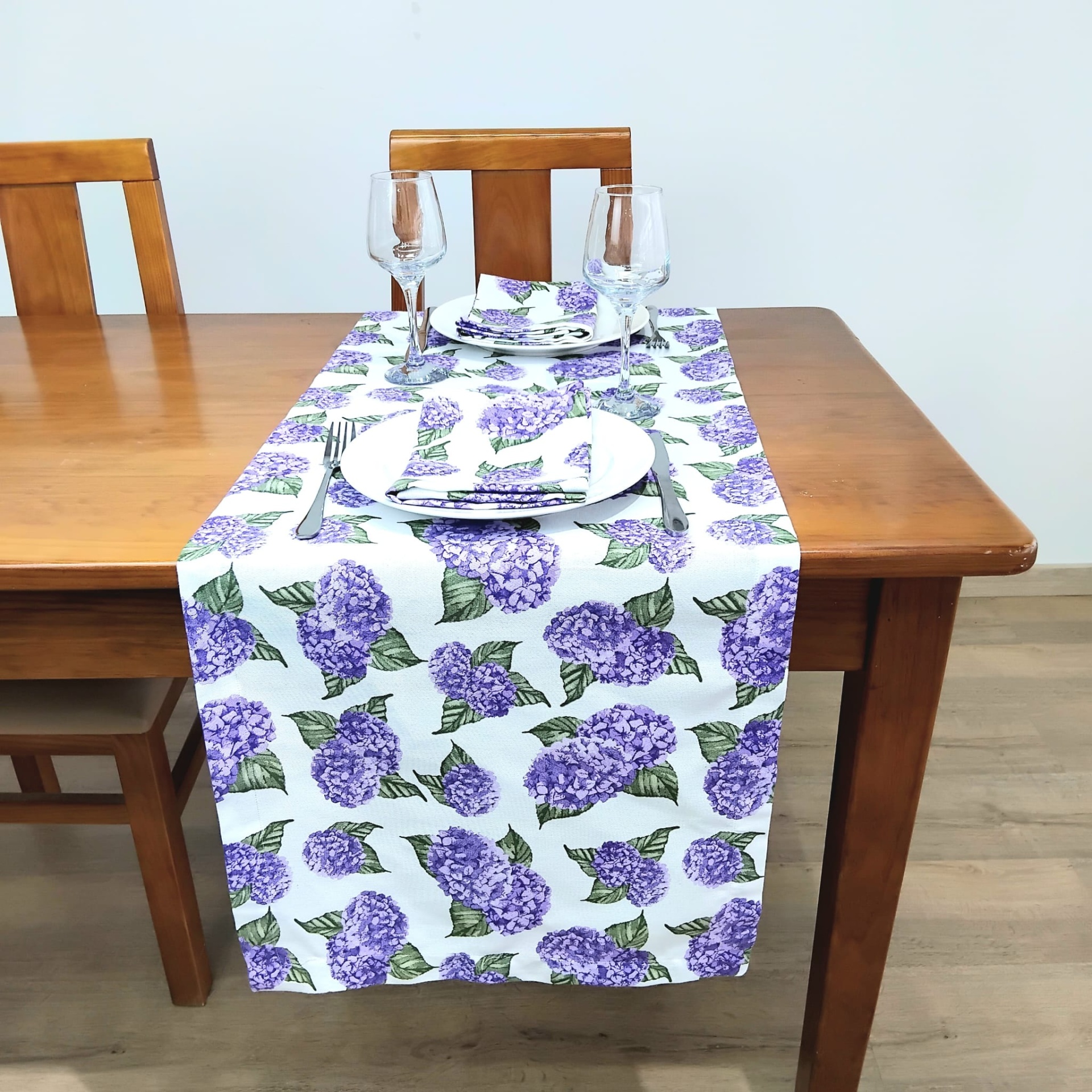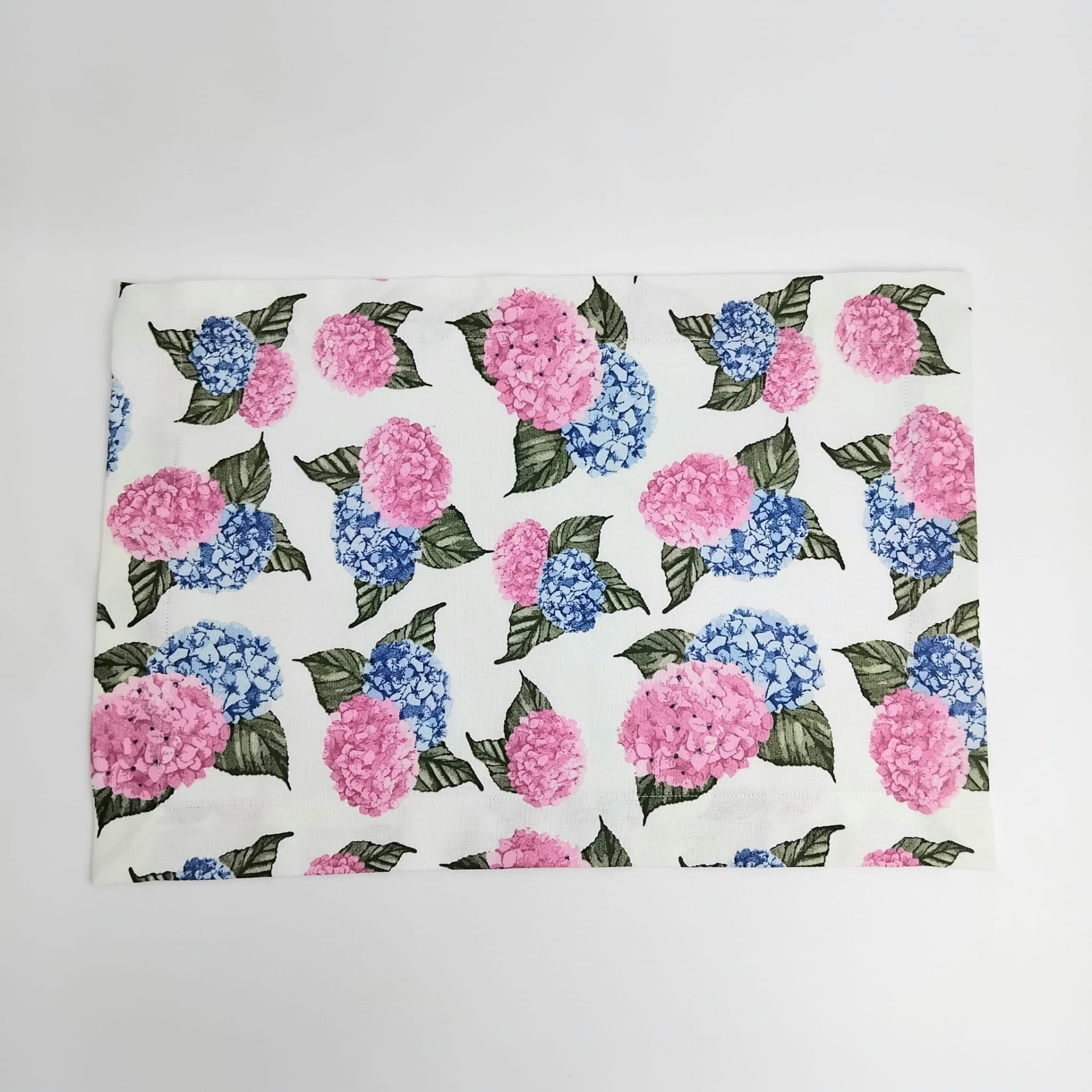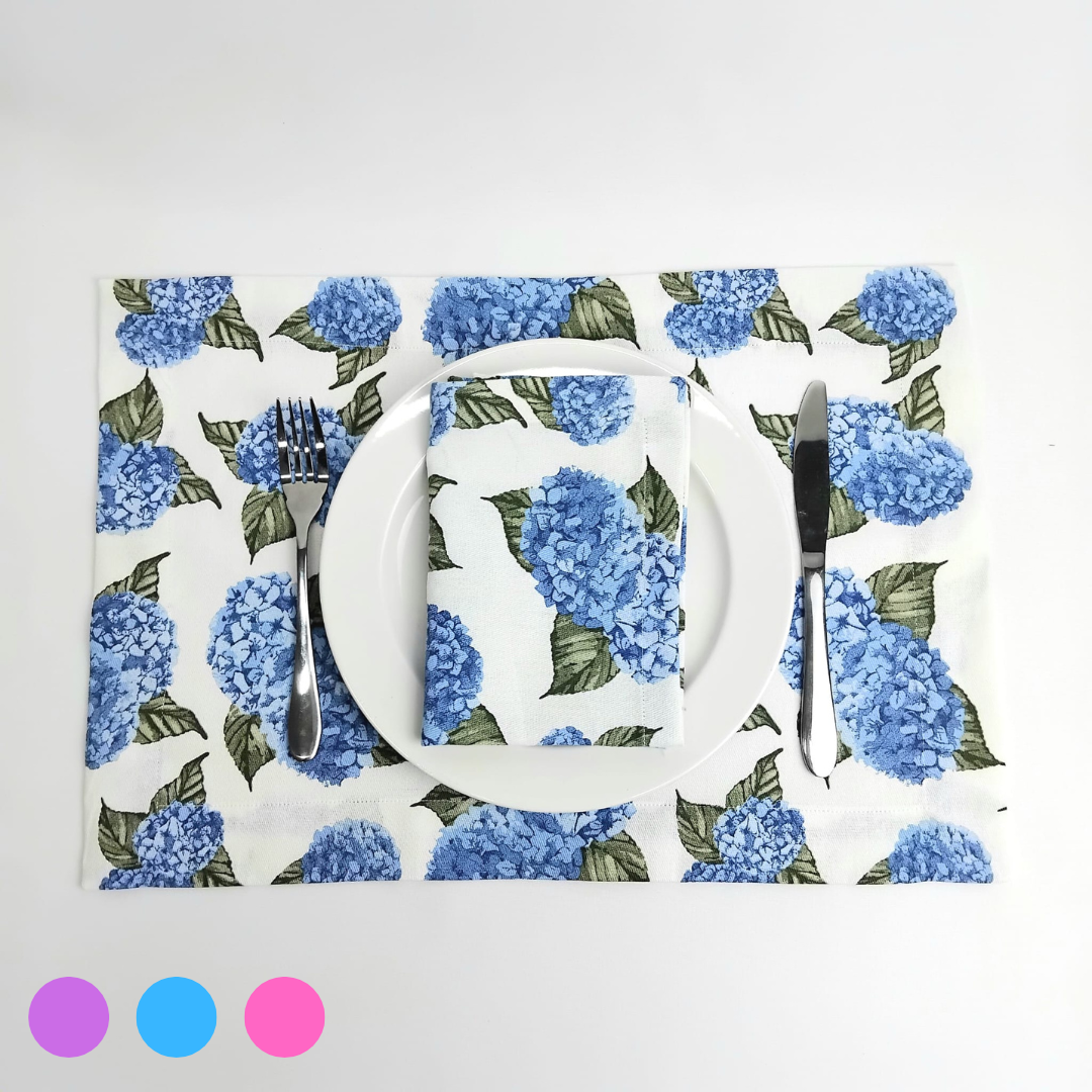 Individual de mesa, guardanapo e caminho de mesa em algodão com estampado de flores, hortênsias.  Disponivel em várias cores.