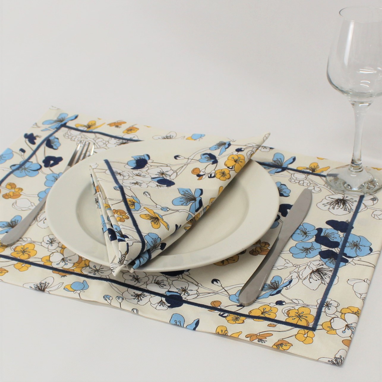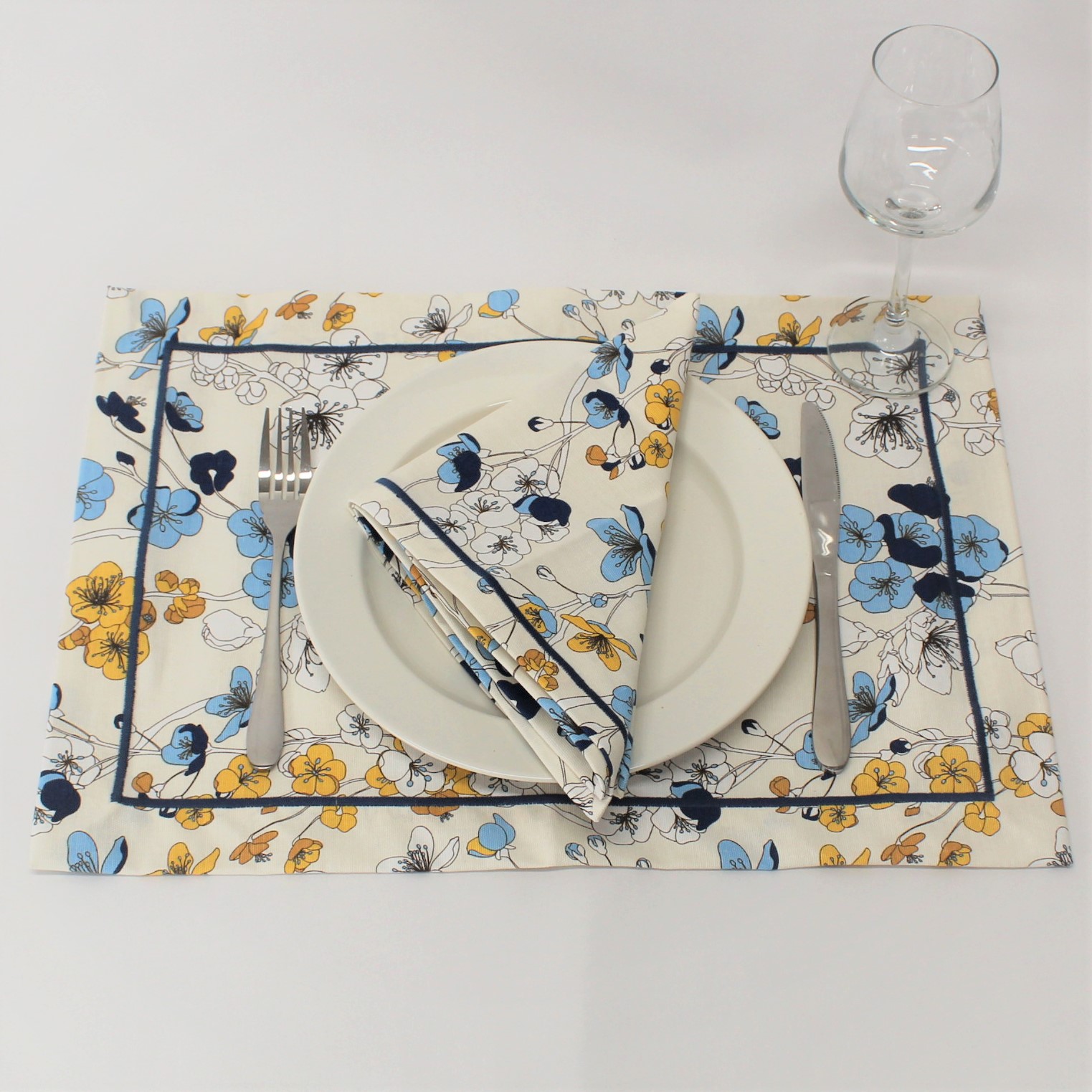 Individual de mesa e guardanapo e caminho de mesa em algodão com estampado coleção Spring com acabamento em rolinho Azul.
