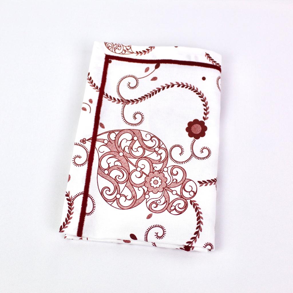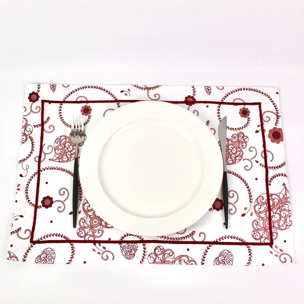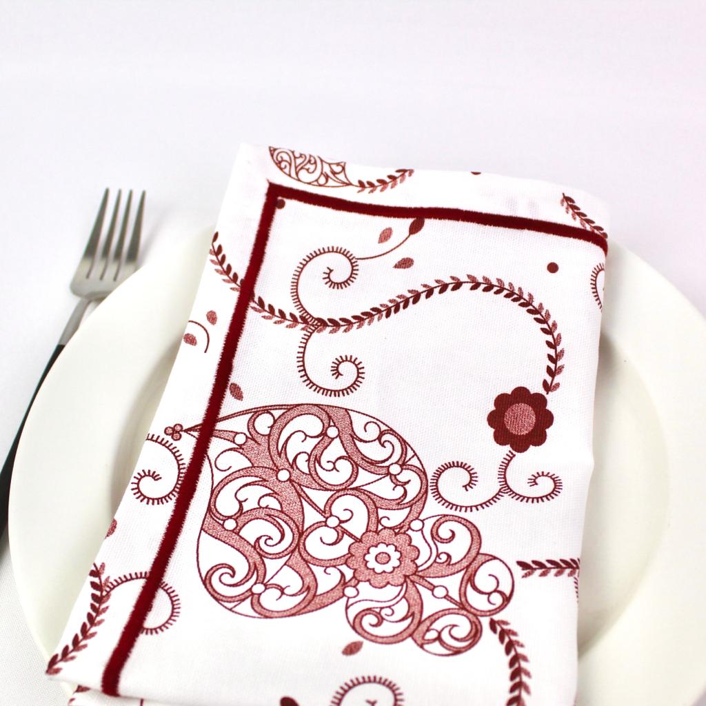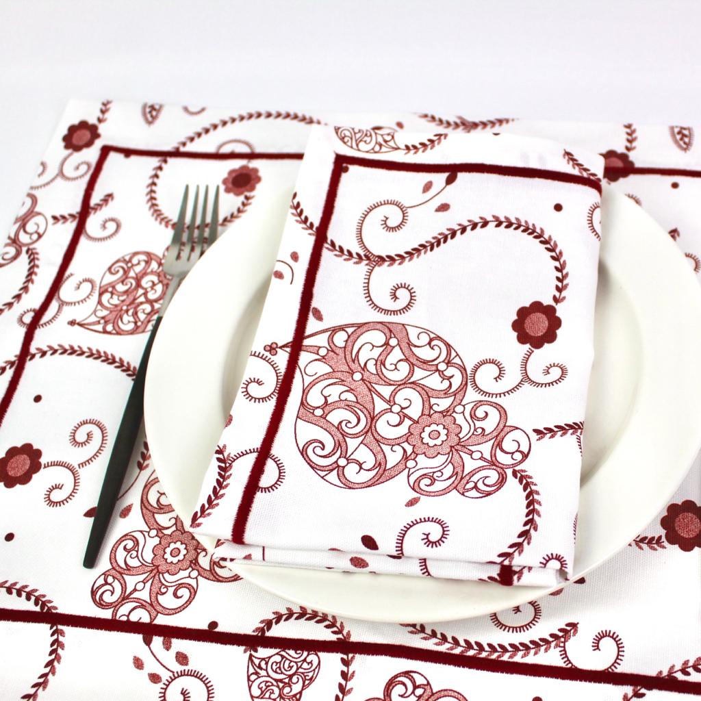 Individual de mesa e guardanapo e caminho de mesa em algodão com estampado do Coração de Viana com acabamento em rolinho.
