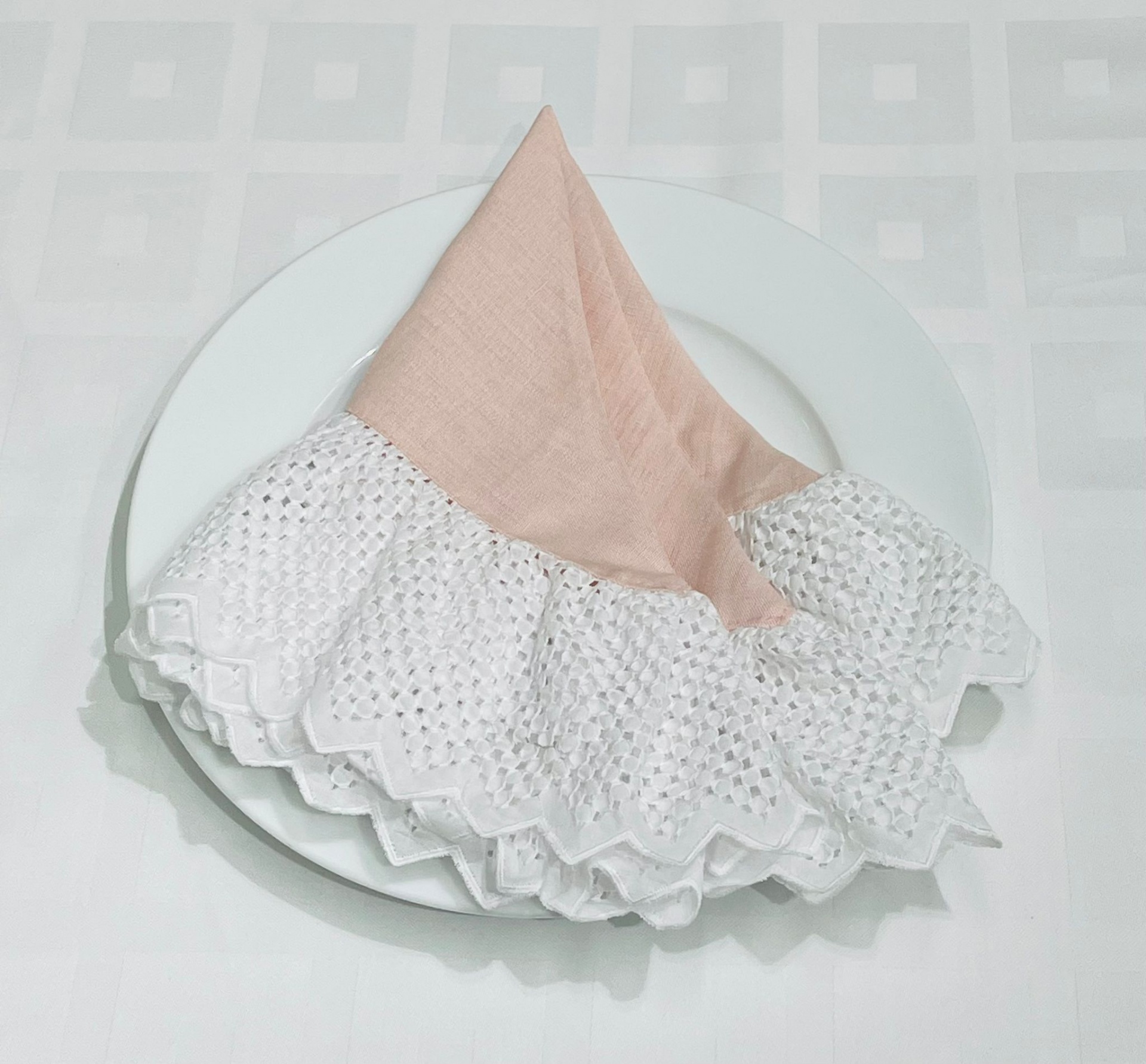 Individual de mesa e guardanapo em algodão com aplicação de renda.