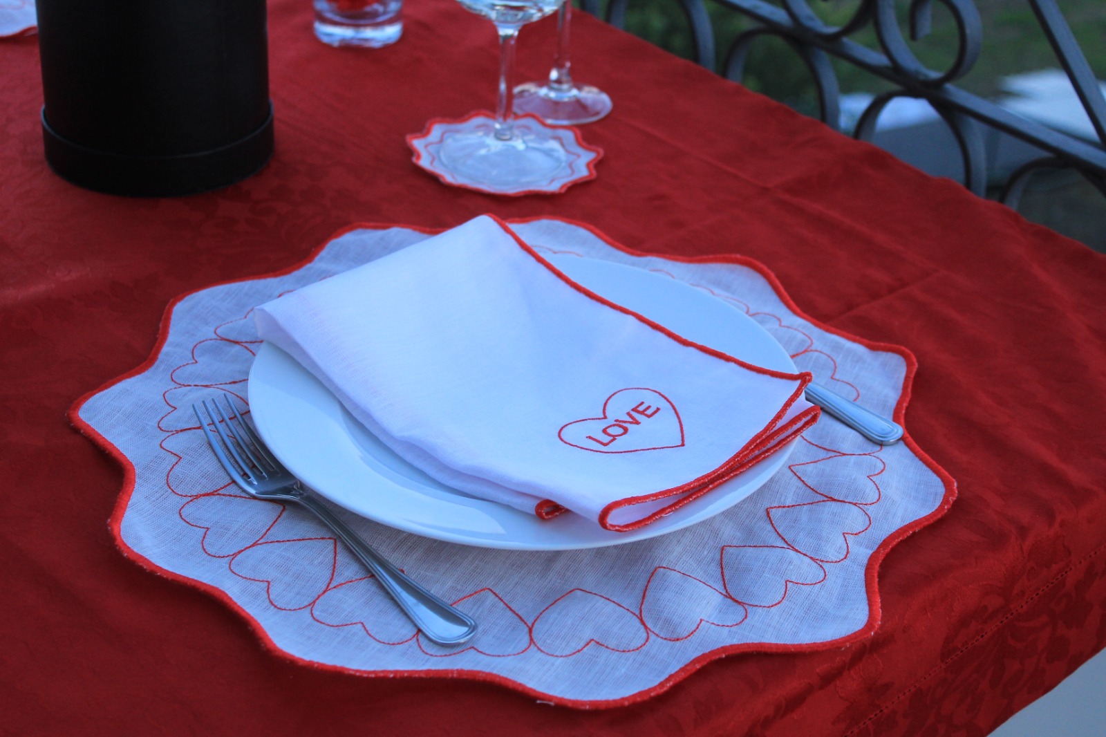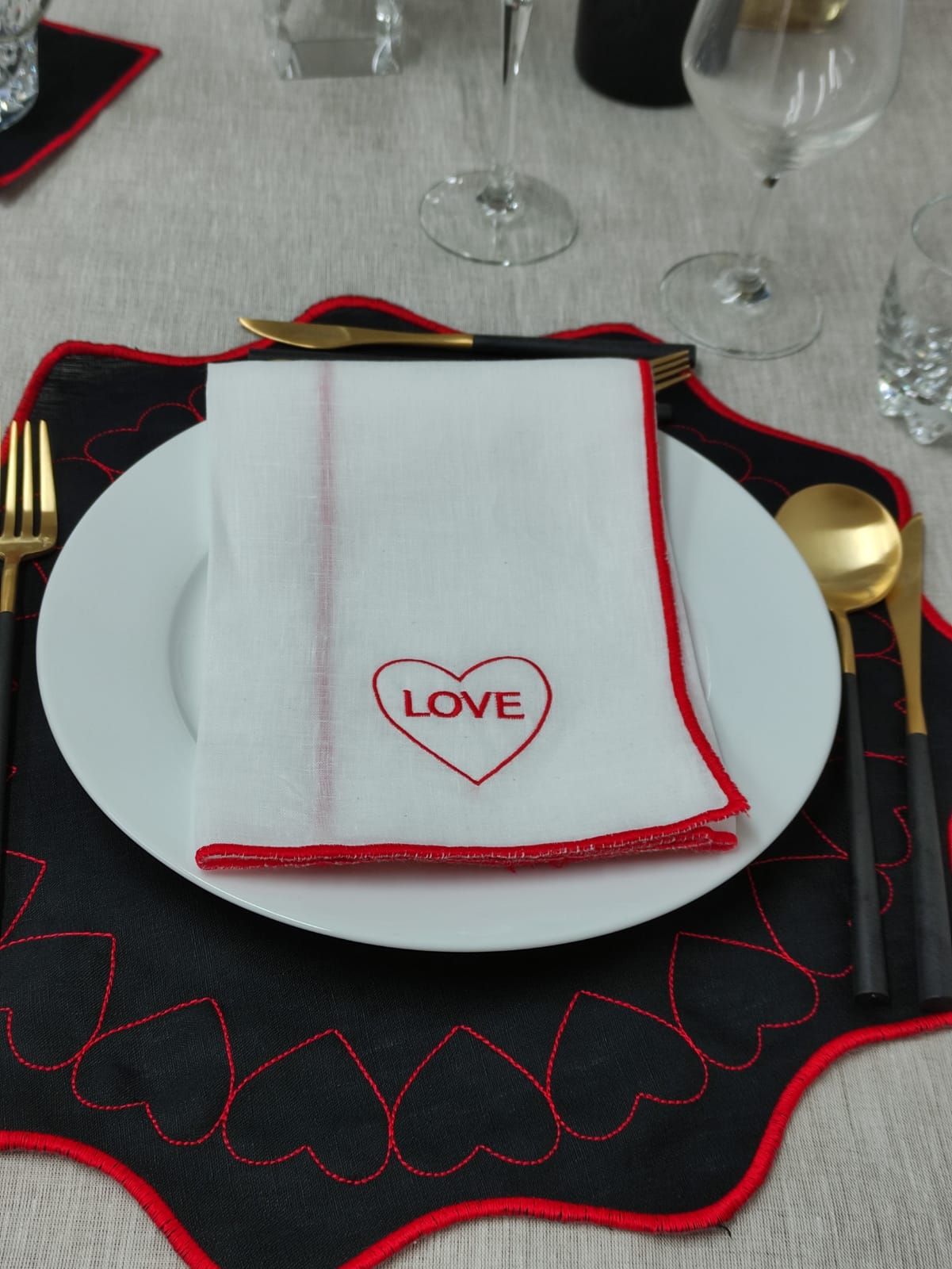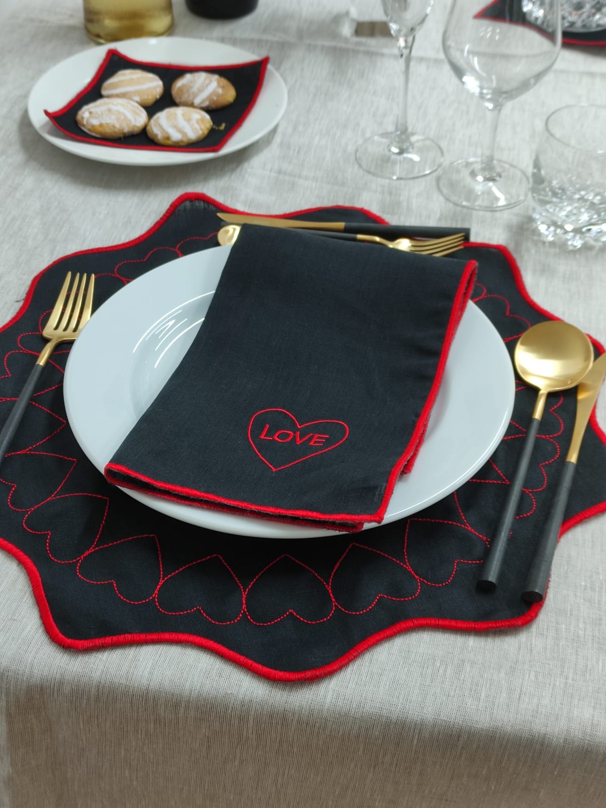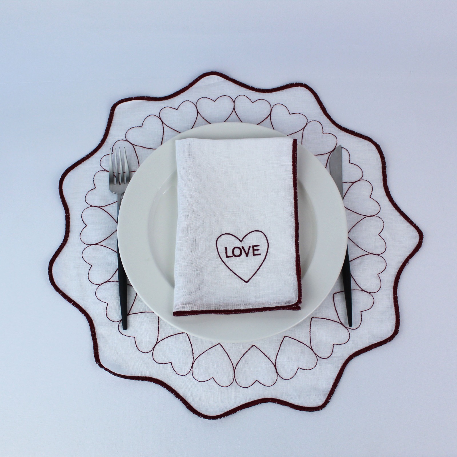 Coleção em linho, guardanapo e individual de mesa dedicada ao Amor.