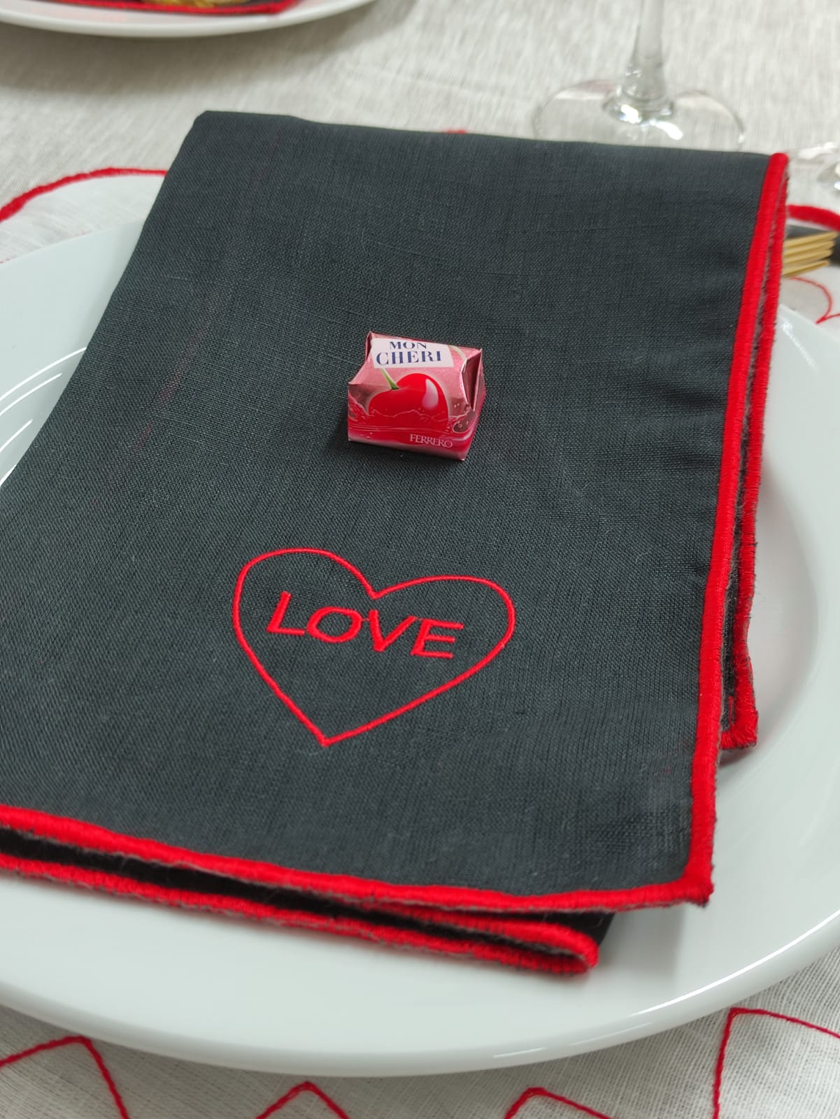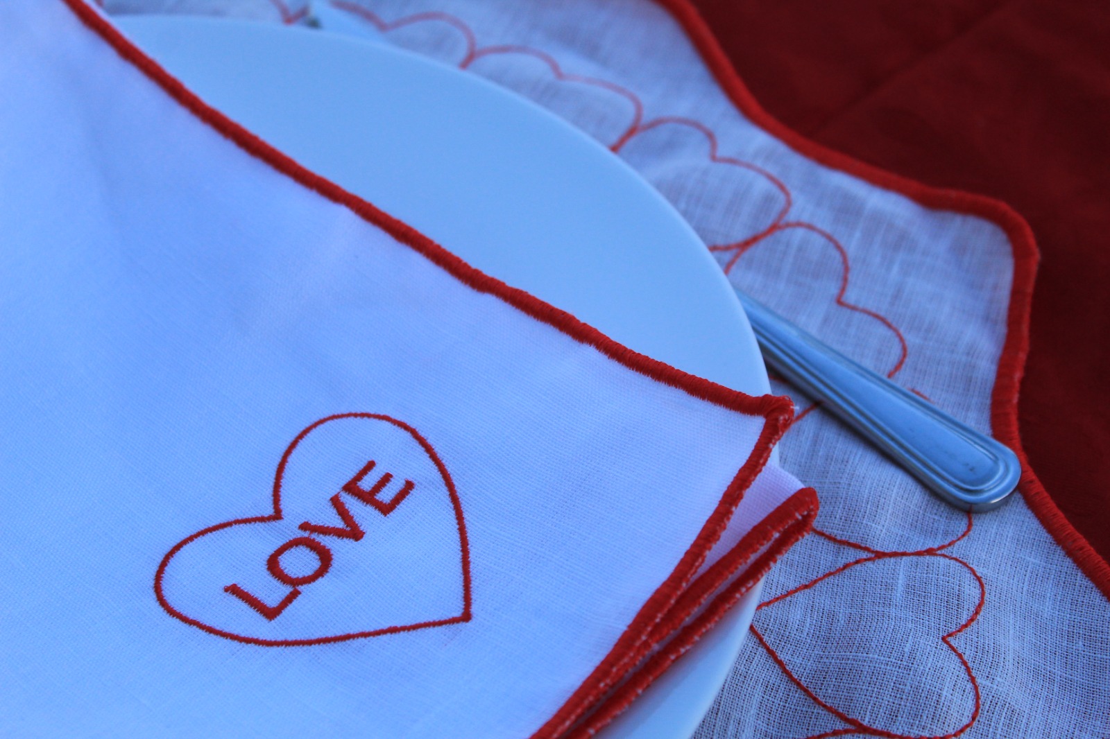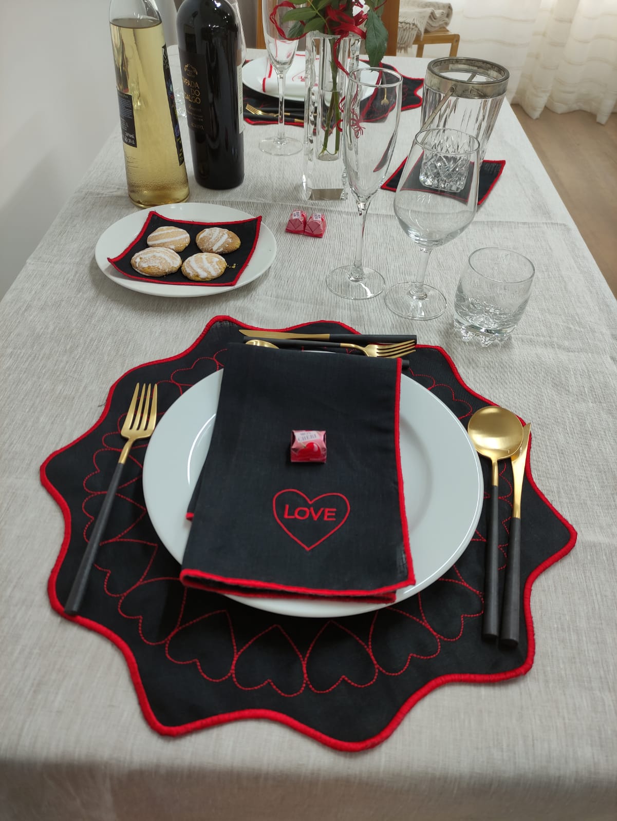 Coleção em linho, guardanapo e individual de mesa dedicada ao Amor.