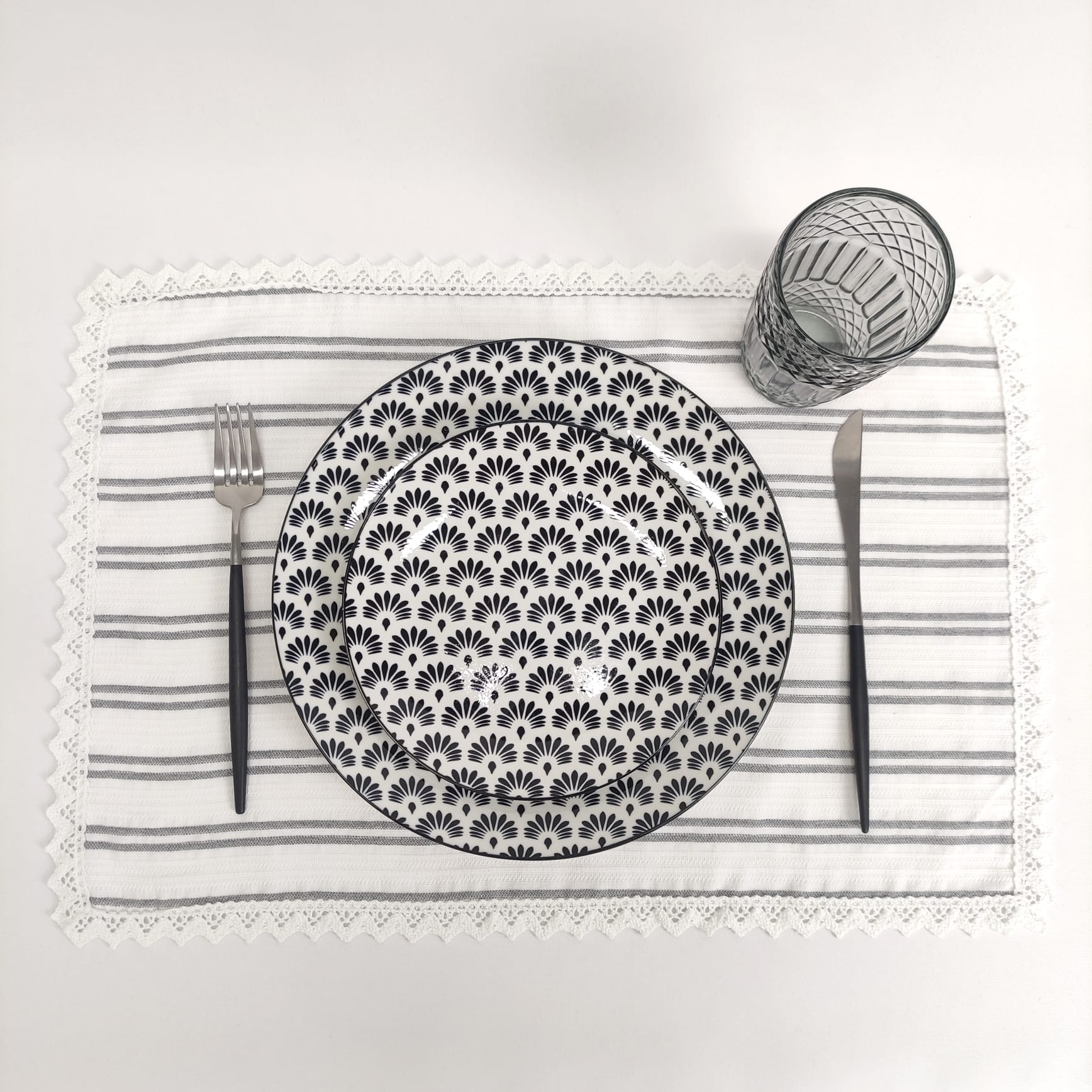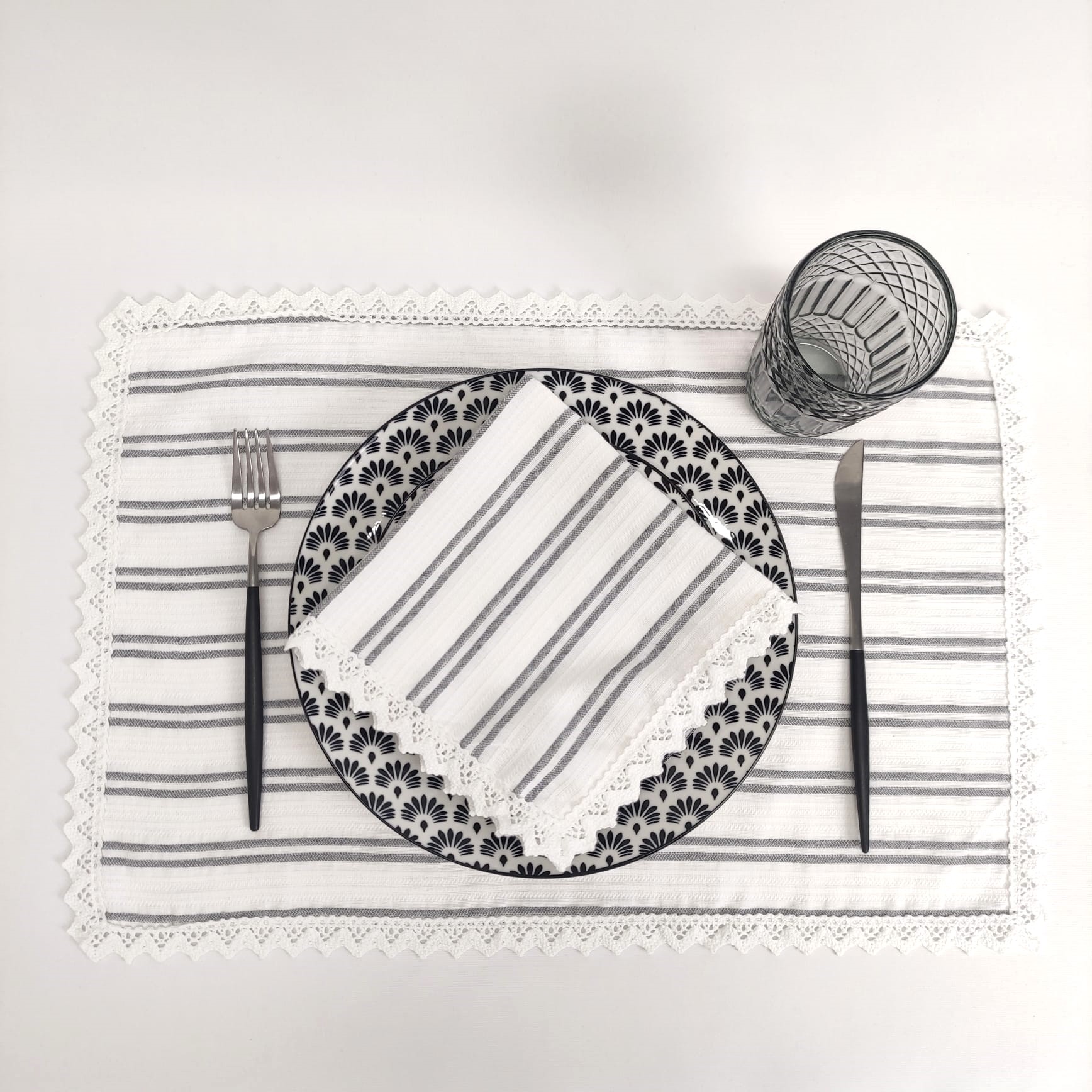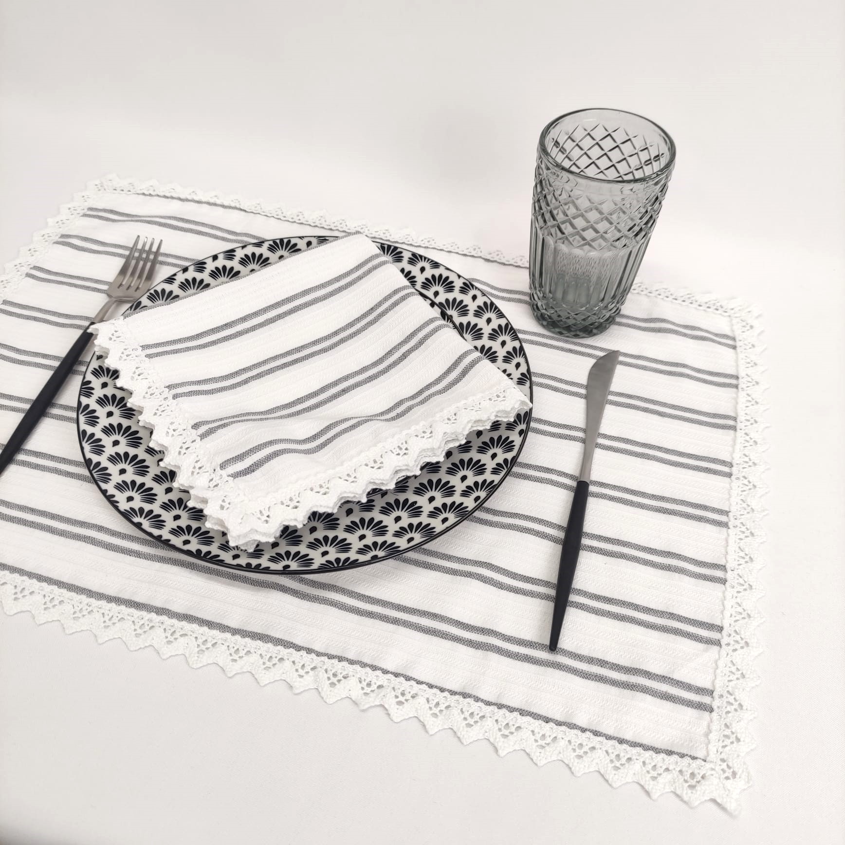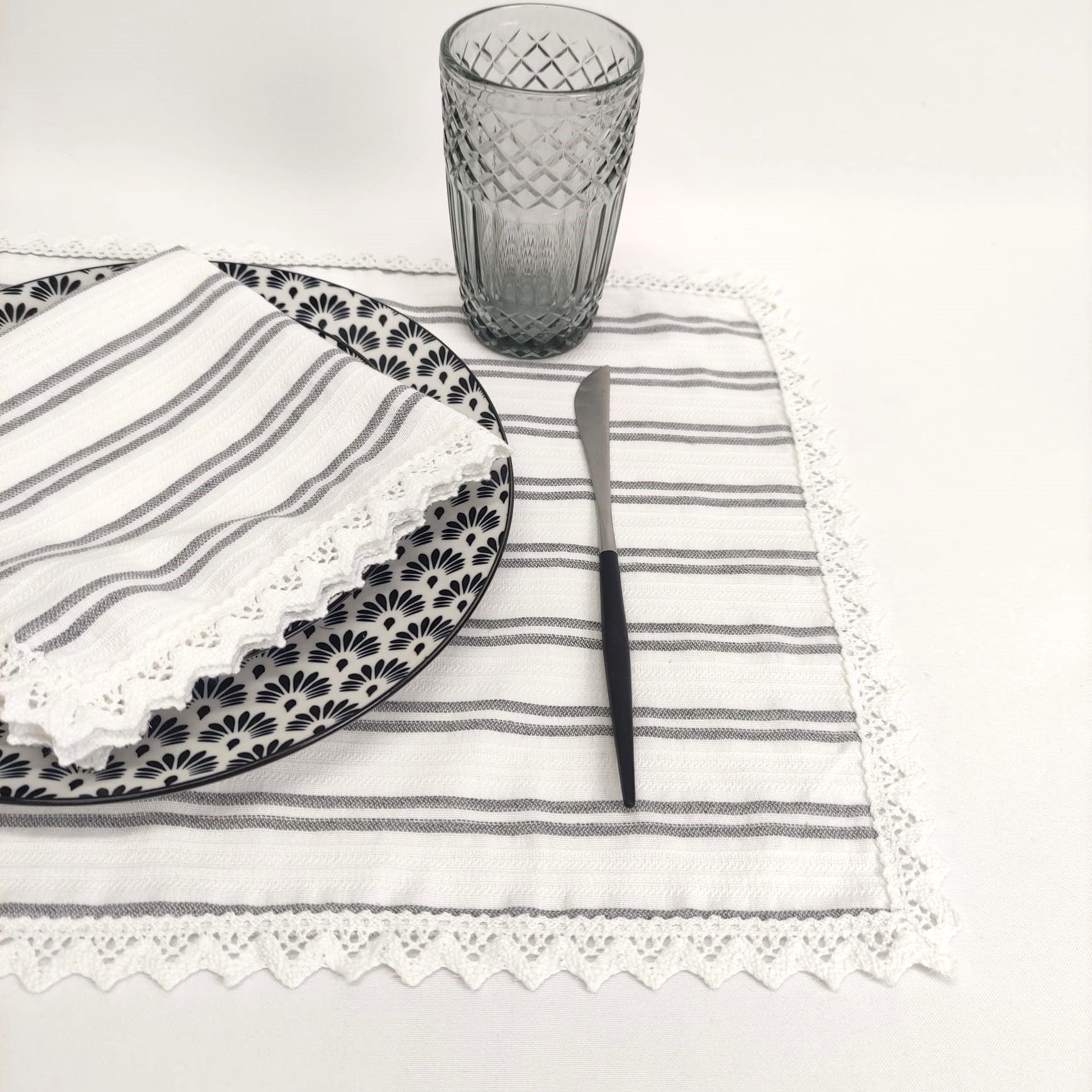Individual e Guardanapo Elegance em algodão com detalhe em renda, ideal para dar um toque de charme à sua mesa em ocasiões especiais.