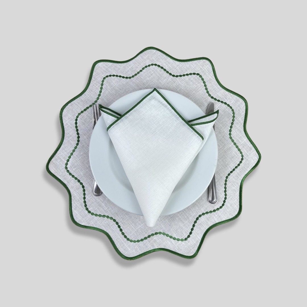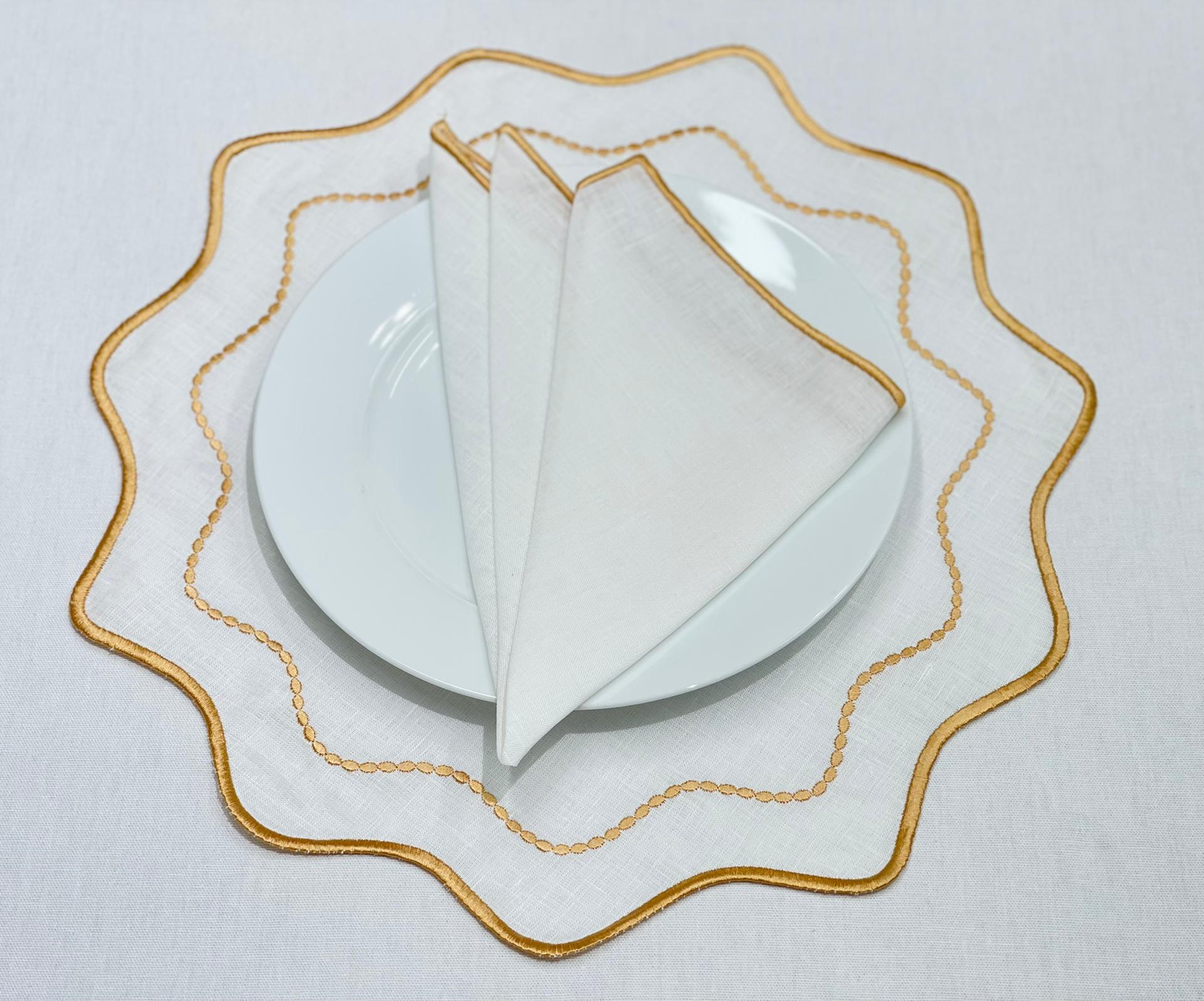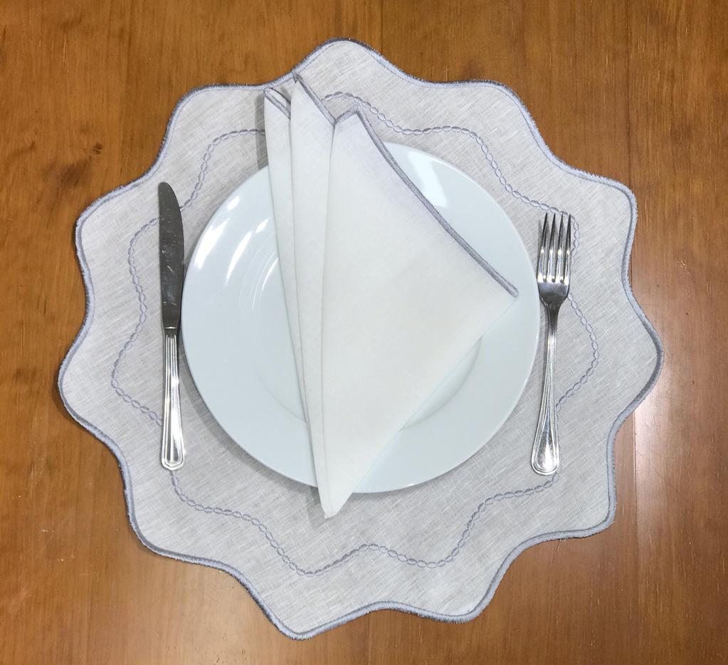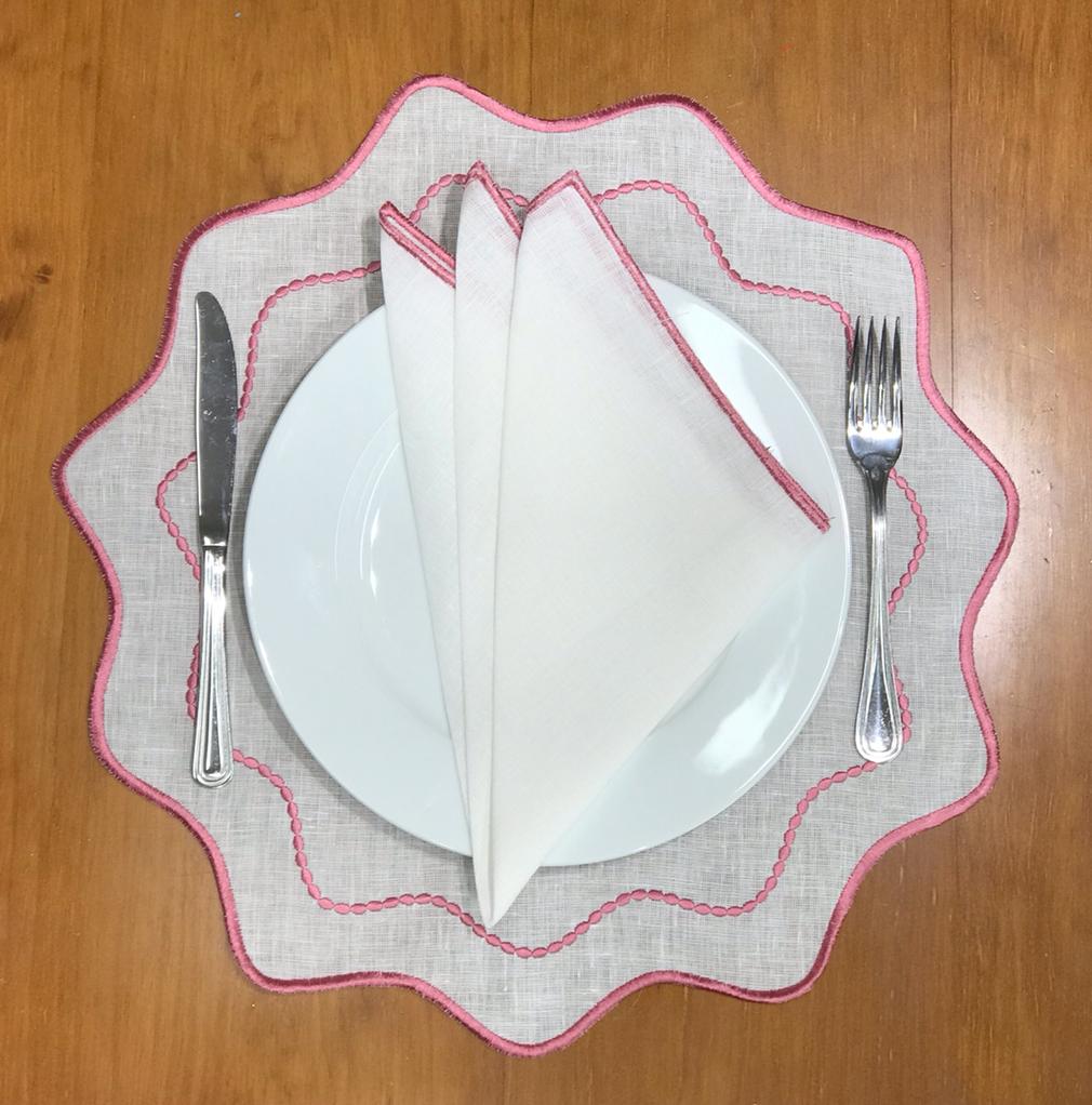Individual de mesa e guardanapo em linho branco/pérola com acabamento de rolinho.
