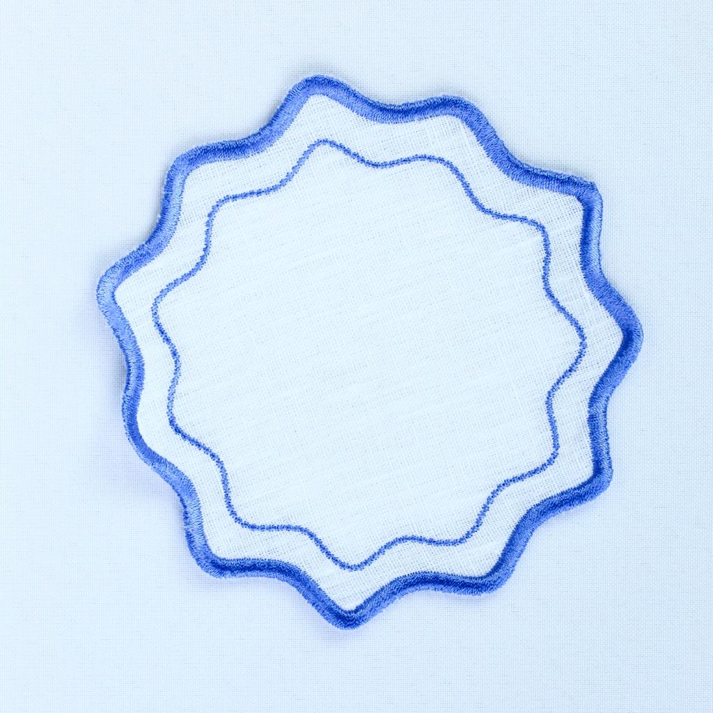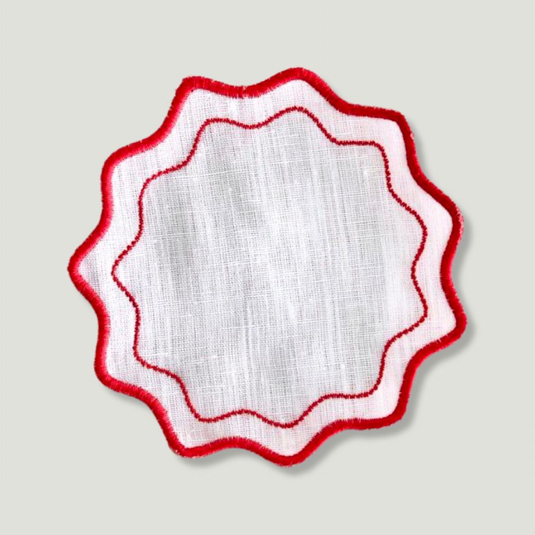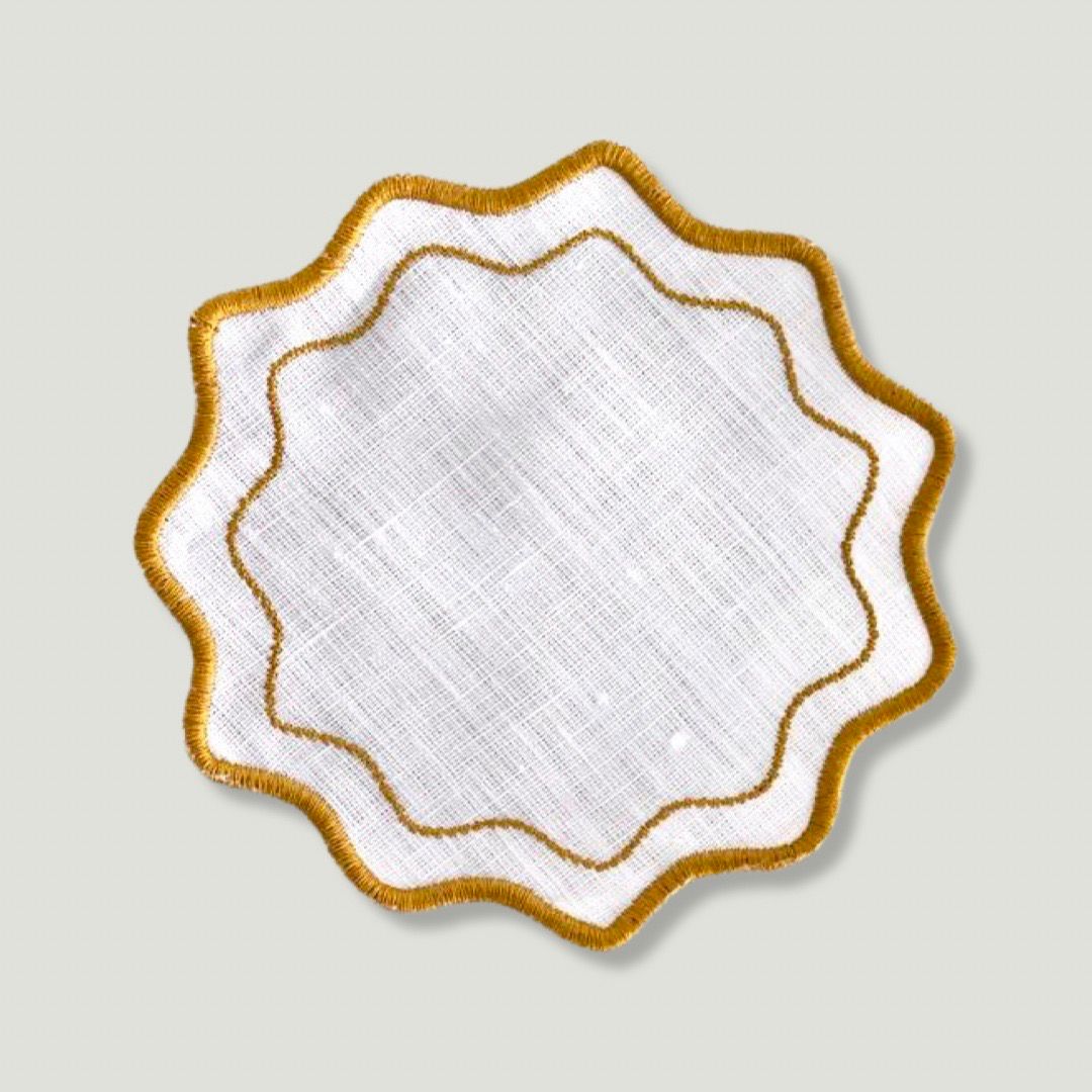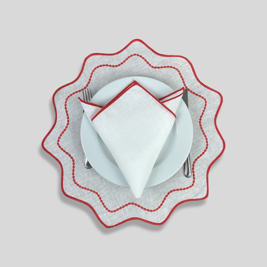 Individual de mesa e guardanapo em linho branco/pérola com acabamento de rolinho.