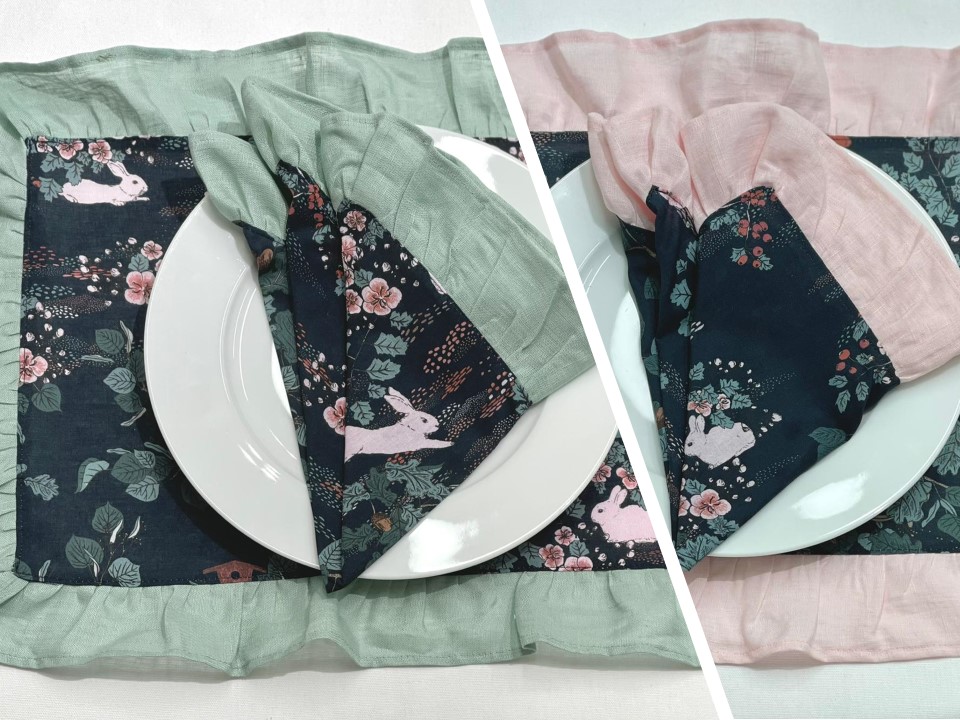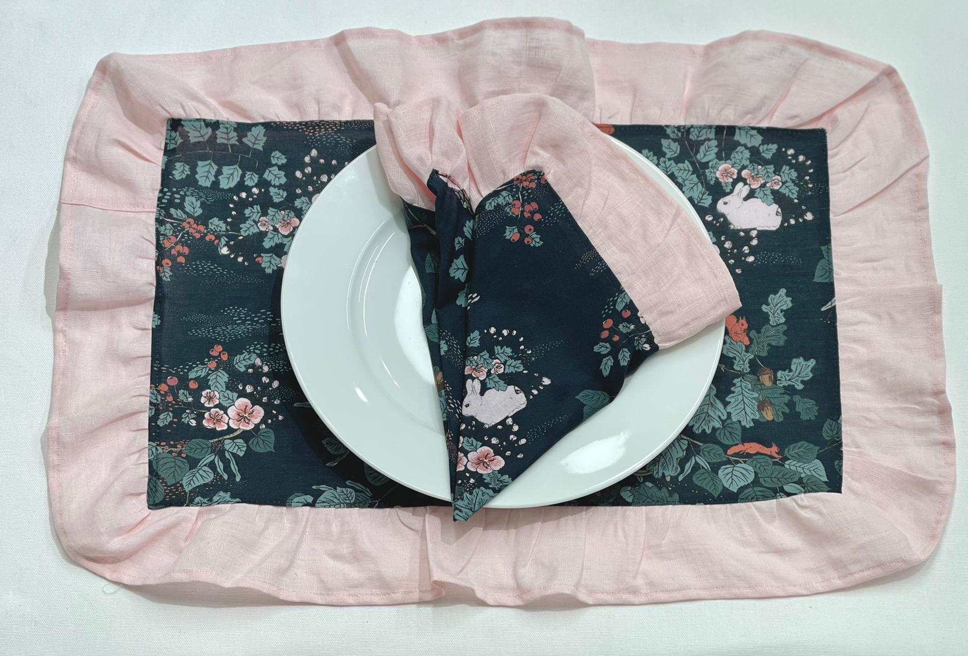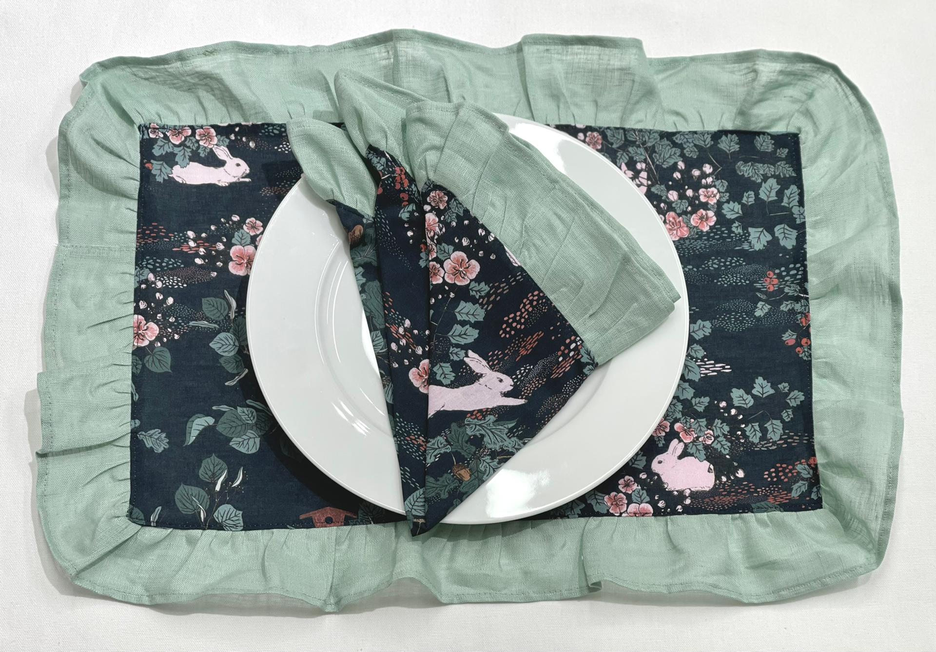 Individual de mesa e guardanapo em algodão com padrão coelho e bosque.