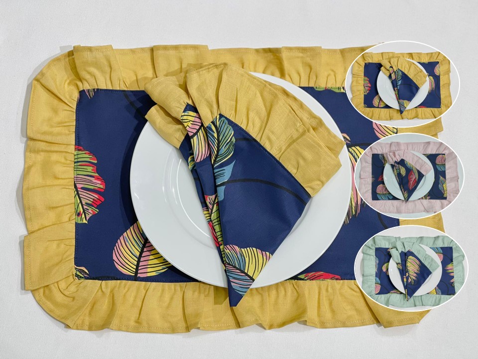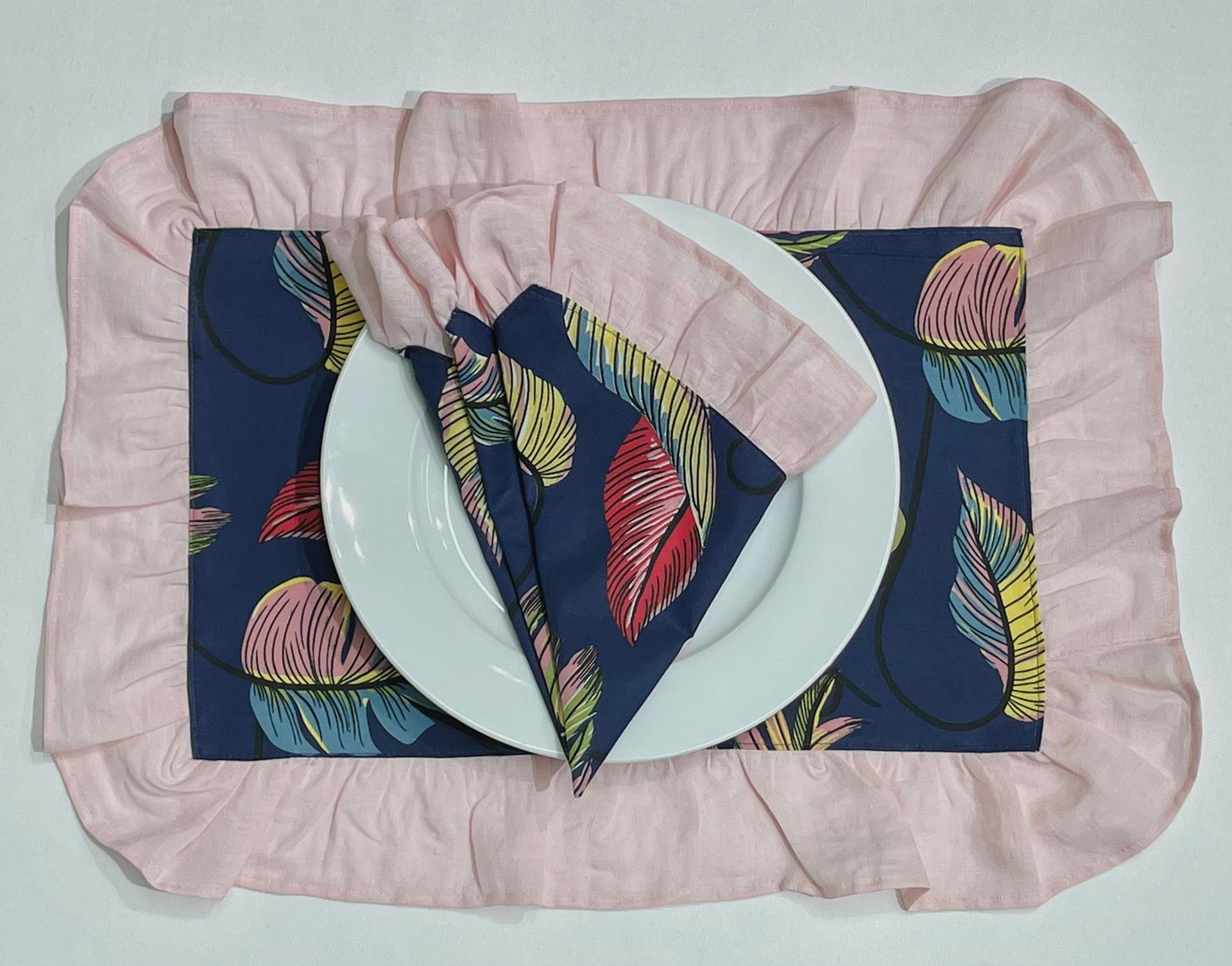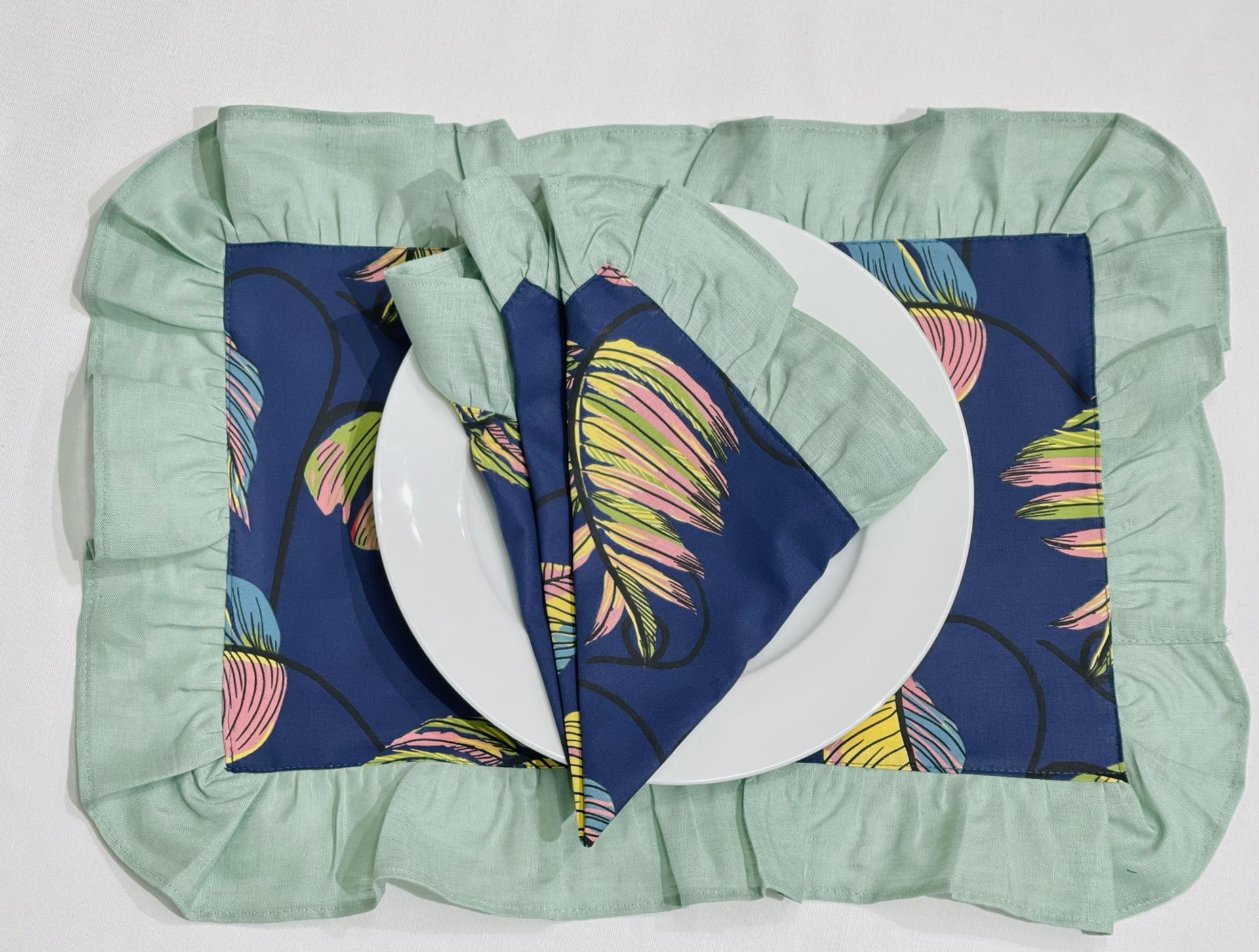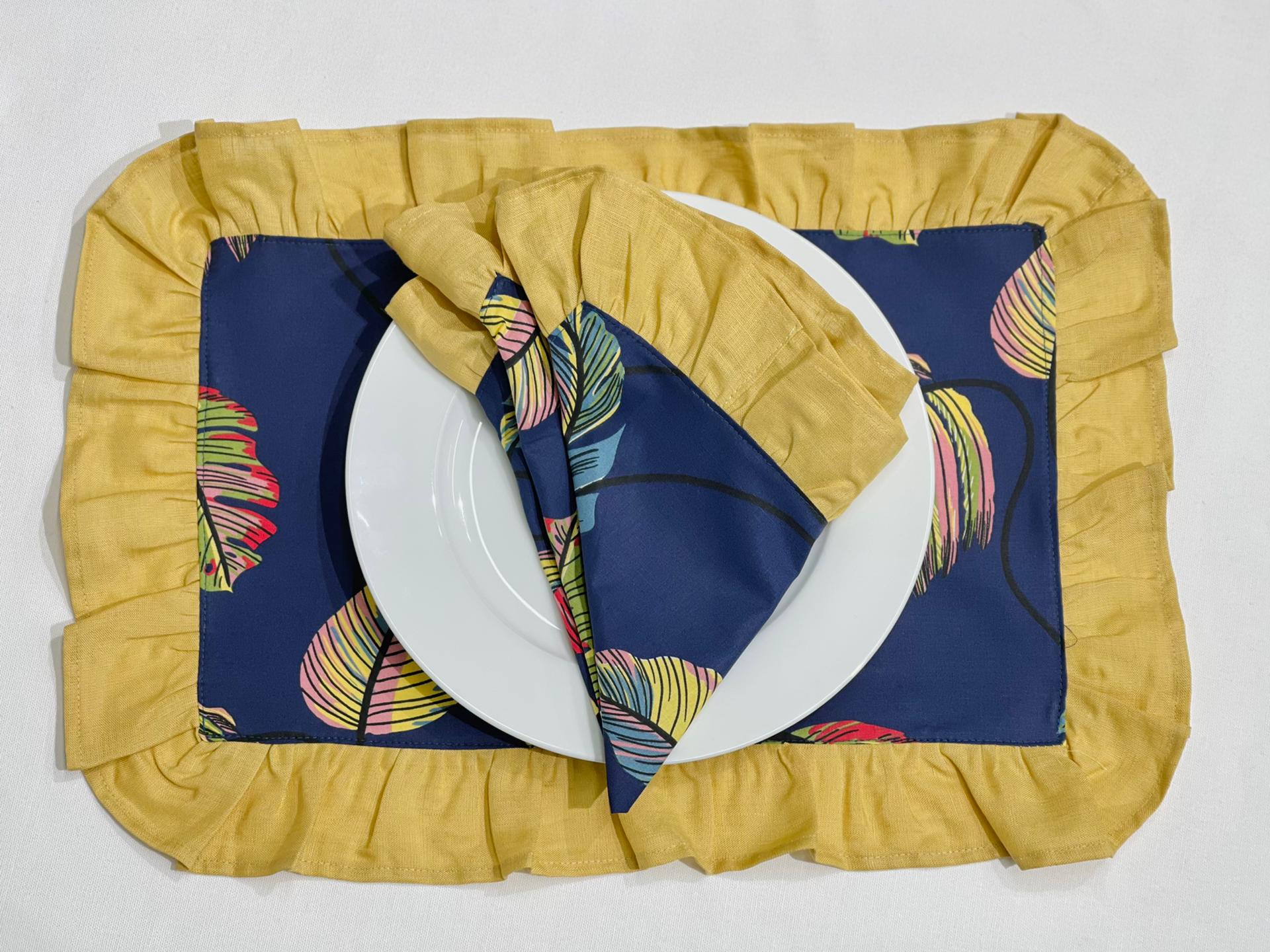 Individual de mesa e guardanapo em algodão com aplicação de folho em linho.