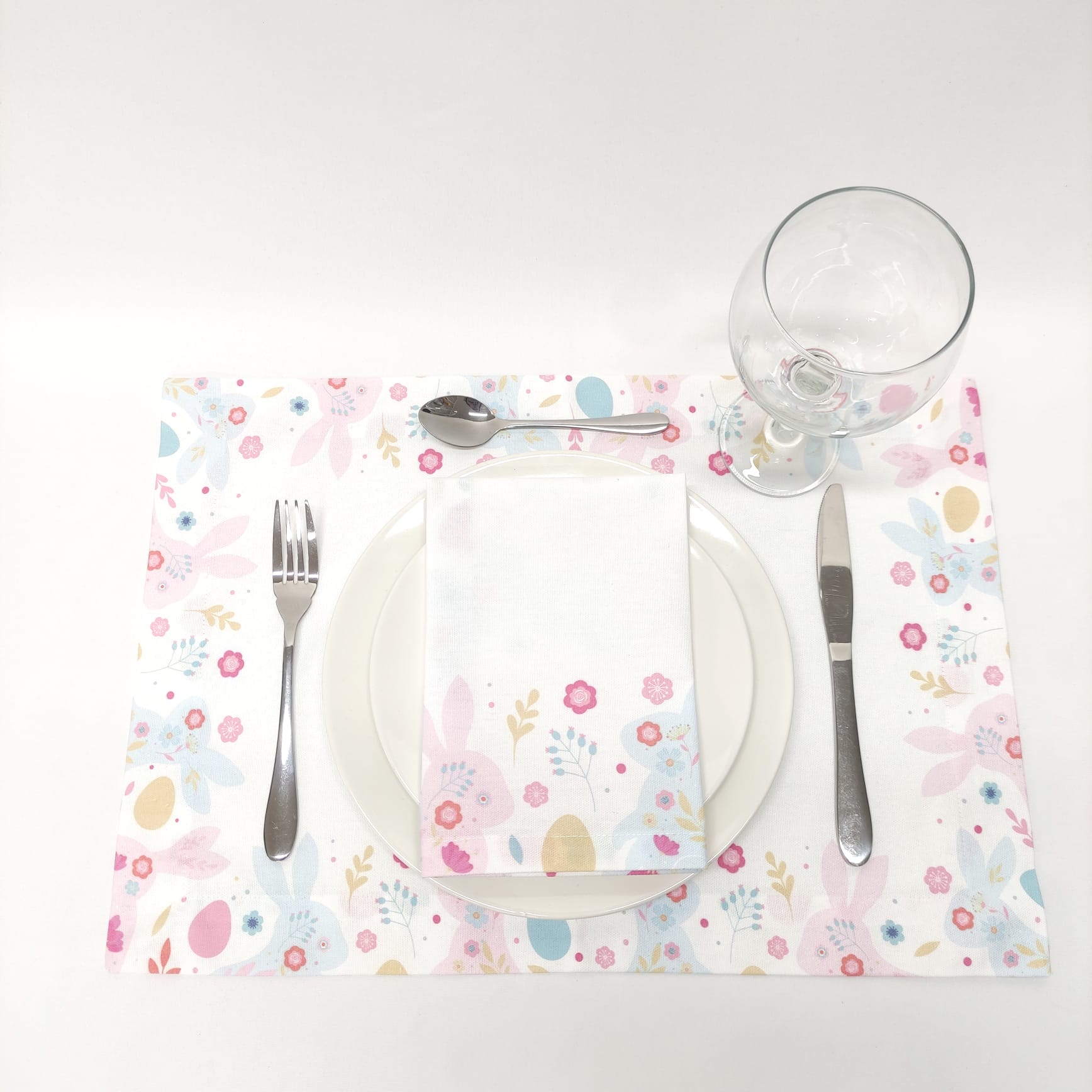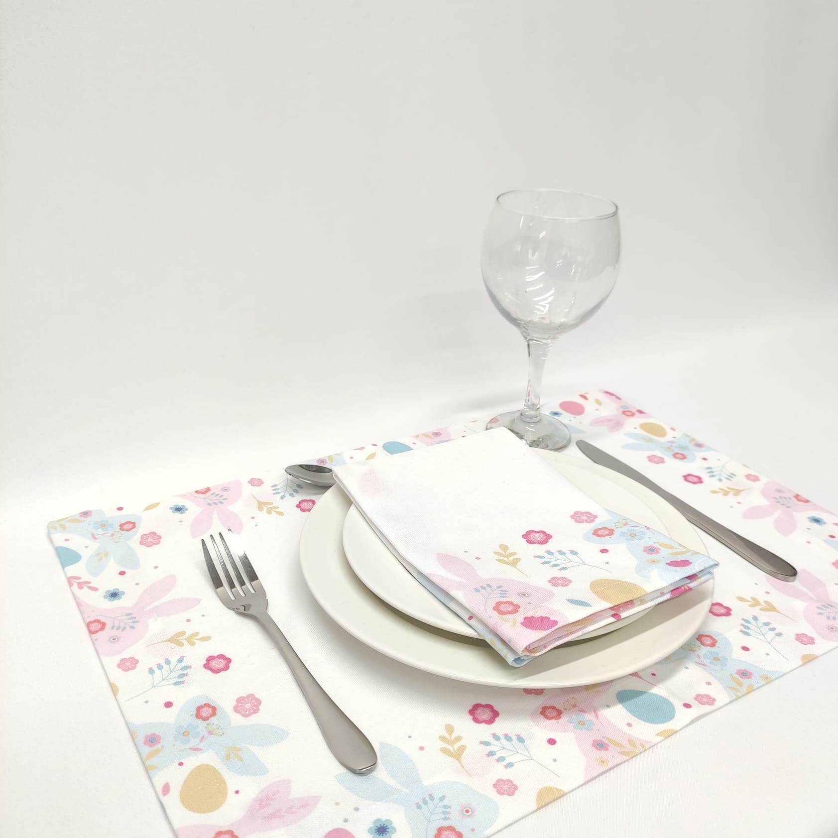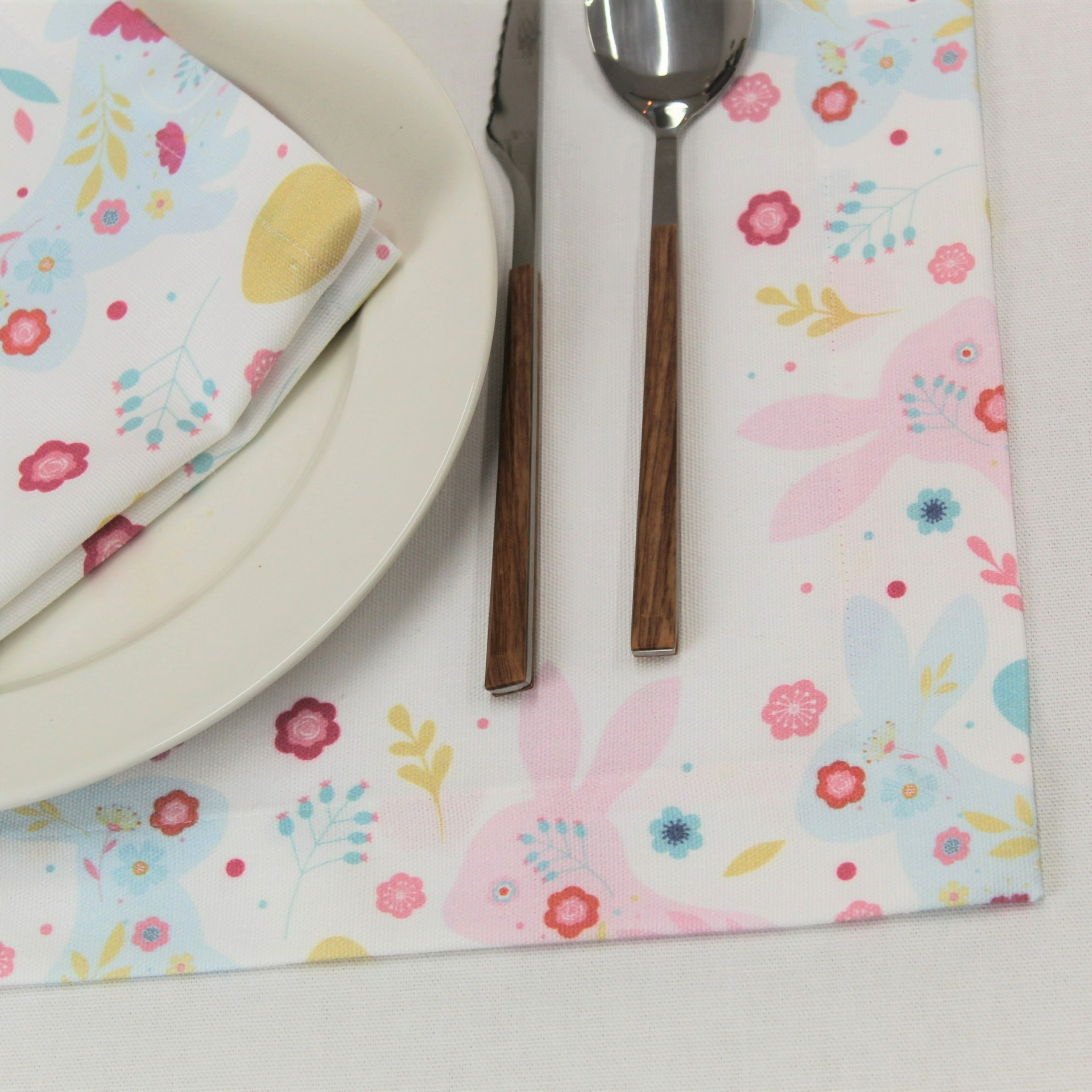 Individual de mesa, guardanapo e caminho de mesa em algodão com estampado Digital do Coelho da Páscoa.