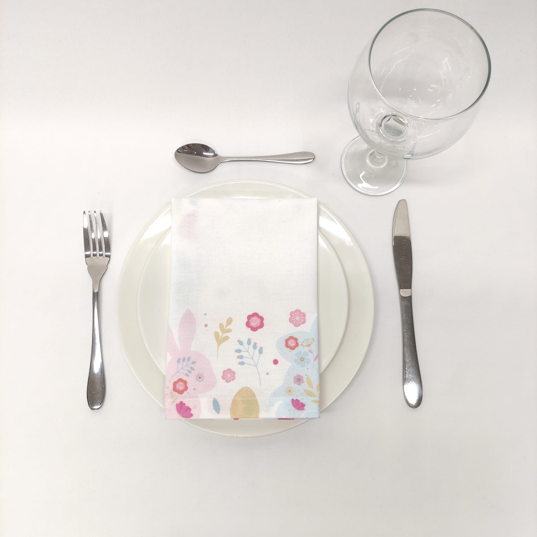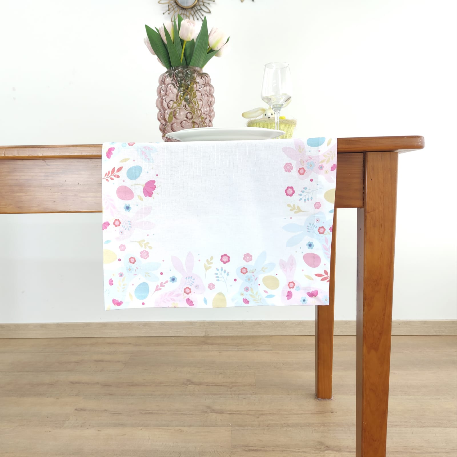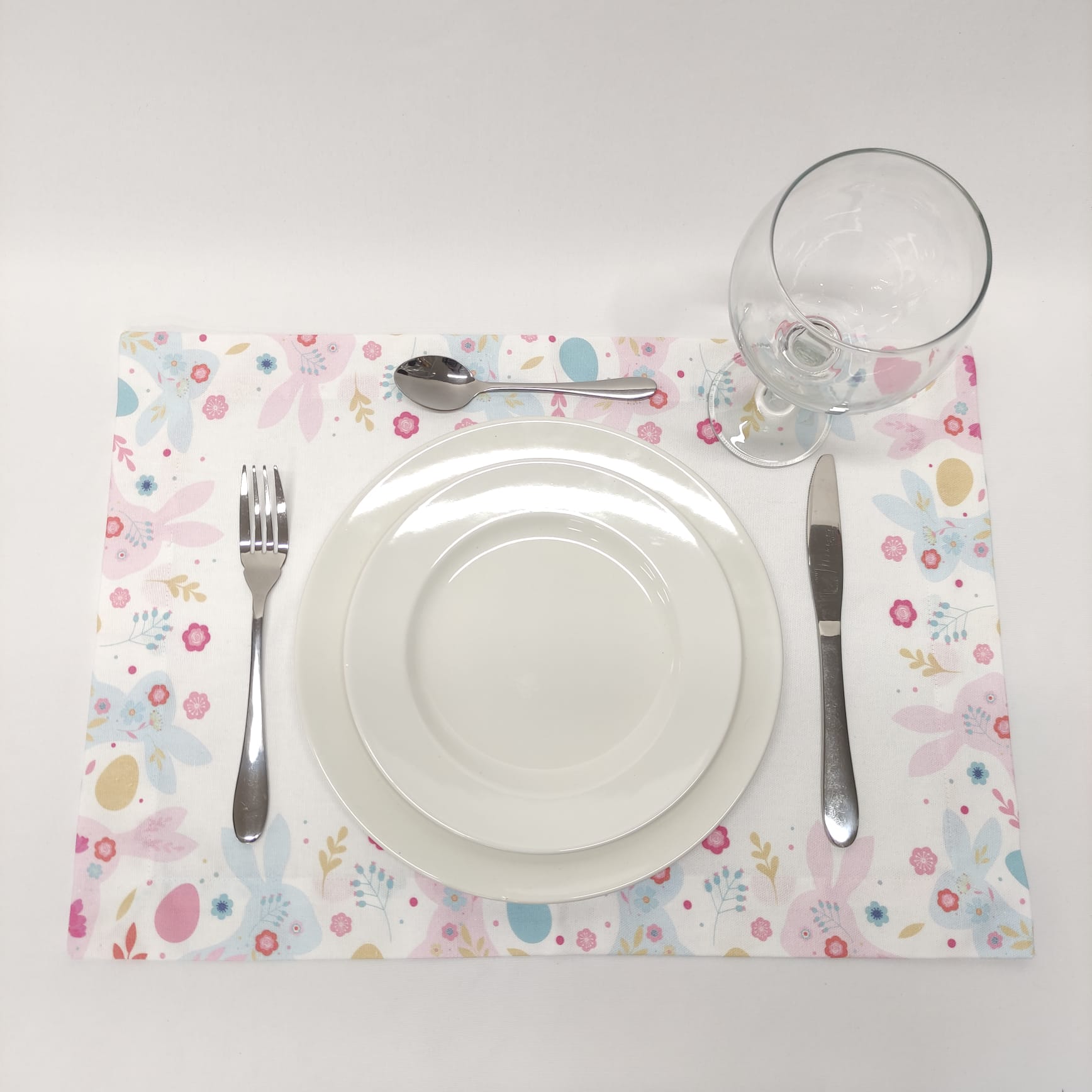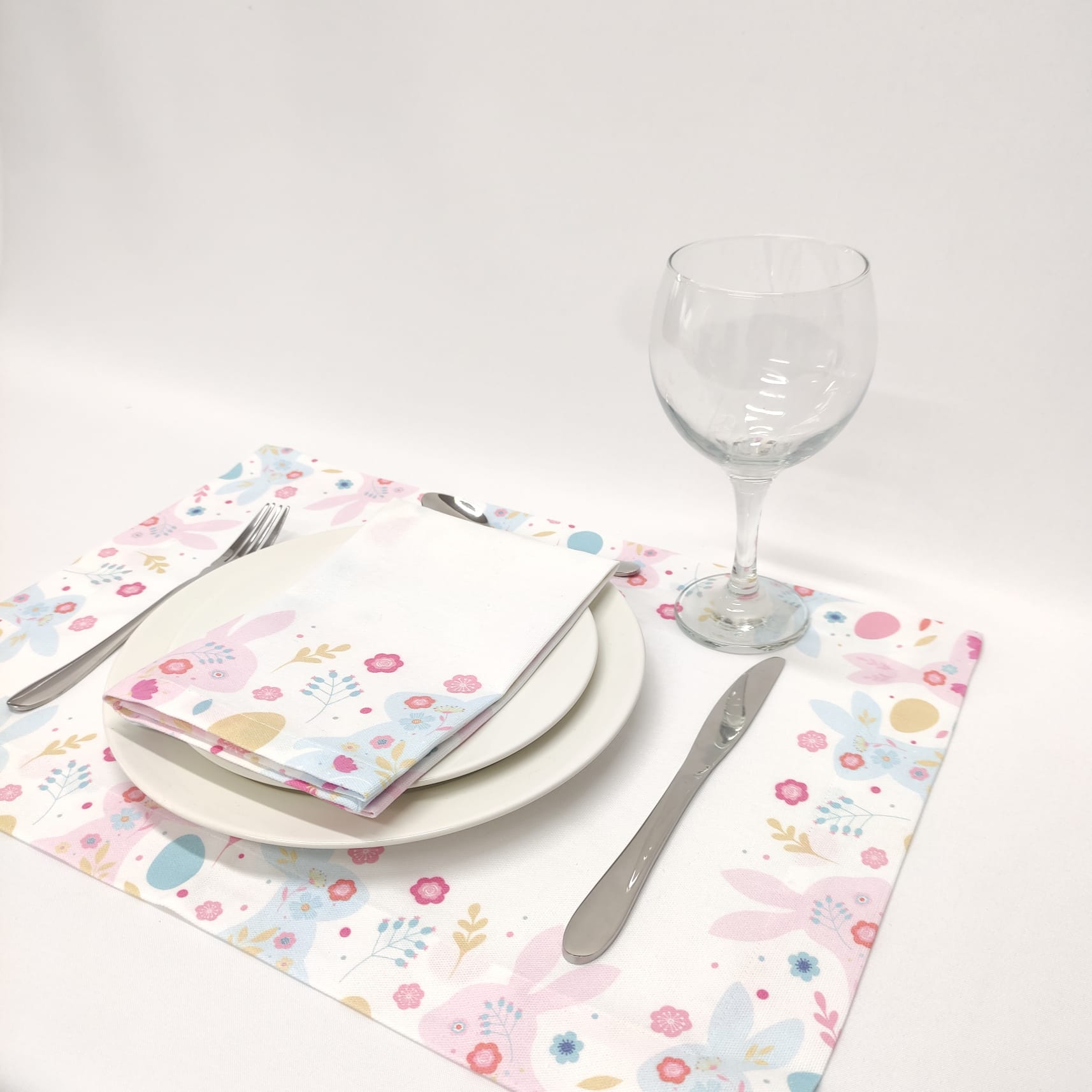 Individual de mesa, guardanapo e caminho de mesa em algodão com estampado Digital do Coelho da Páscoa.