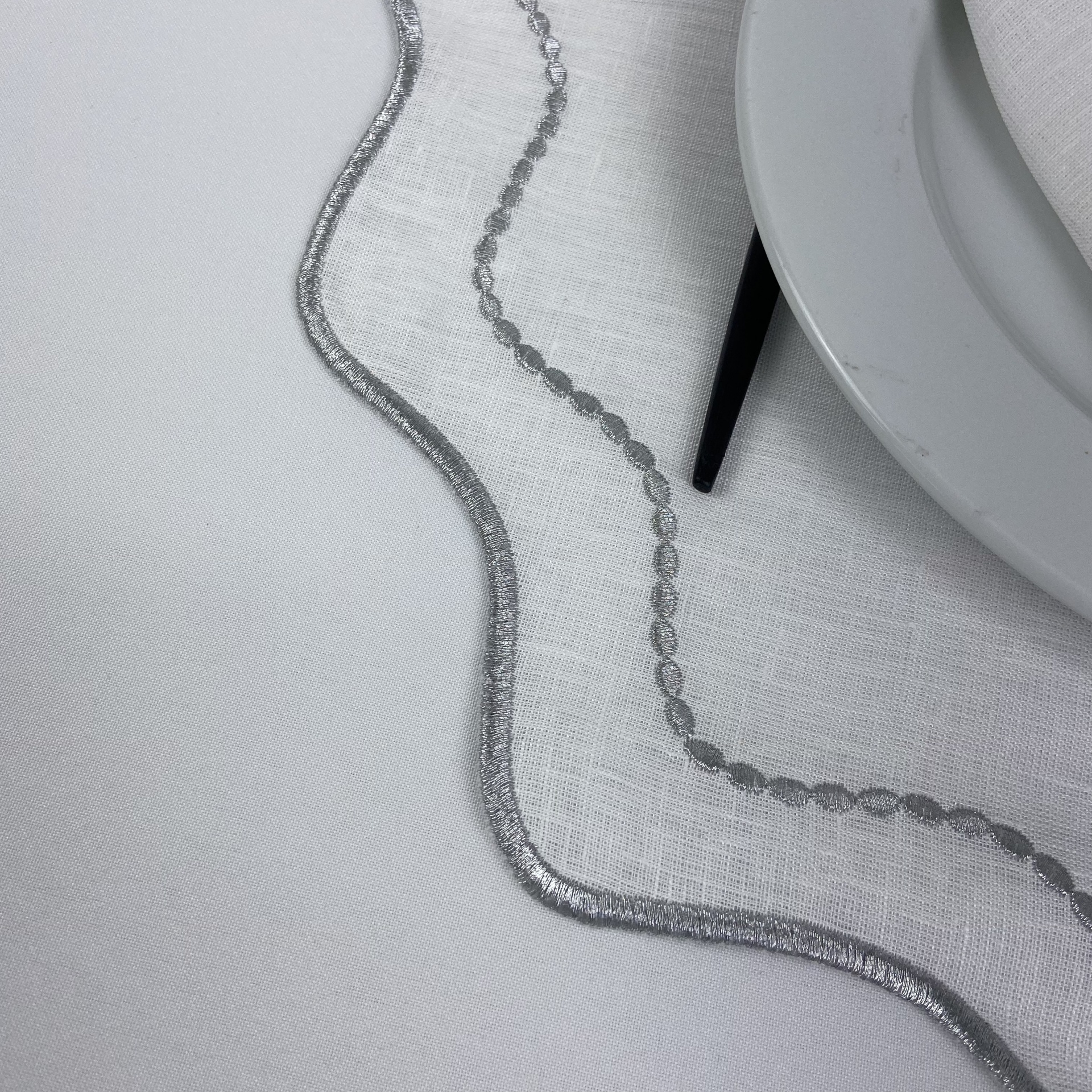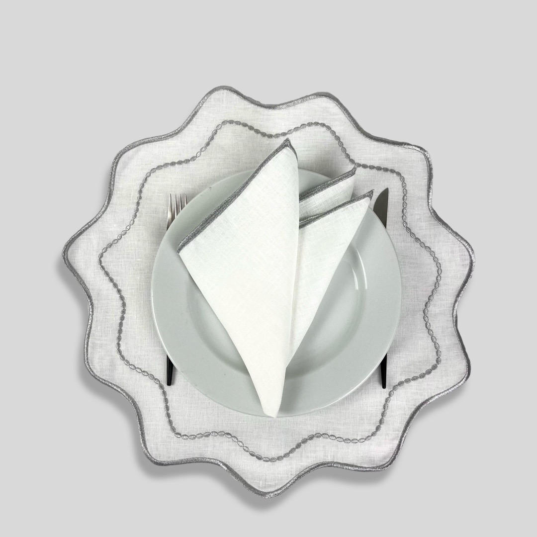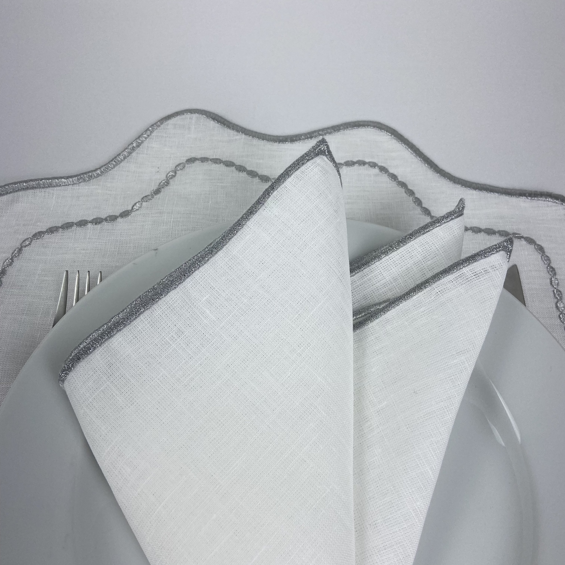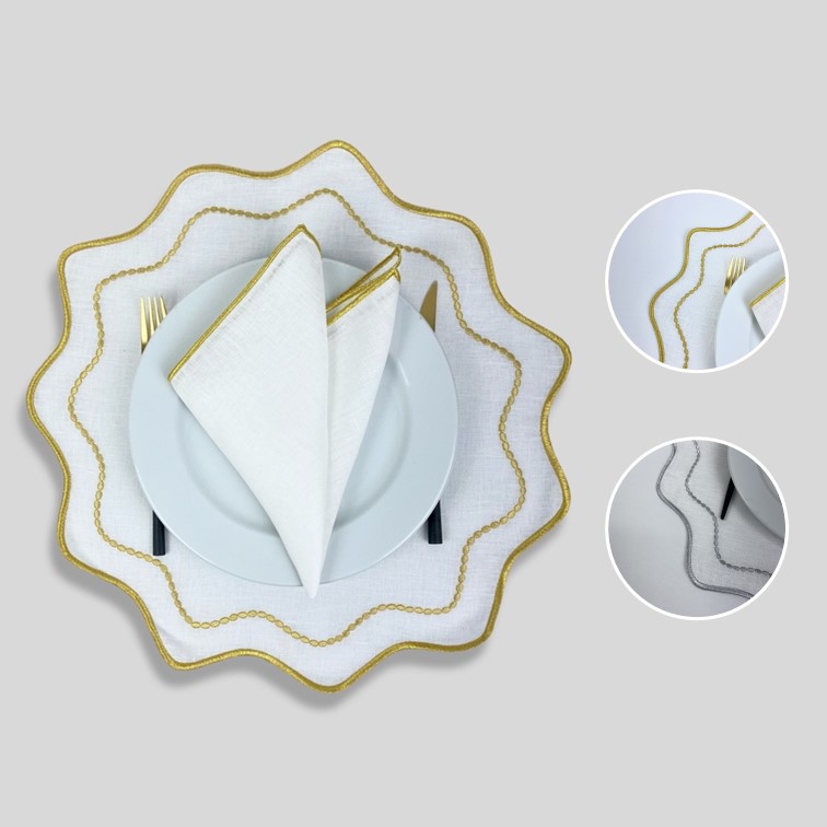 Individual e guardanapo de Linho branco, com acabamento de rolinho brilhante na cor dourada ou prateado. Estilo muito clássico e festivo.