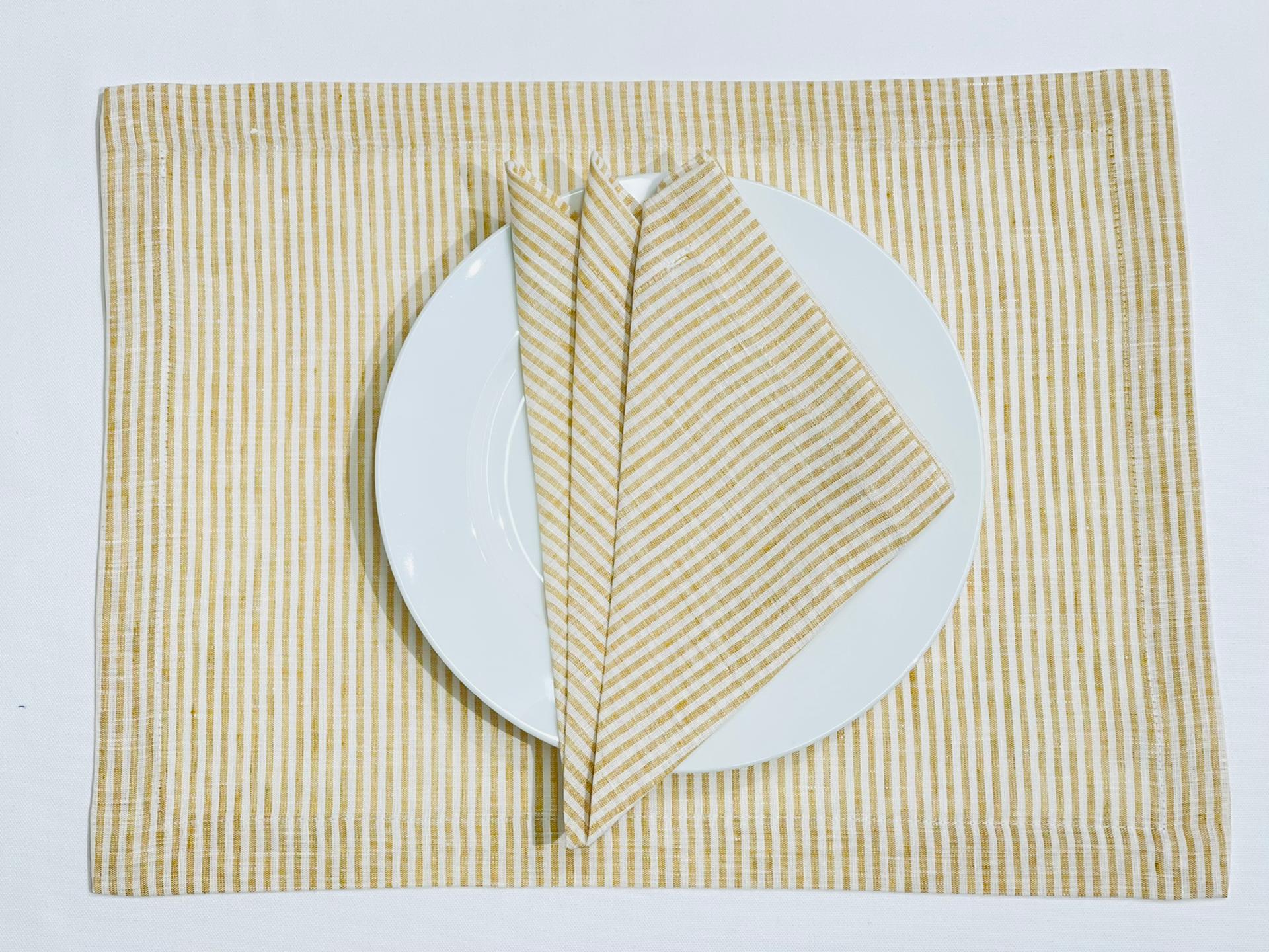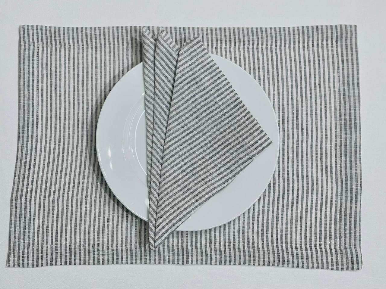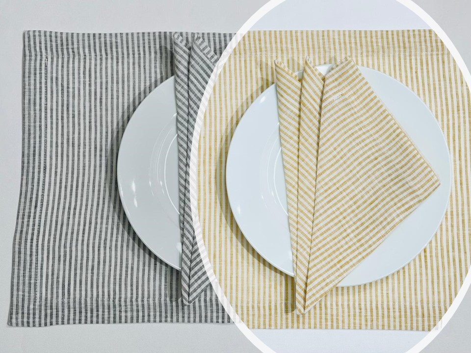 Individual de mesa e guardanapo em linho padrão riscas, acabamento de bainha inglesa. Disponivel em tom de bege e cinza.