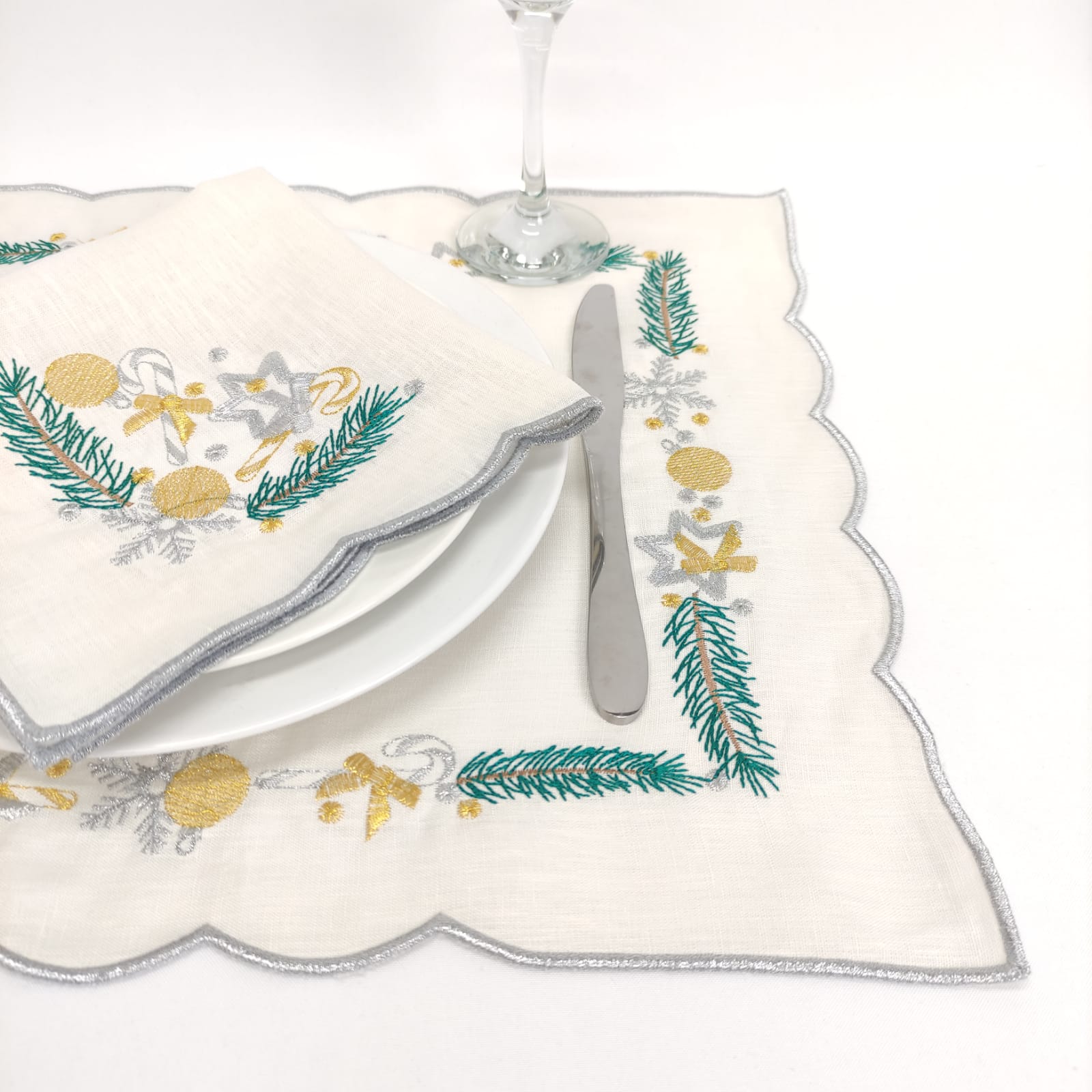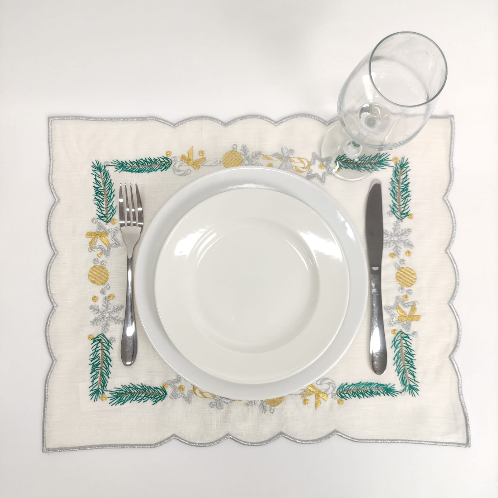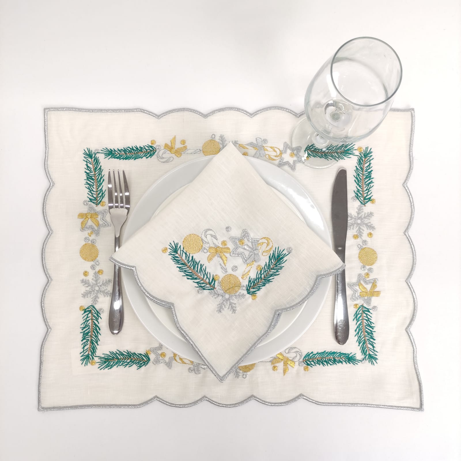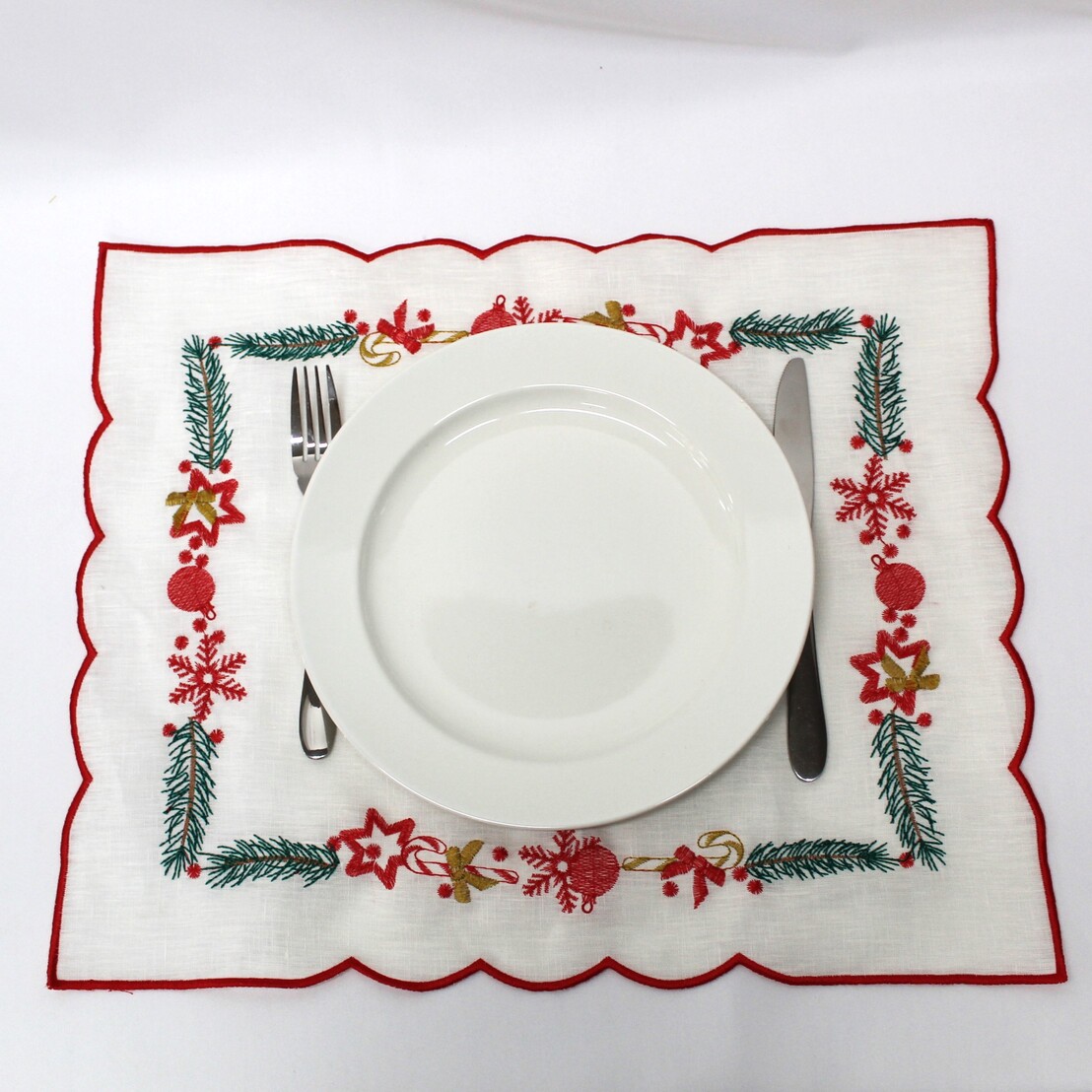 Individual em linho pérola, com detalhes bordados e acabamento em rolinho. Ideal para a epóca natalina.