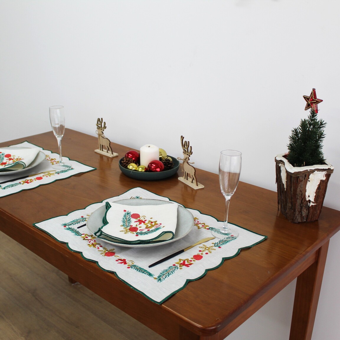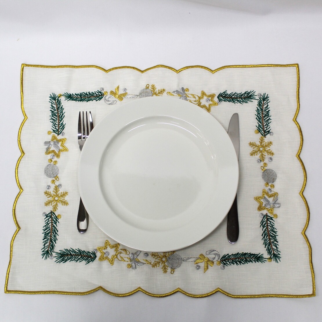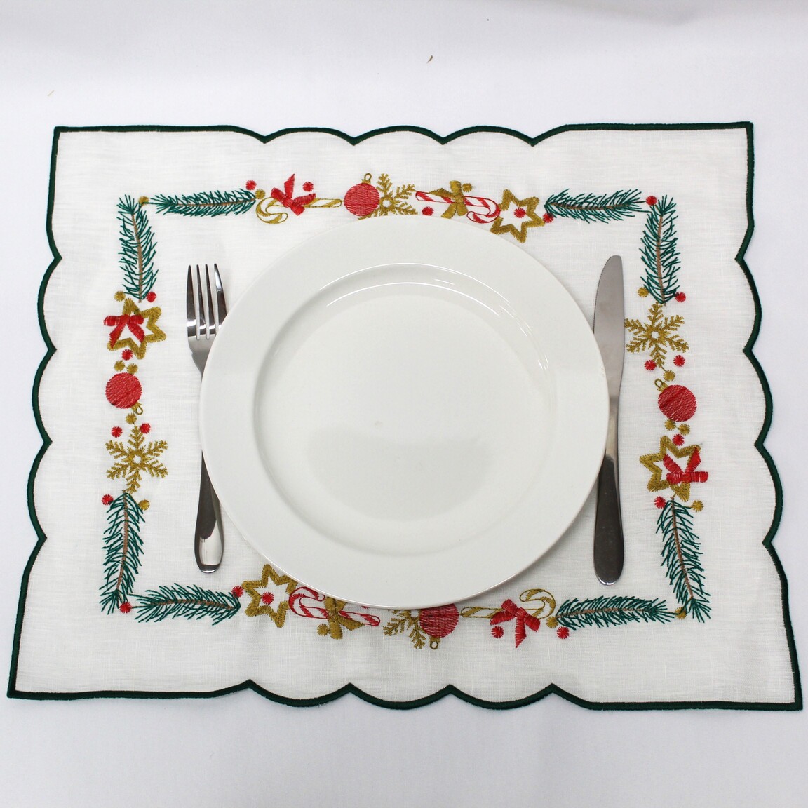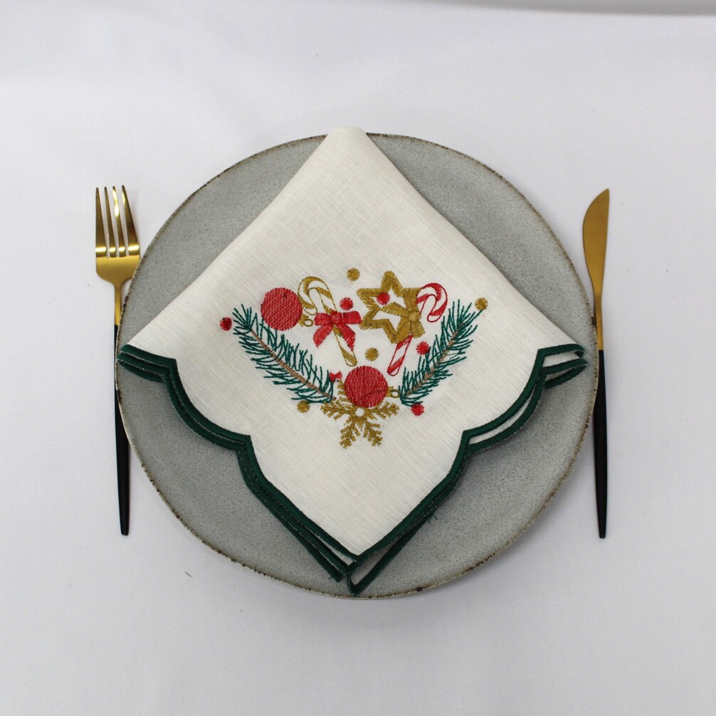 Individual em linho pérola, com detalhes bordados e acabamento em rolinho. Ideal para a epóca natalina.
