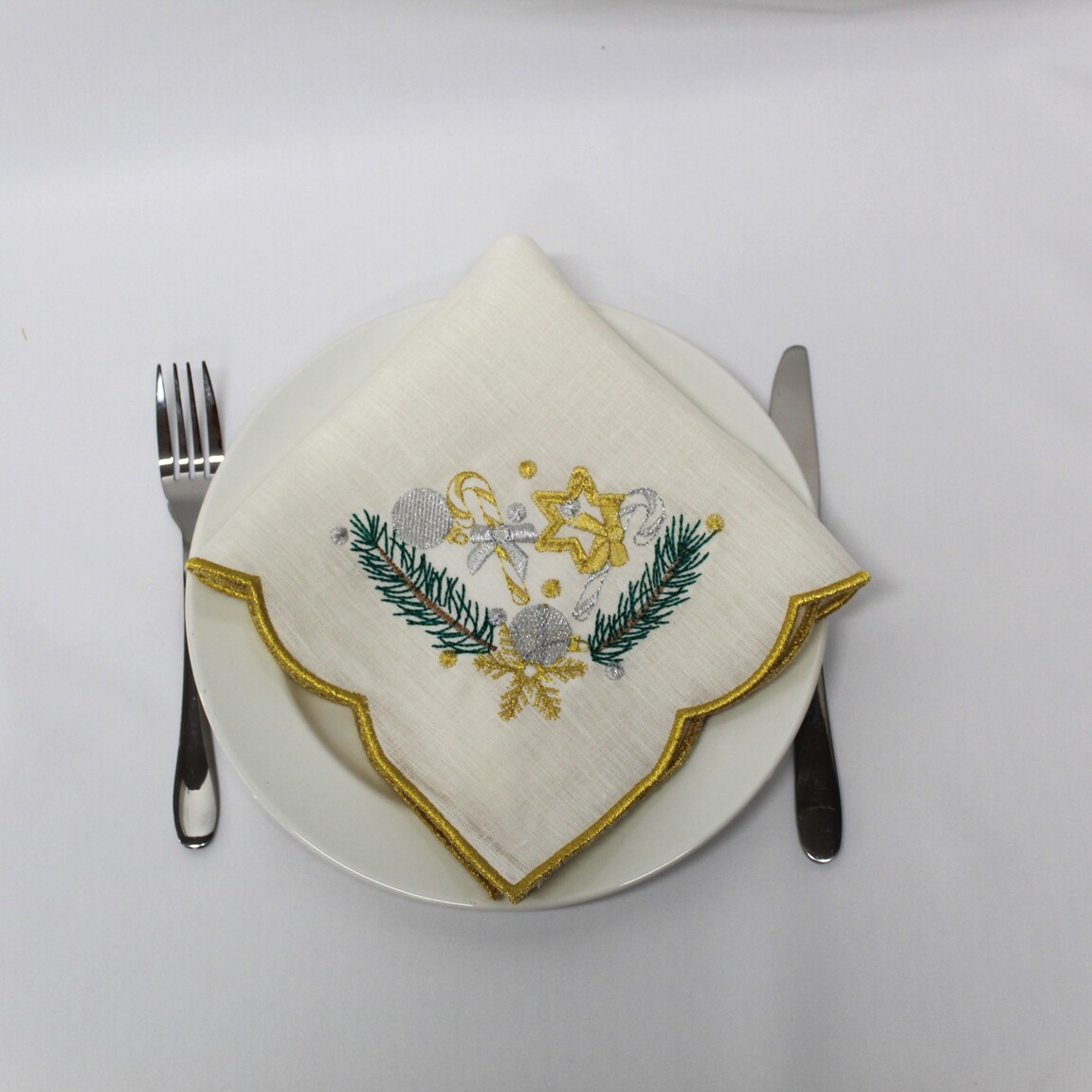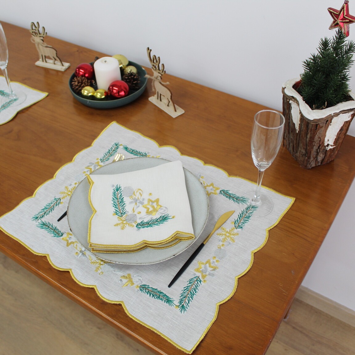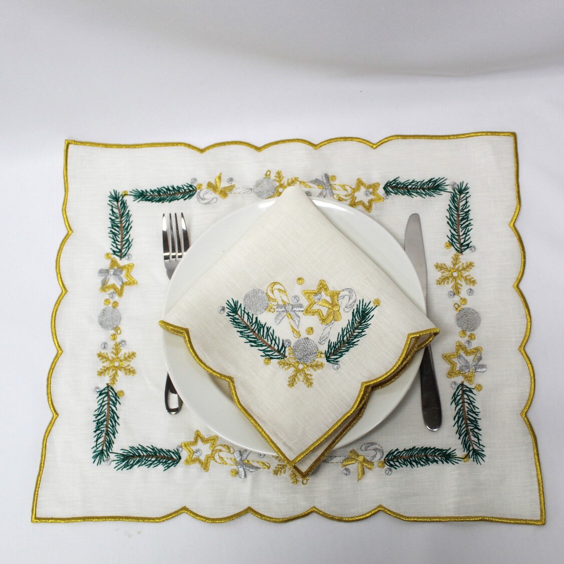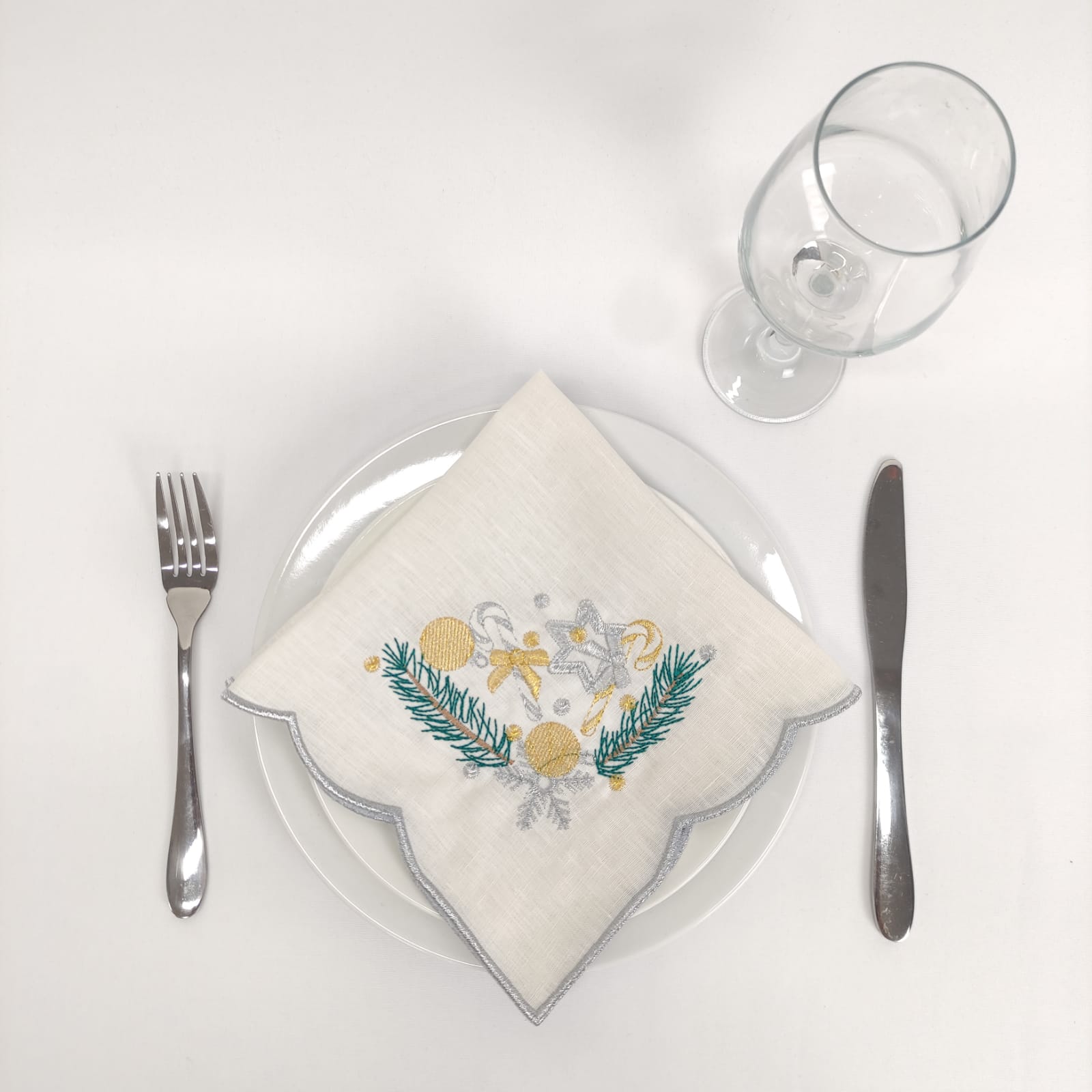 Individual em linho pérola, com detalhes bordados e acabamento em rolinho. Ideal para a epóca natalina.