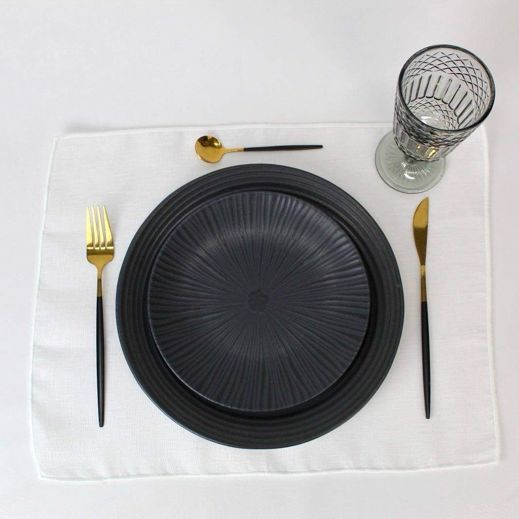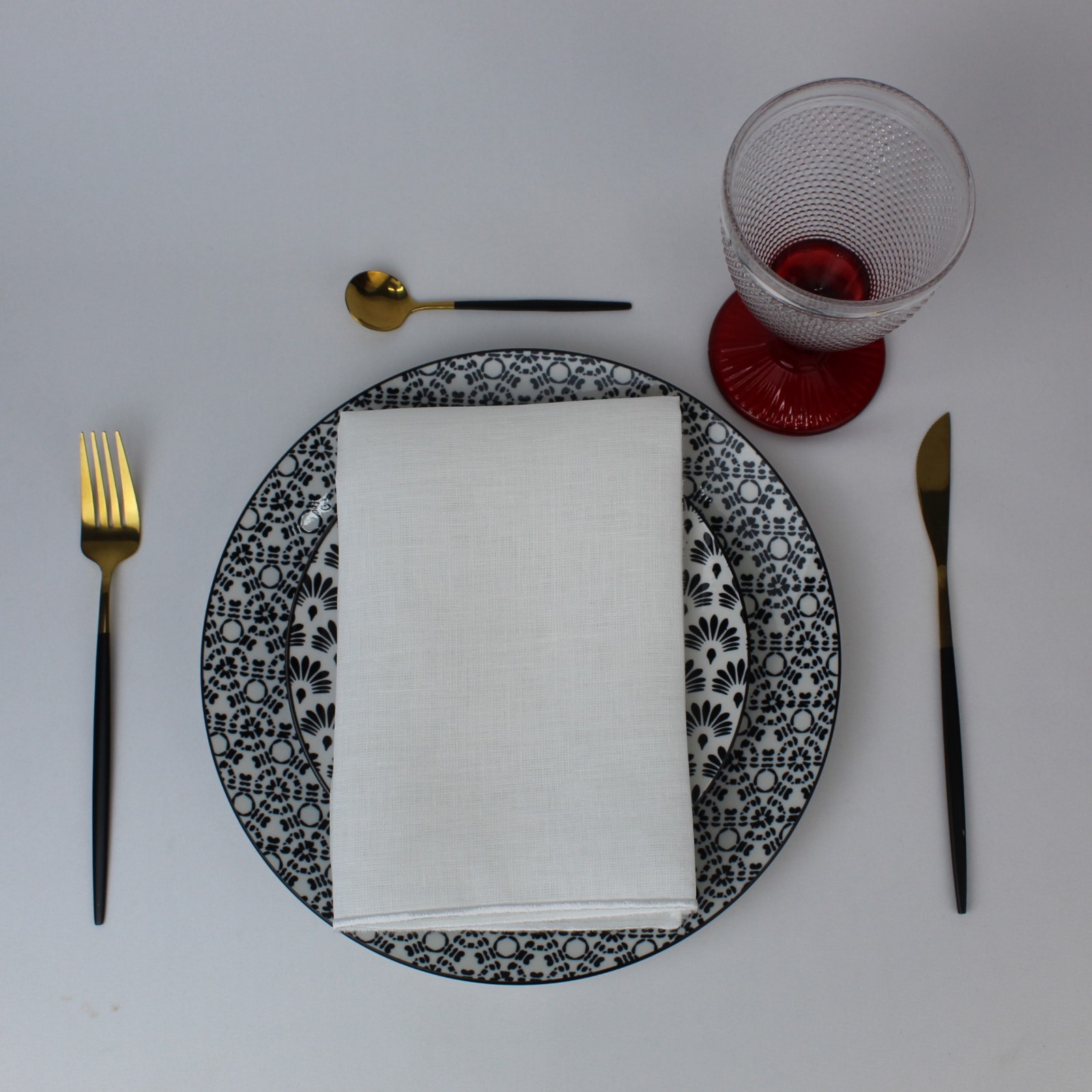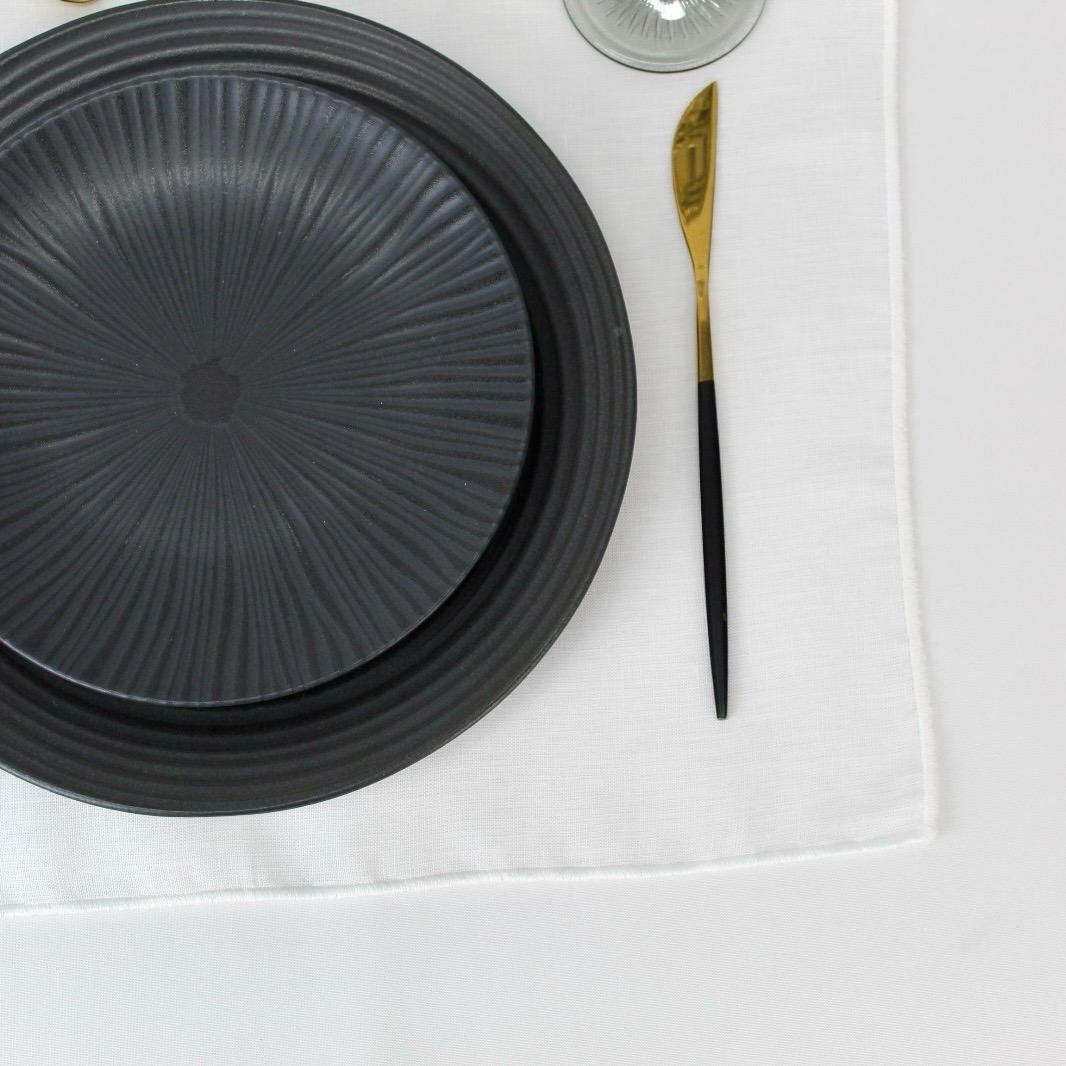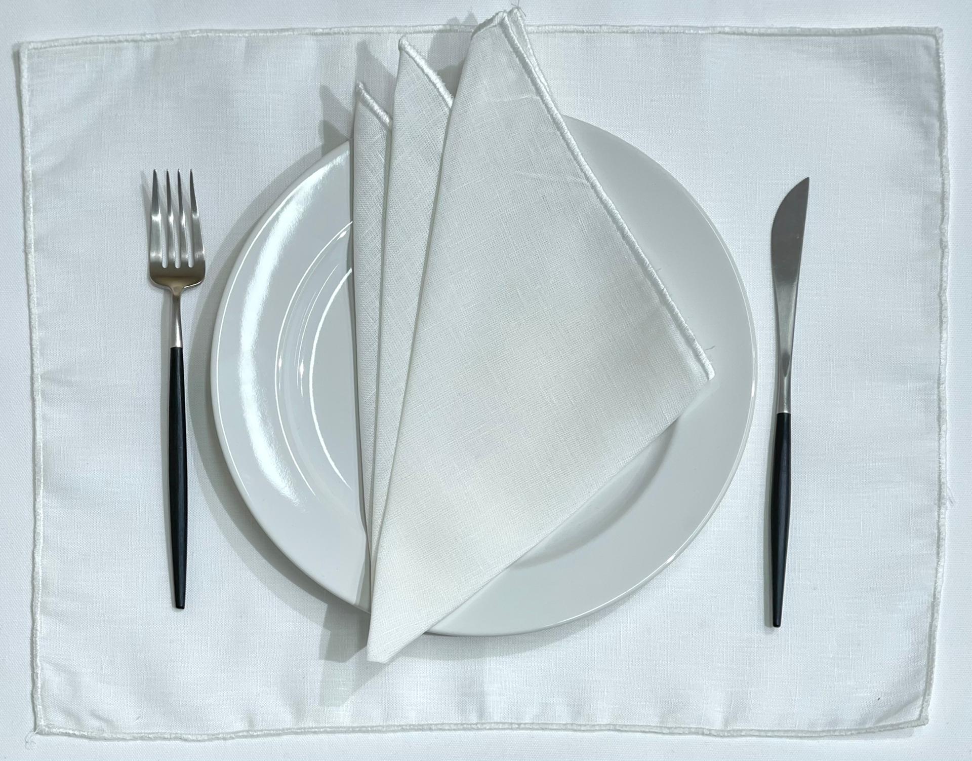 Guardanapo e individual de mesa em linho branco com acabamento em rolinho branco/pérola.
