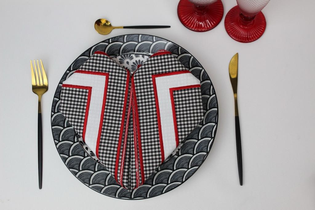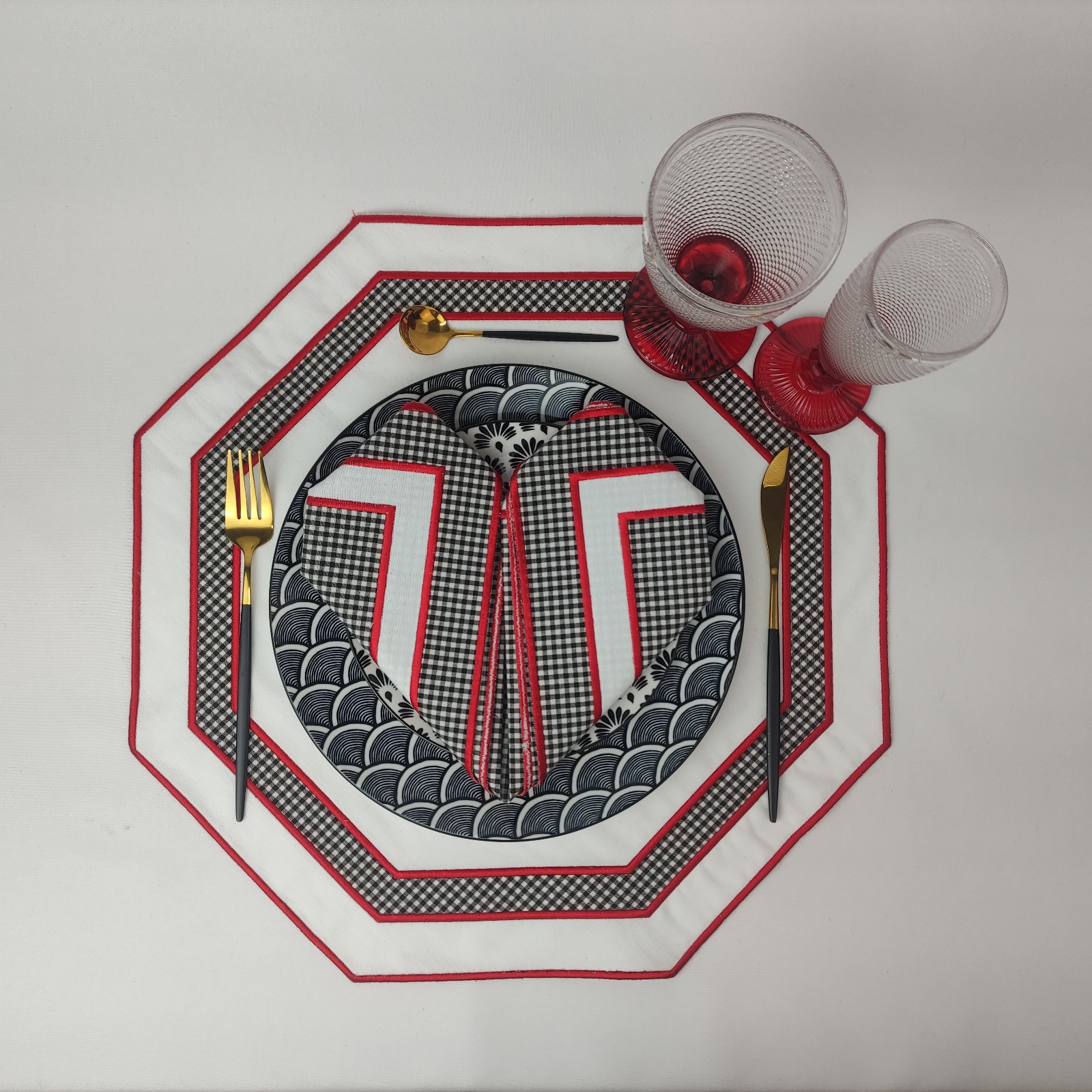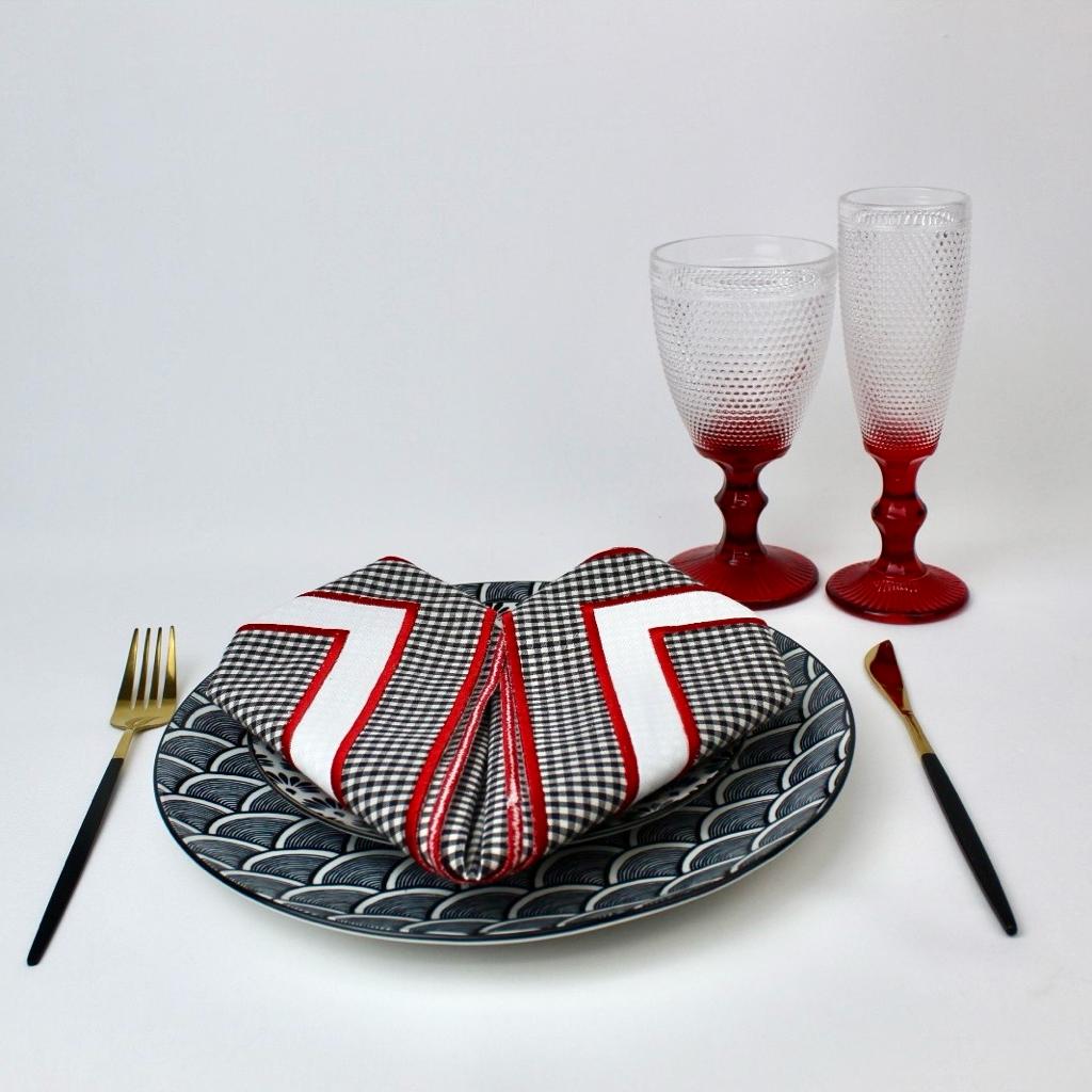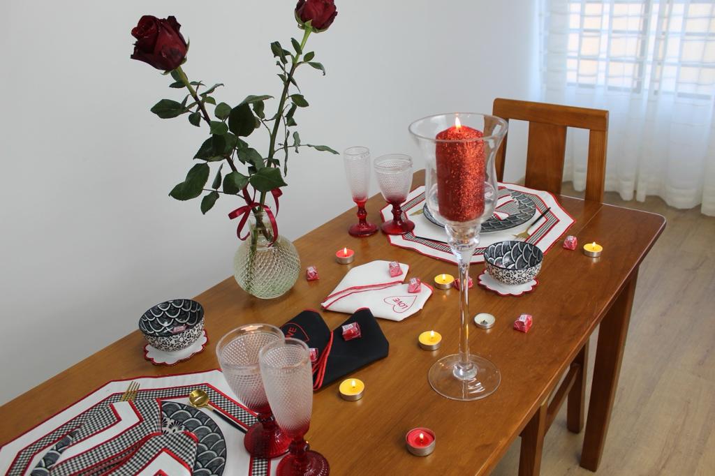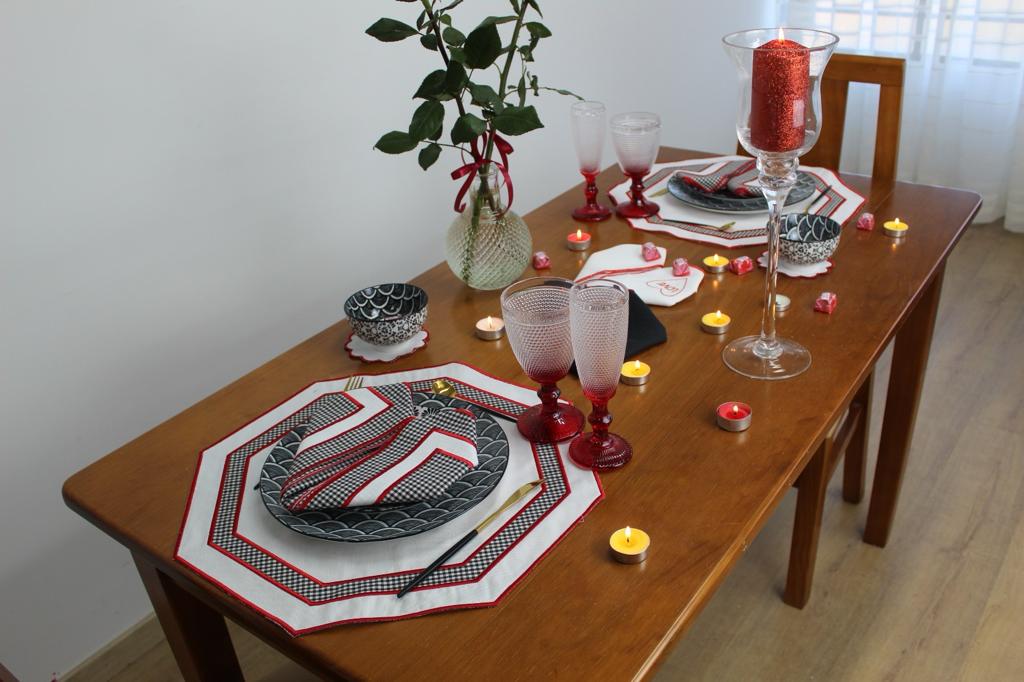 Individual e guardanapo em linho branco, com detalhe de 3 rolinhos e aplicação. Ideal para o dia dos namorados.