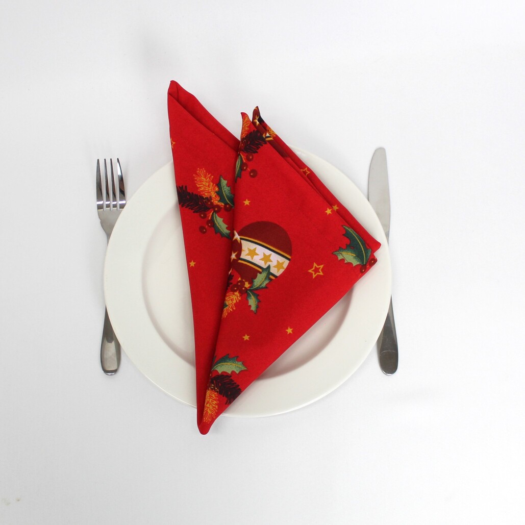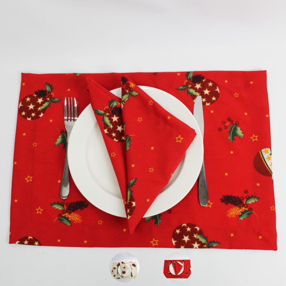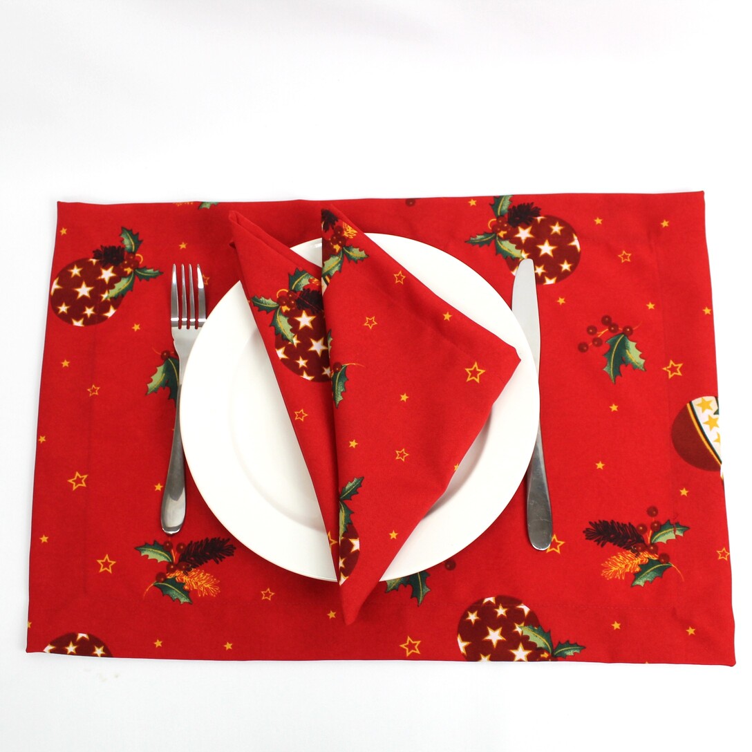 Coleção Natalicia, disponivel em individual, guardanapo e caminho de mesa. Tecido estampado de bolas de natal e estrelas com acabamento de bainha inglesa.