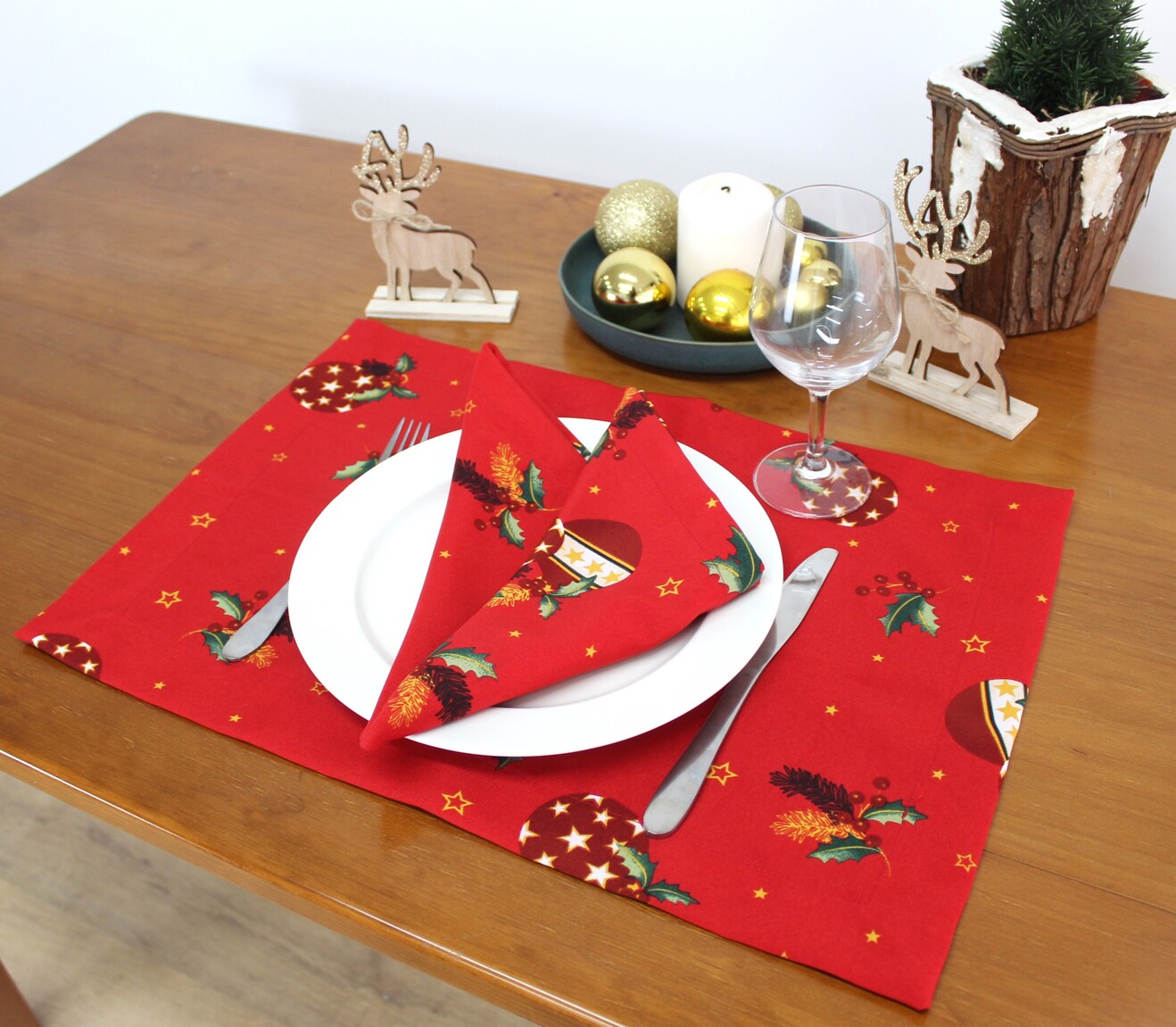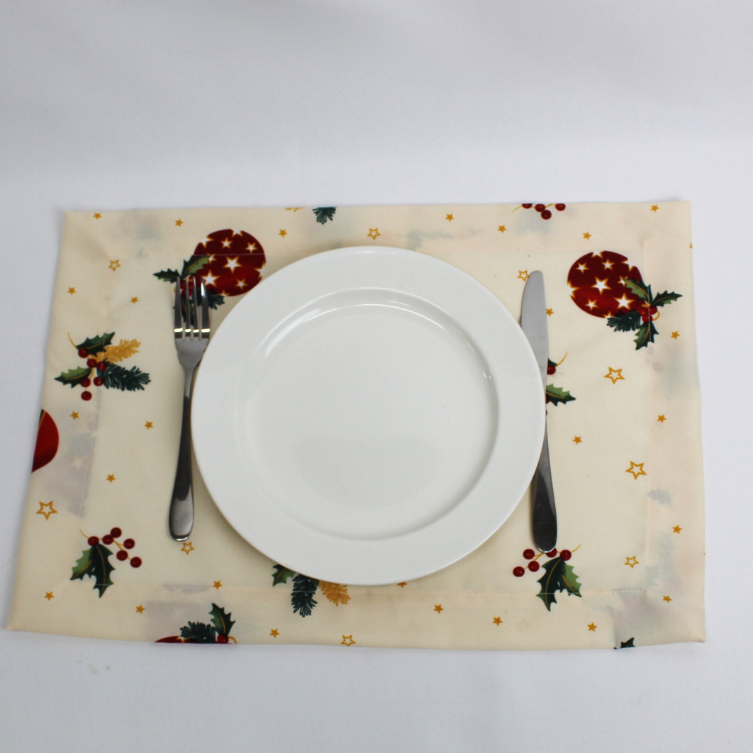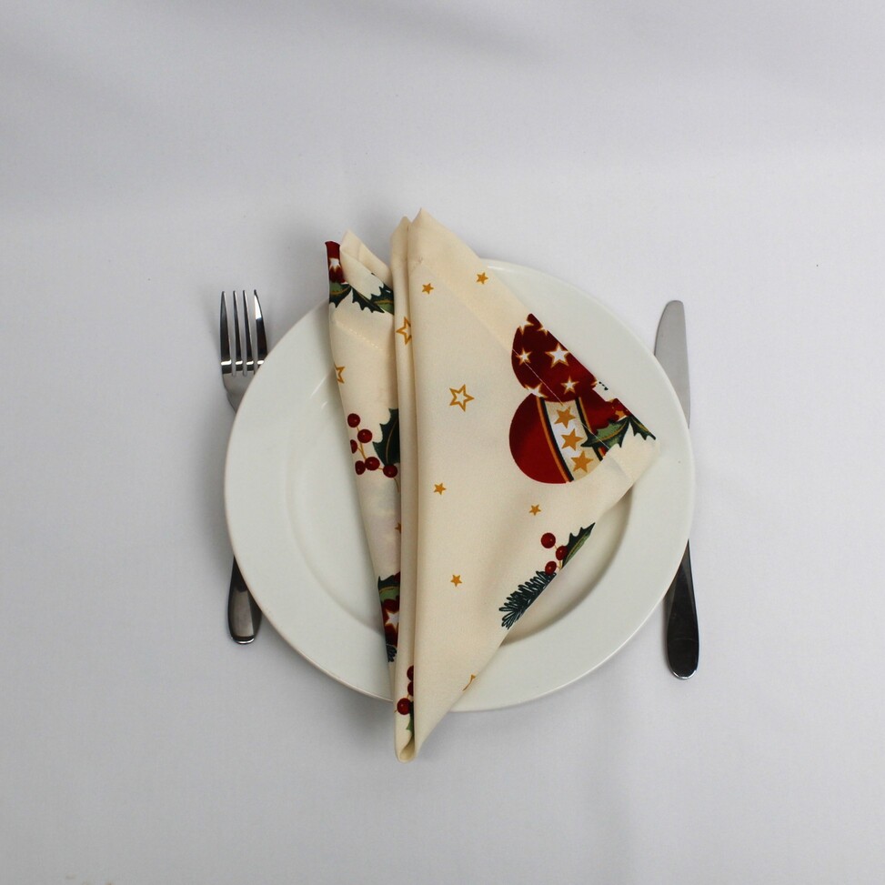 Coleção Natalicia, disponivel em individual, guardanapo e caminho de mesa. Tecido estampado de bolas de natal e estrelas com acabamento de bainha inglesa.