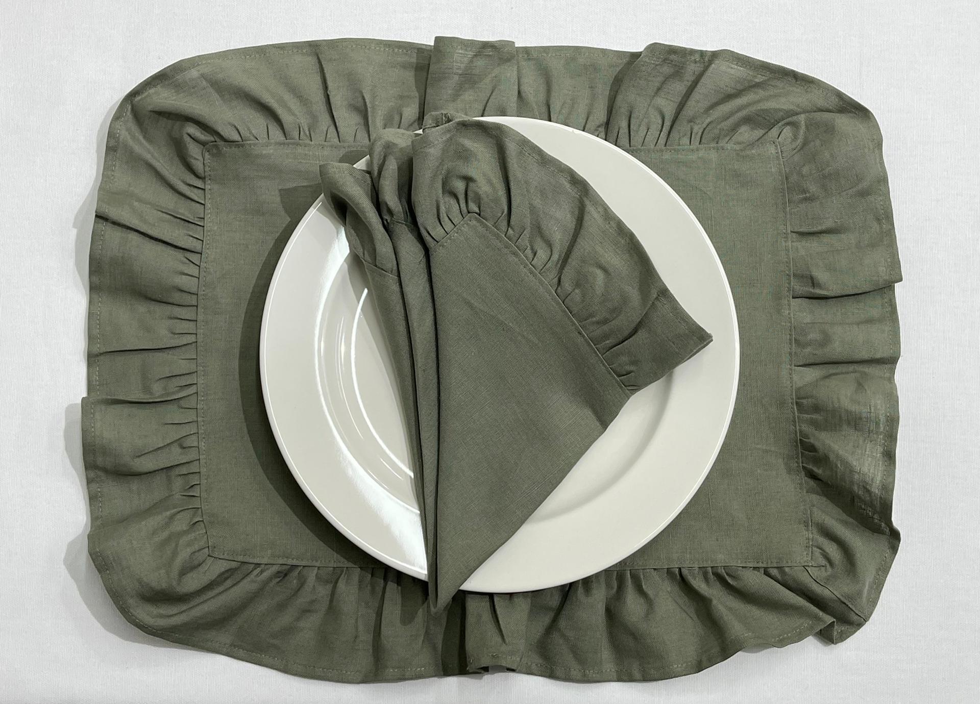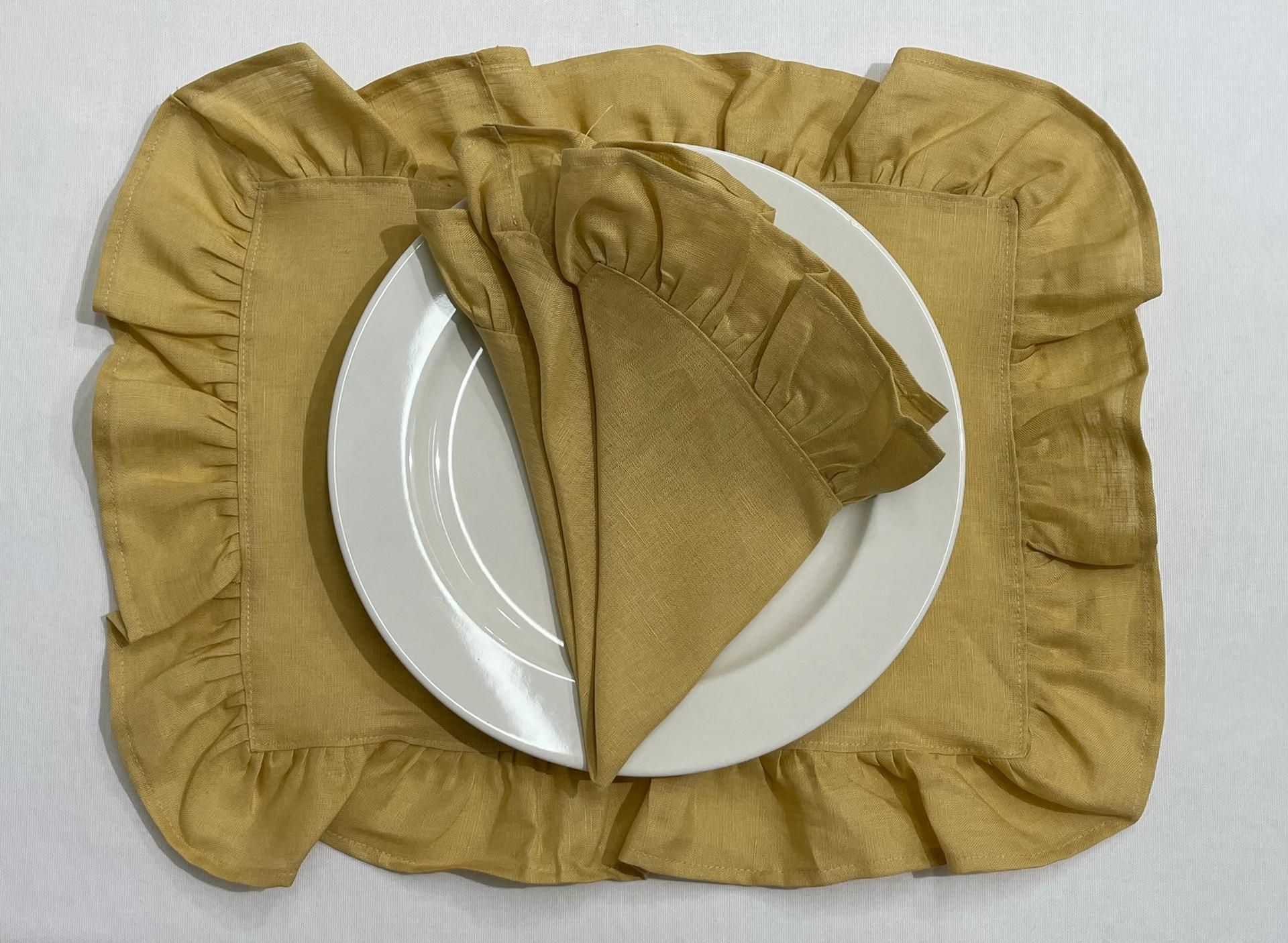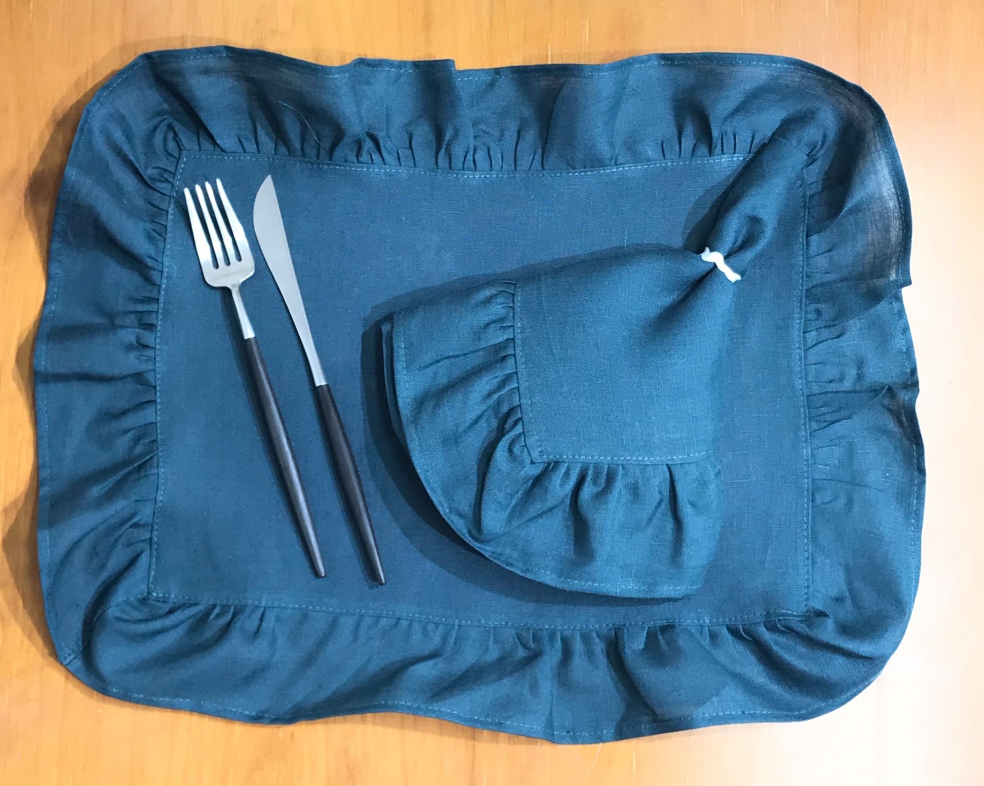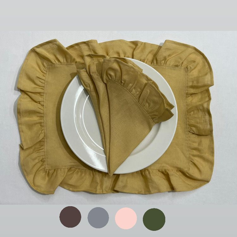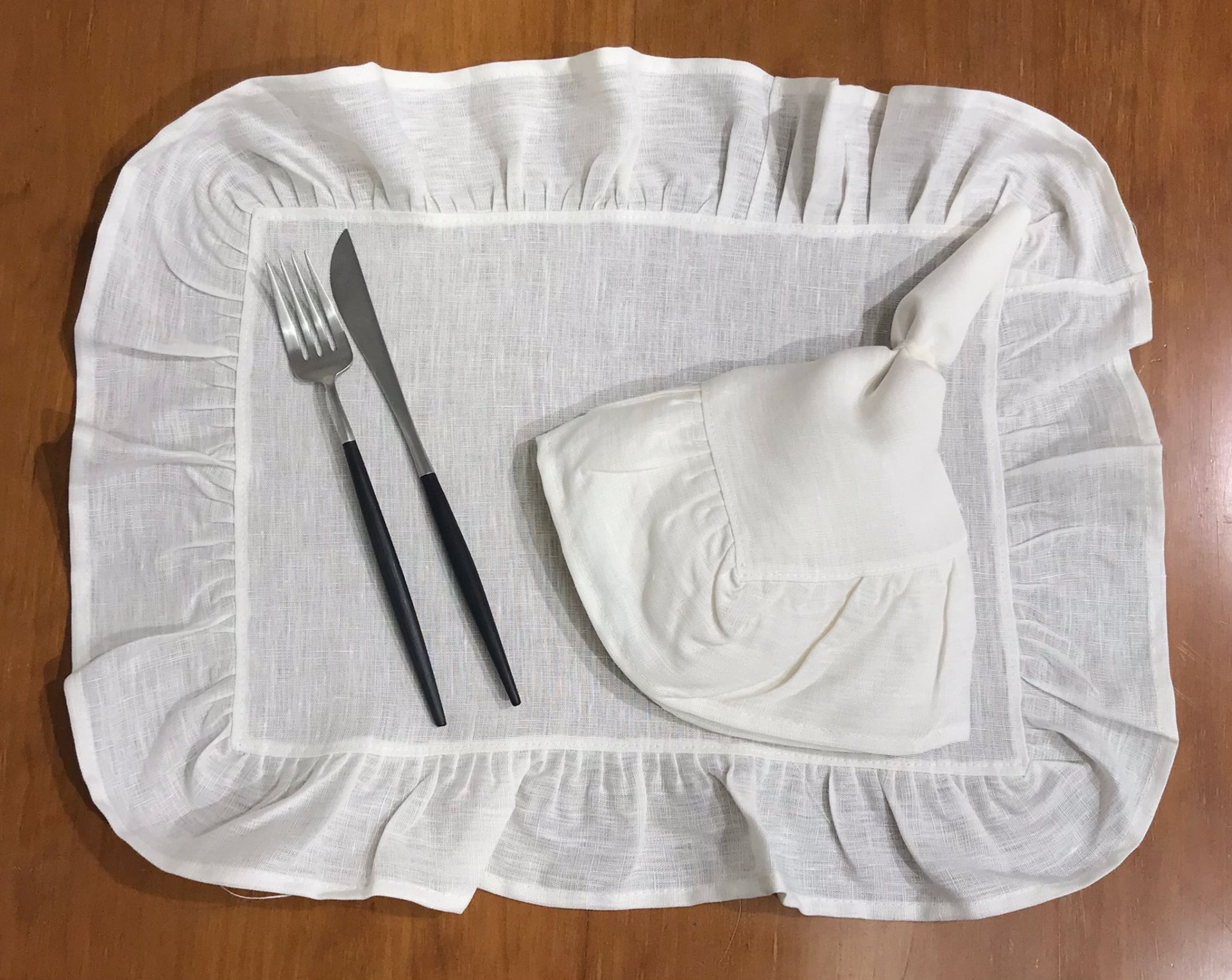 Individual de mesa , guardanapo e caminho de mesa em linho com aplicação de folho. Modelo elegante.