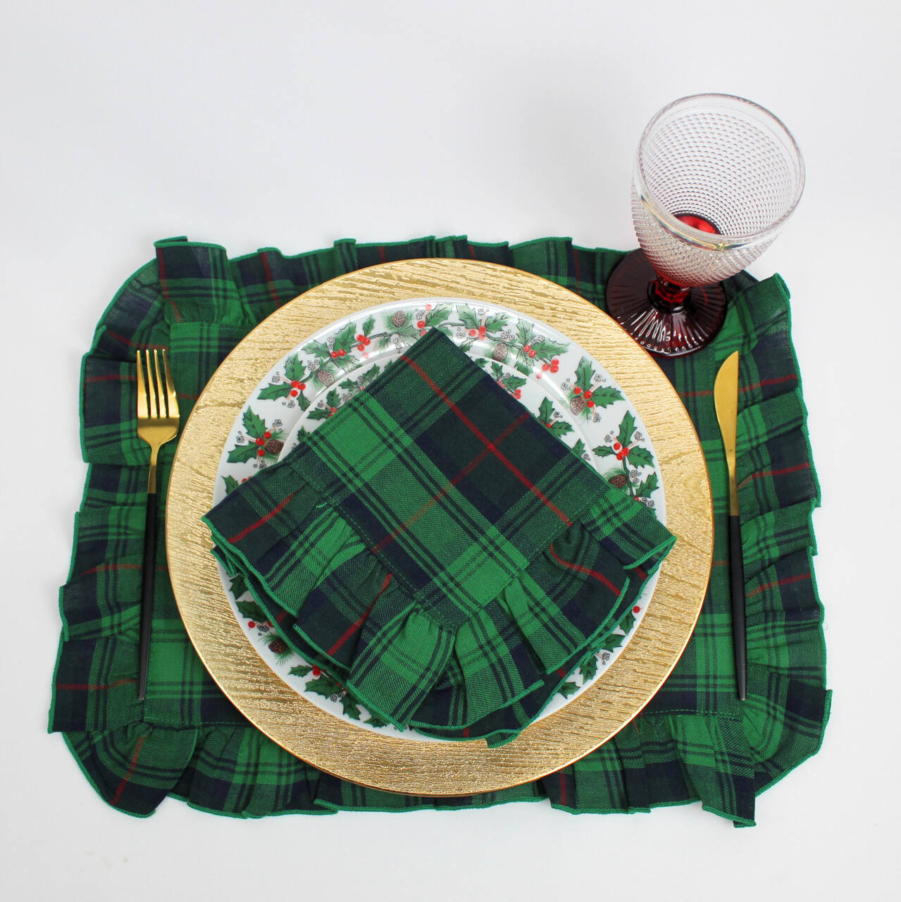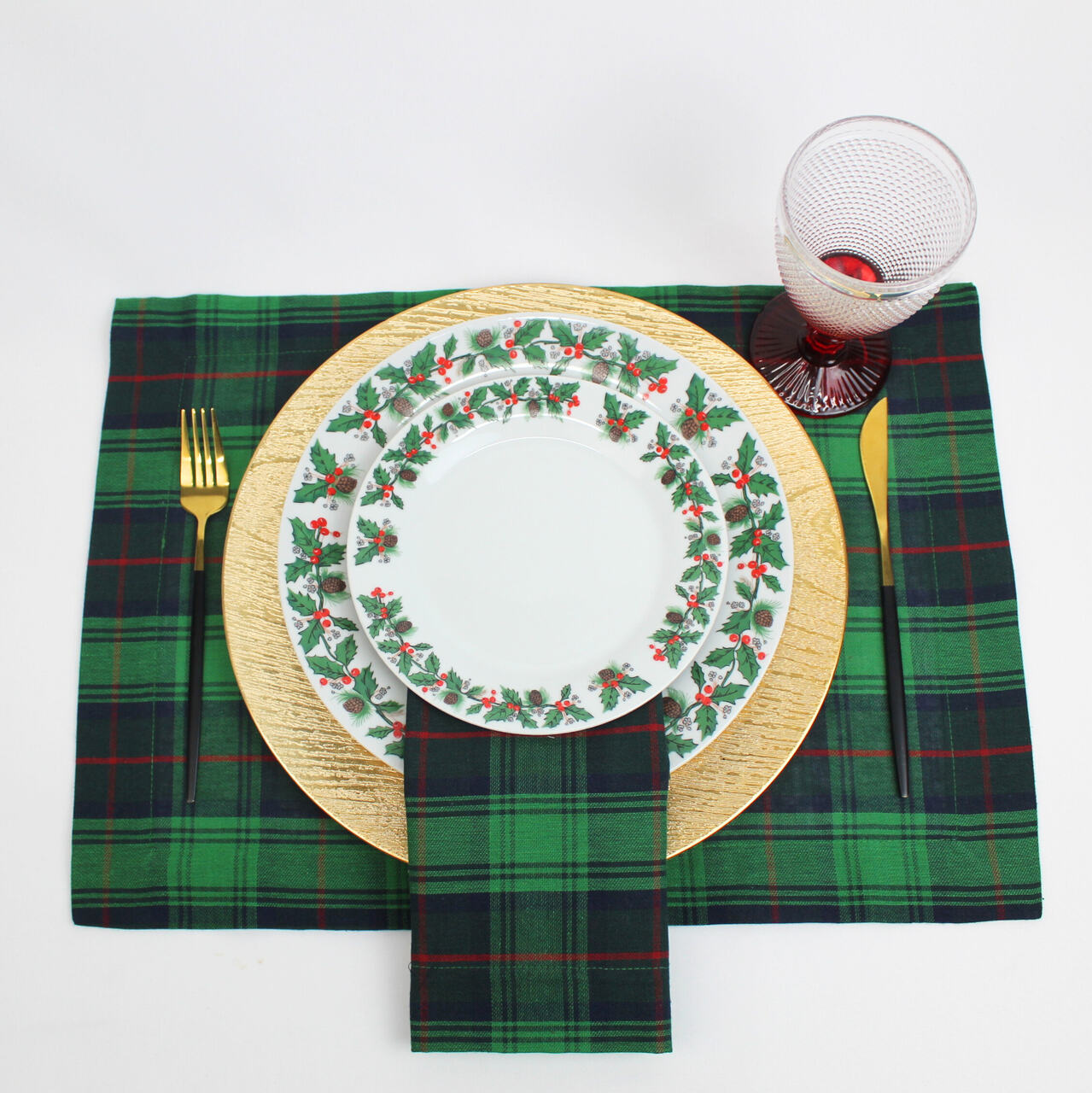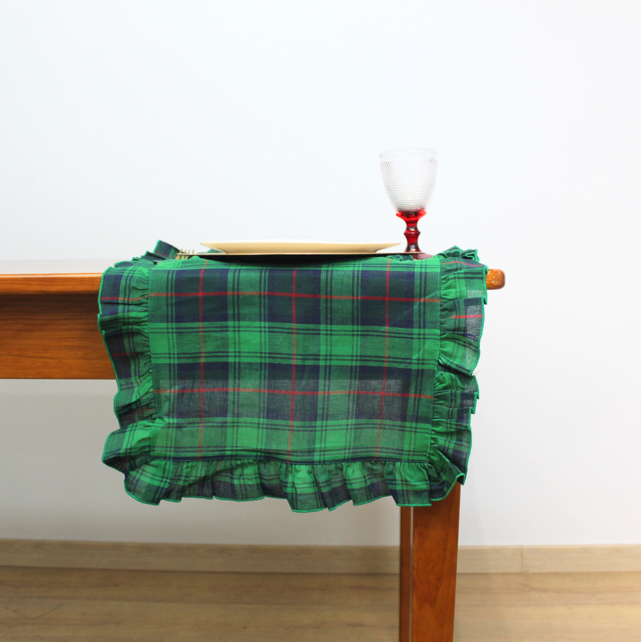 Coleção Natalicia, disponivel em individual, guardanapo e caminho de mesa. Tecido com quadrados nas seguintes cores: azul, vermelho e verde. Acabamento em bainha inglesa.