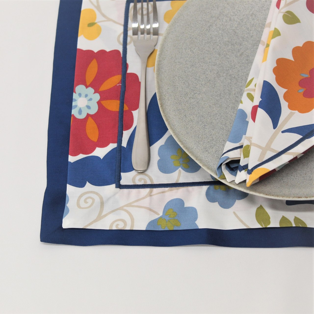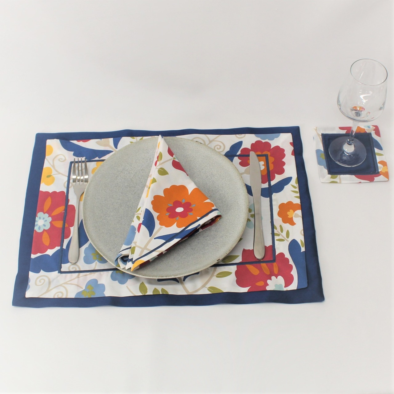 Individual, guardanapo e pousa copo/pousa pão em tecido Jacquard Estampado de flores e ramos. Tecido bastante colorido com cores fortes, modelo com acabamento de rolinho azul escuro.