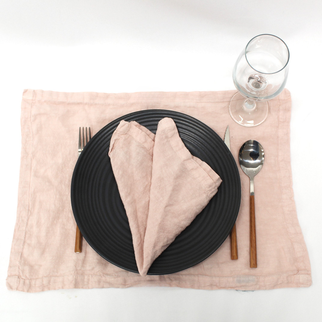 Individual e Guardanapo Lavado na cor rosa e bege. Modelo de bainha Inglesa.