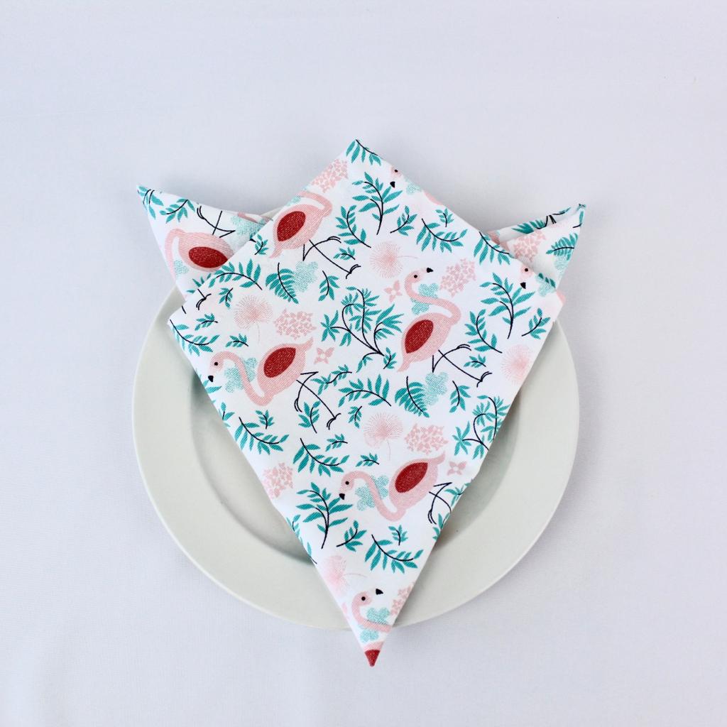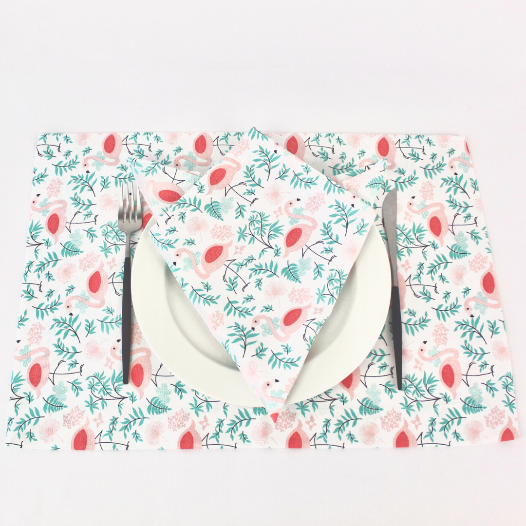 Individual de mesa e guardanapo em algodão com estampado  de Flamingos acabamento em bainha Inglesa.
