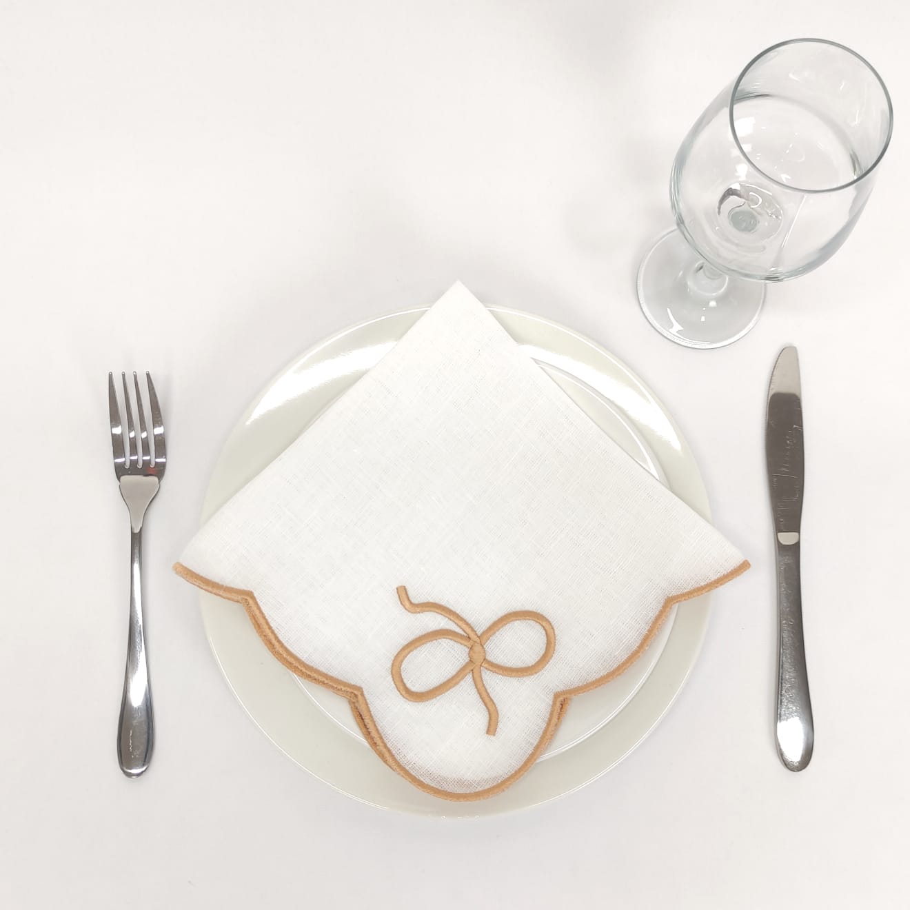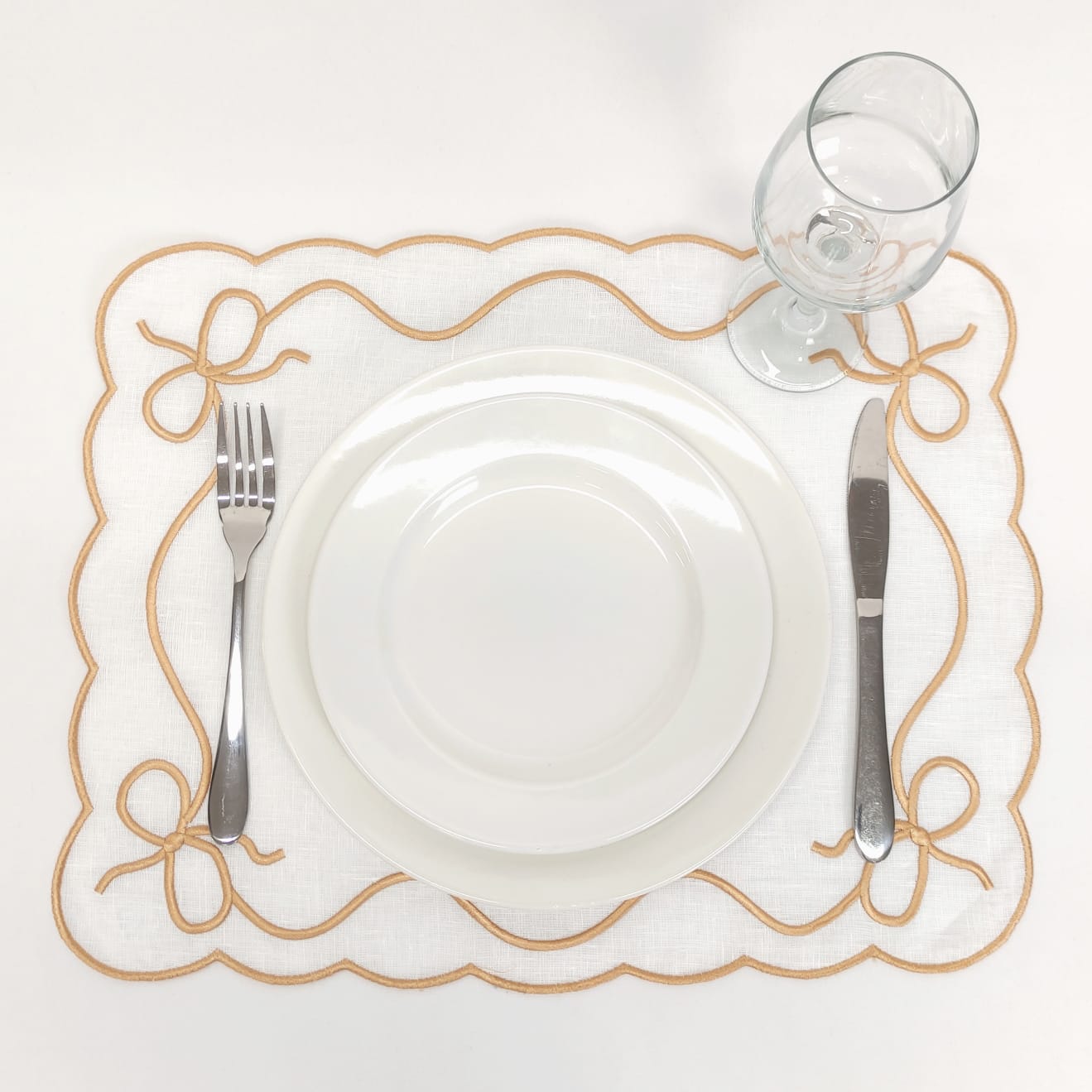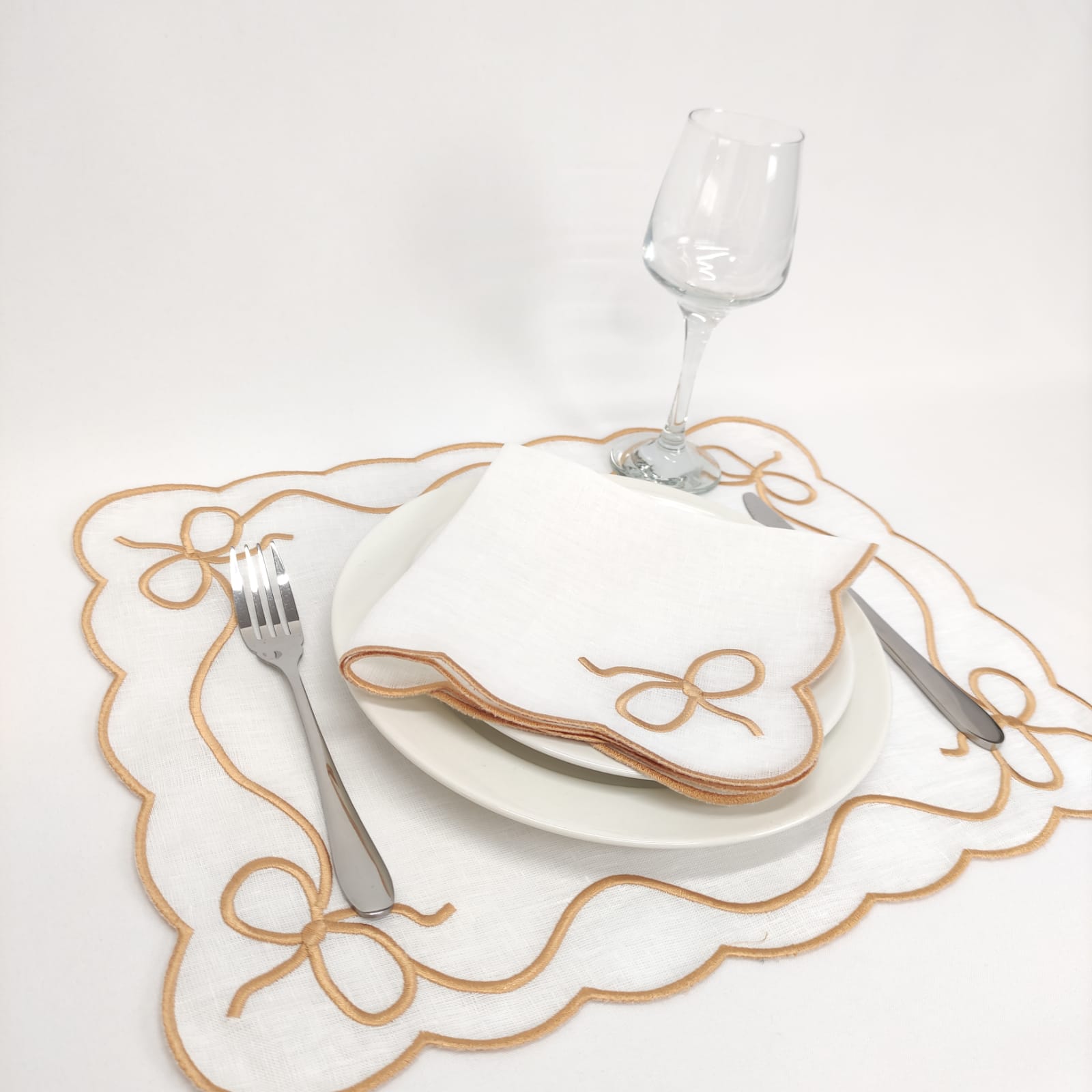 Individual de mesa e guardanapo em linho branco com detalhe bordado de laços em dourado.